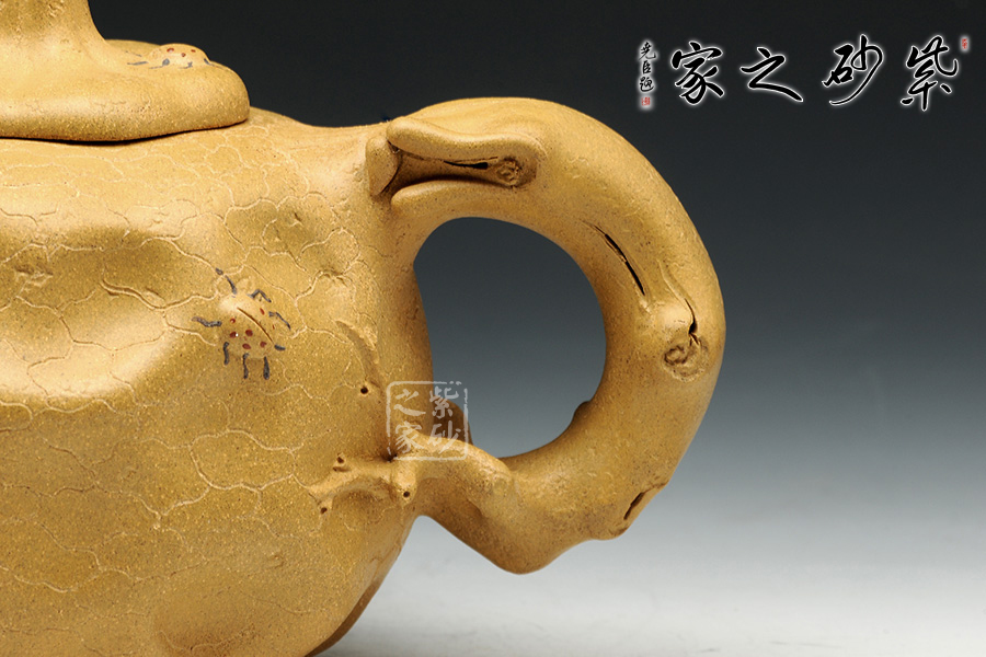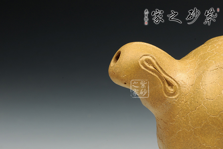 泥性:感甜嫩綿密,質(zhì)堅(jiān)而溫潤(rùn),呈近田黃色調(diào),為江蘇宜興趙莊山系朱泥礦~黃石黃之共生礦,經(jīng)挑揀練製而成,因含鐵量只達(dá)6%左右,致陶之后呈“金田黃色”。