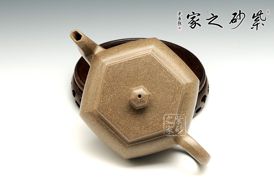 整器壺身主體由六面組合而成,壺肩處方中見曲,過渡自然。大大的壺蓋與壺身契合嚴密,與壺身遙相呼應。壺鈕取圓舍方,圓中見方,便于拿捏。壺把自然諧和,如凌空之羽,頓添靈動。壺嘴自壺體自然胥出,六方棱形成的彎壺嘴,分外難得。壺把、壺蓋、壺嘴三點一線,實為點線面的完美結合。壺底以平方形支撐整個壺體,更顯穩(wěn)實厚重。