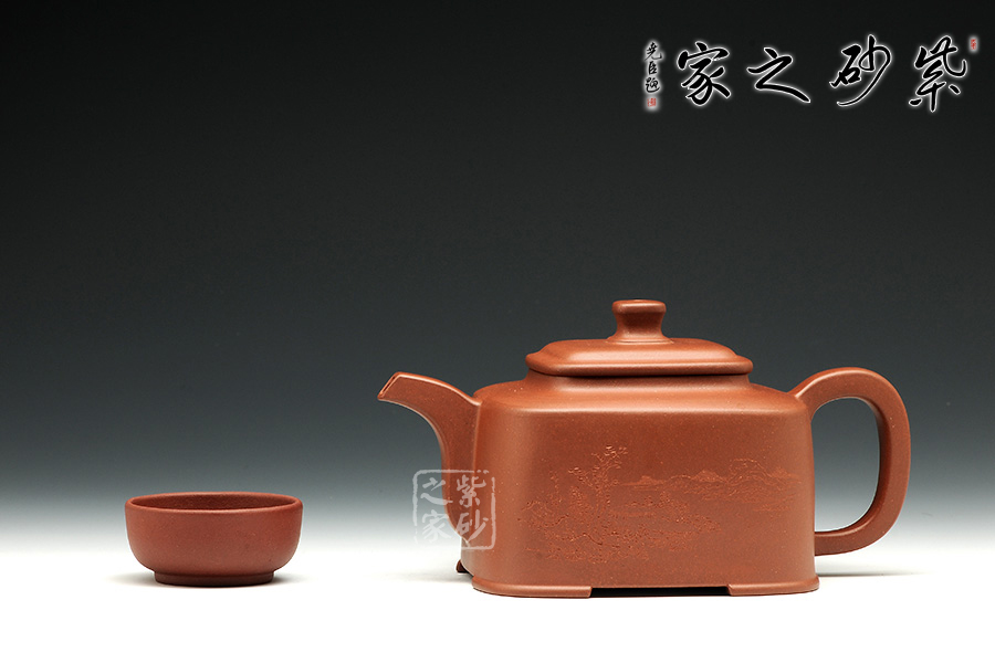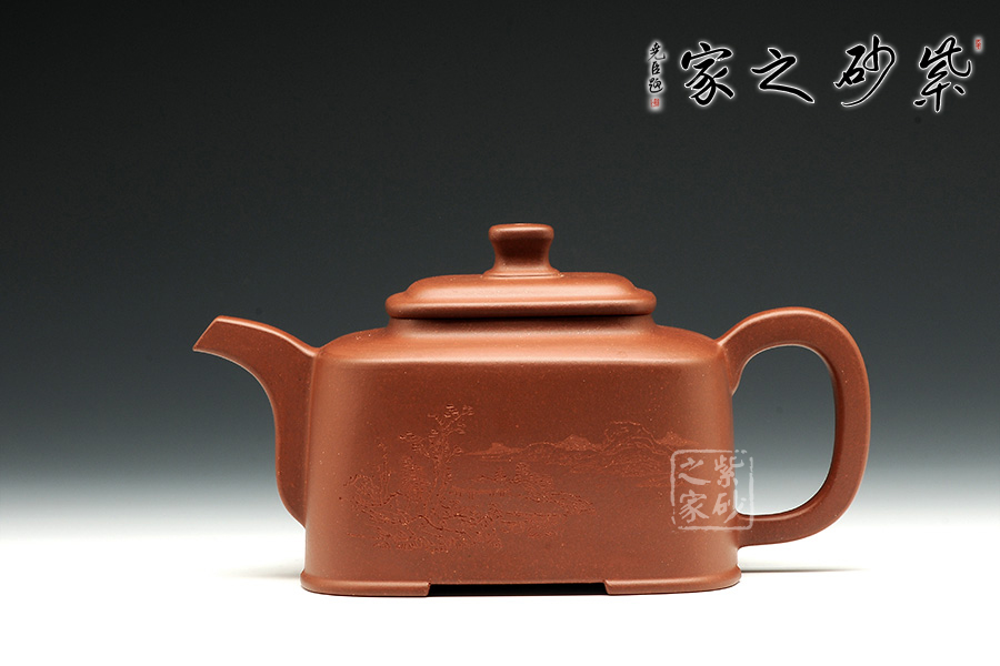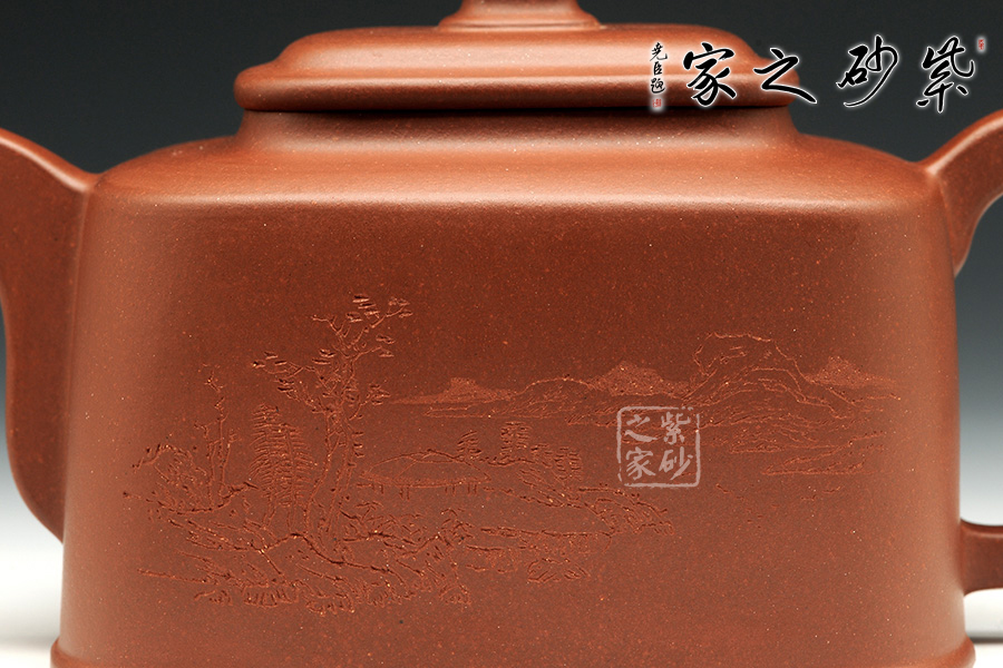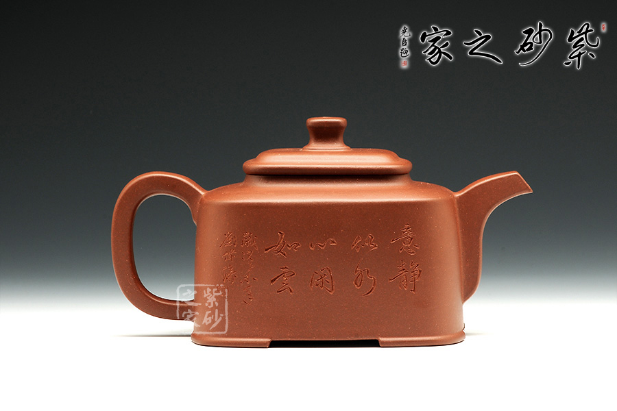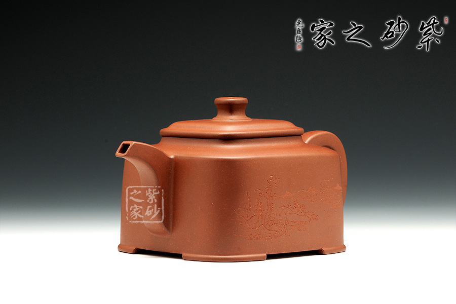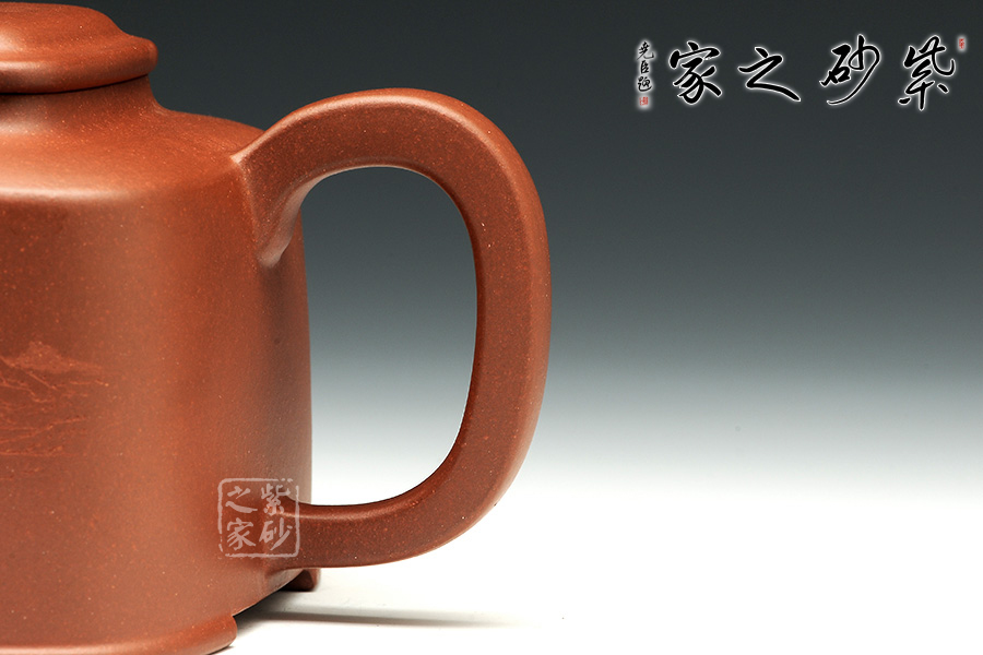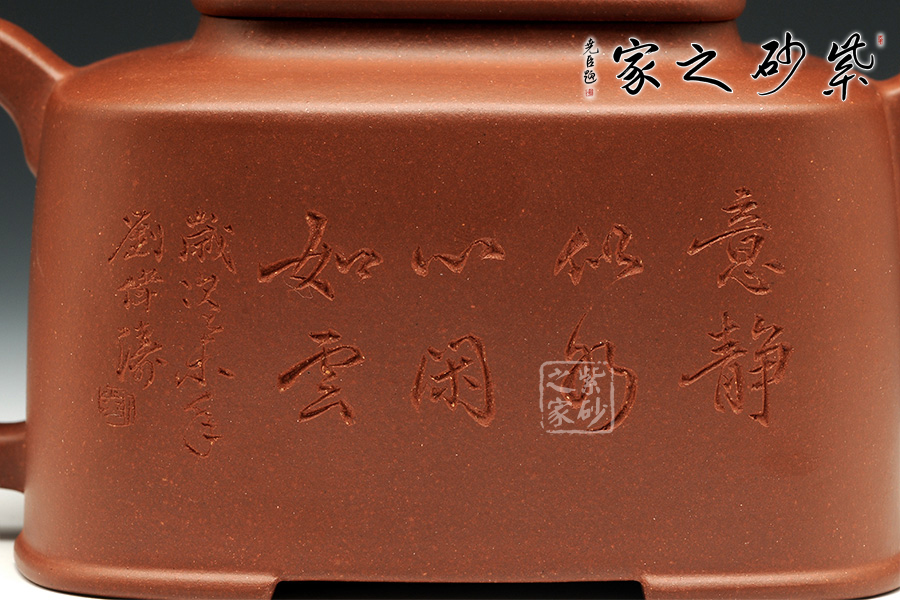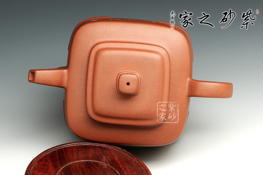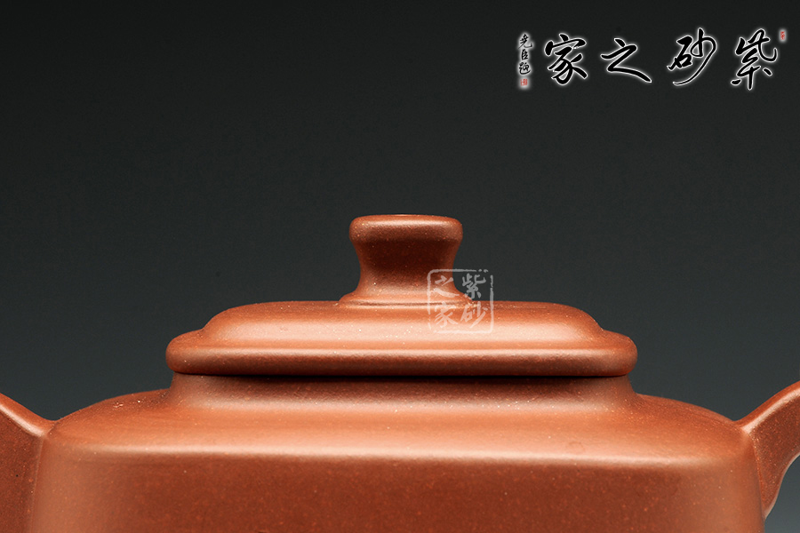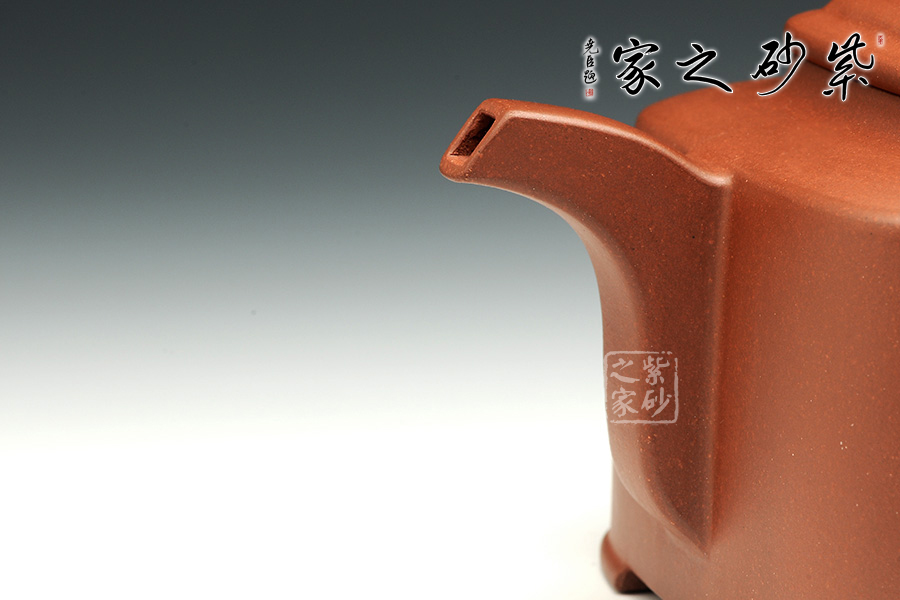 此壺呈四方形輪廓,壺方古樸,轉(zhuǎn)角以圓潤(rùn)處理為之,方圓結(jié)合顯得尤為古雅大氣,平蓋十分嚴(yán)密,蓋面平實(shí)和潤(rùn),壺鈕自然,柔和挺立,拿捏便捷。壺身四方有度,轉(zhuǎn)角均勻,弧度優(yōu)雅,這樣的設(shè)計(jì)增強(qiáng)了壺型的律動(dòng)感。壺把呈耳形,把體呈四方形,耳形轉(zhuǎn)角溫和,端握舒適大氣。明接壺嘴,四方彎流,出水迅猛流暢。