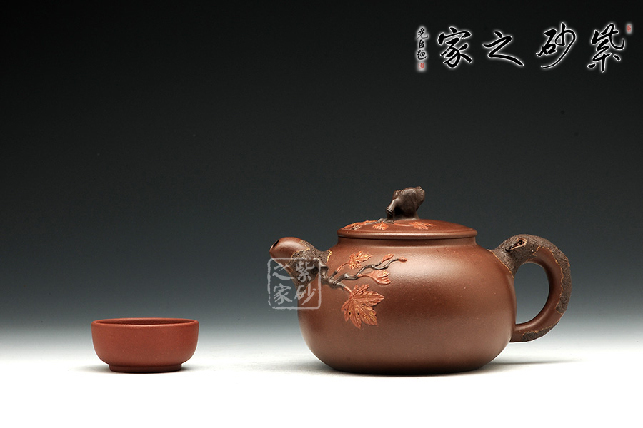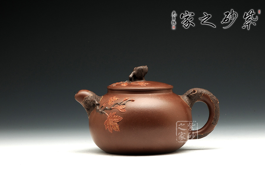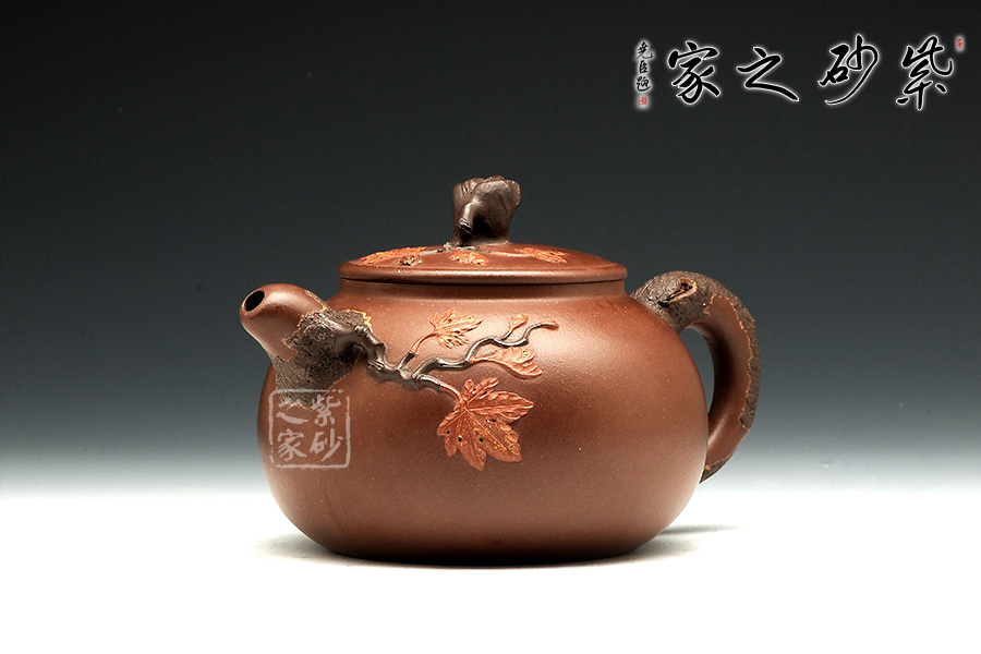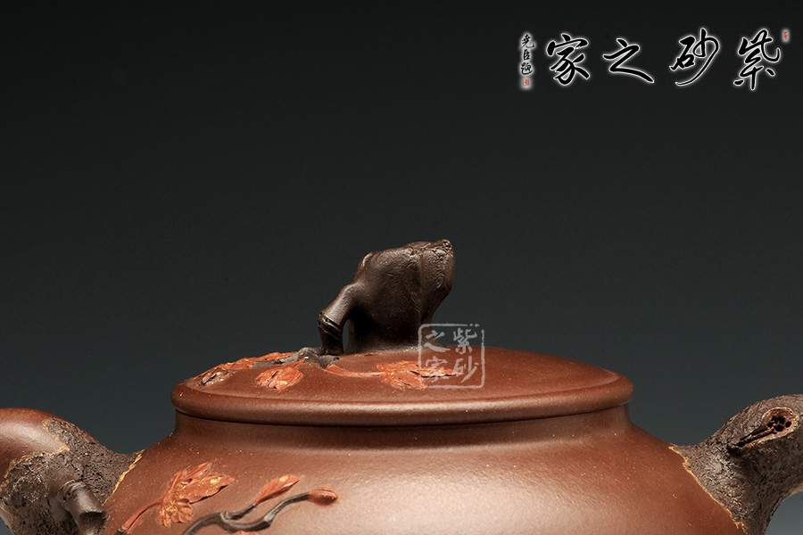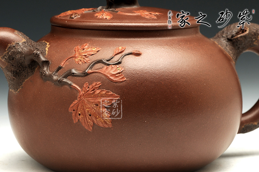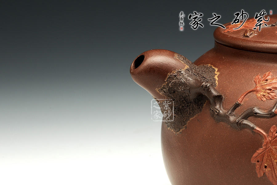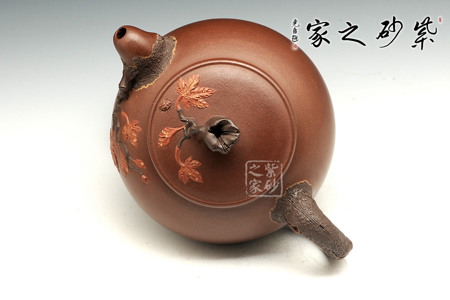 此壺的田園情趣濃郁,美妙生動,讓人難忘。壺型圓滑飽滿,以楓樹為形,寓意自然,給人以渾然天成的感受。壺嘴和壺把都非常傳統(tǒng),彎流小巧,環(huán)形順暢,楓樹枝葉形態(tài)貼近自然,生動美觀。壺身上的貼花非常有難度,葉片清雅,難能可貴。同時,壺鈕也與主題相輔,古藤古蔓,美妙無窮。