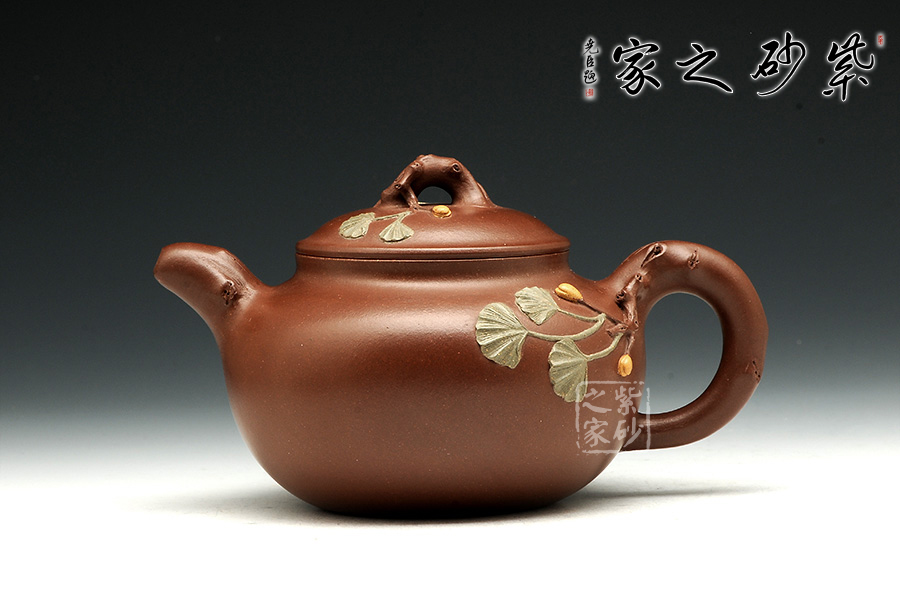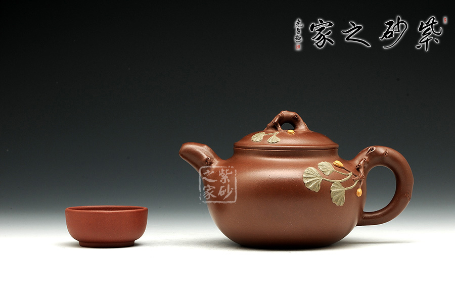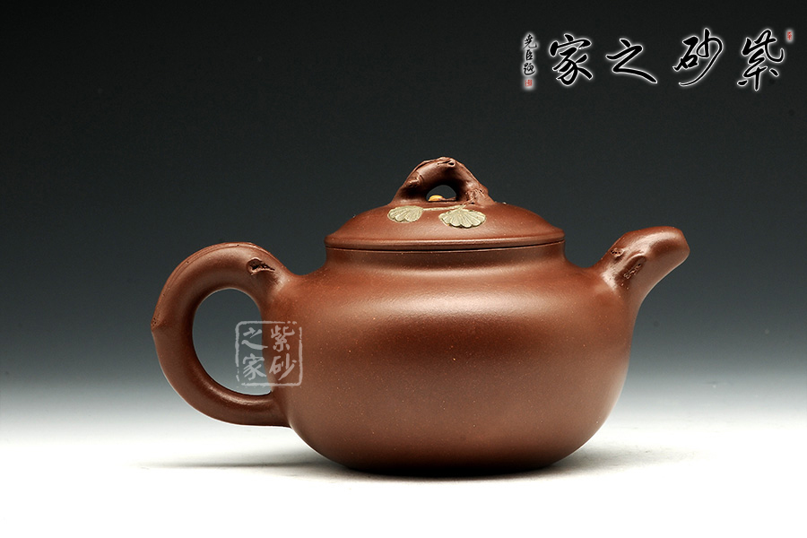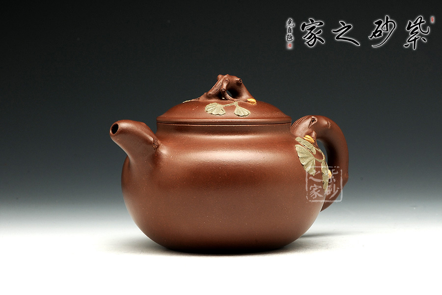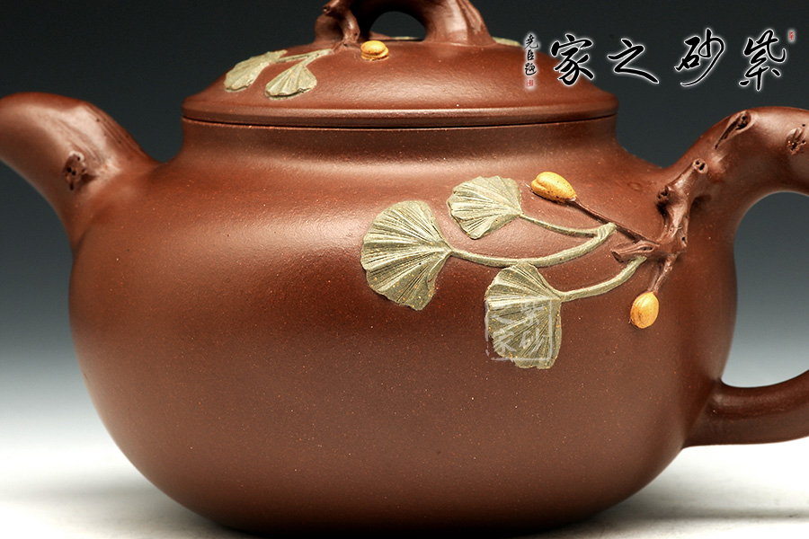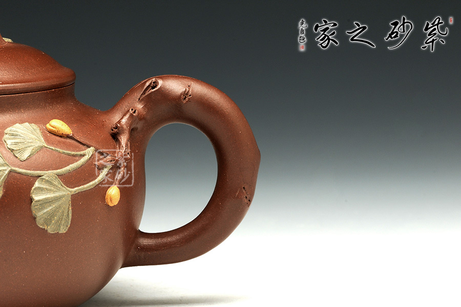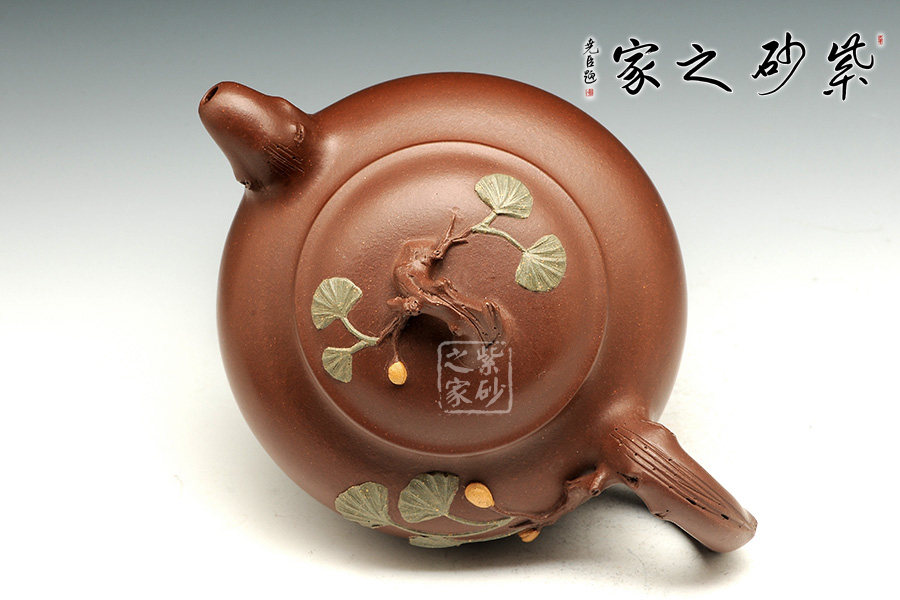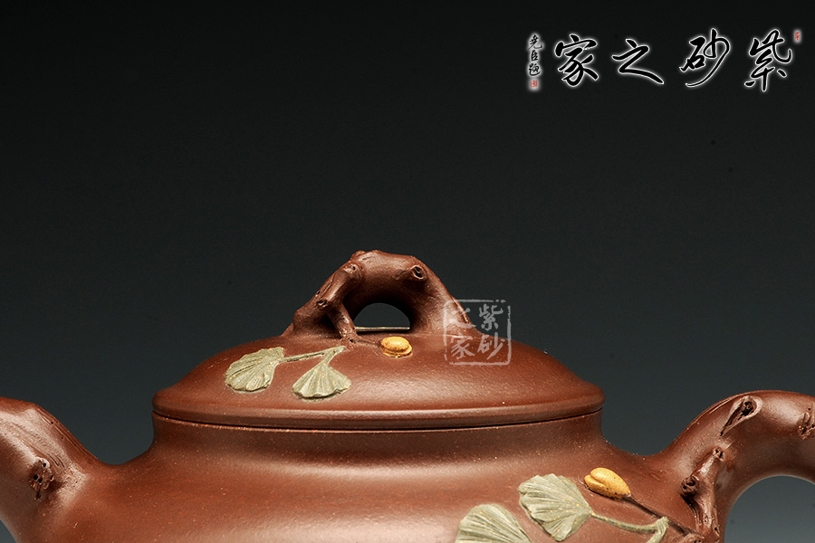 此壺簡(jiǎn)單美妙,清雅自然。造型圓潤(rùn)有致,壺身較為飽滿和圓潤(rùn),好似大肚有容,給人一種好事將近,萬事即將圓滿如意之感,吉祥和祝福之意,充溢此壺。壺嘴、壺把和壺鈕都是花貨裝飾,銀杏葉片包裹其上,樹枝形態(tài)自然美觀,貼花葉片更是精致入微,翠綠色鮮亮動(dòng)人,讓人凝神靜氣。