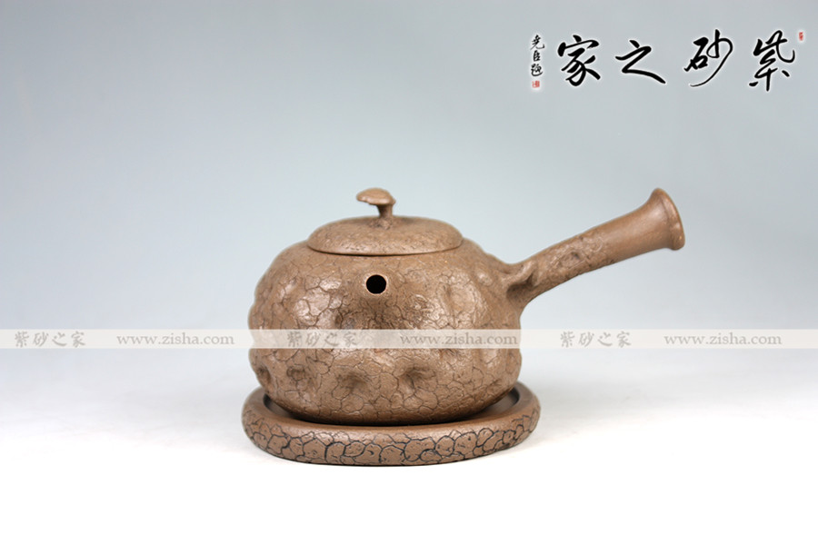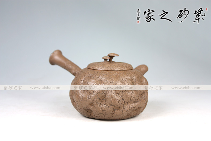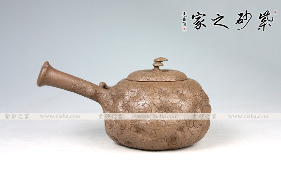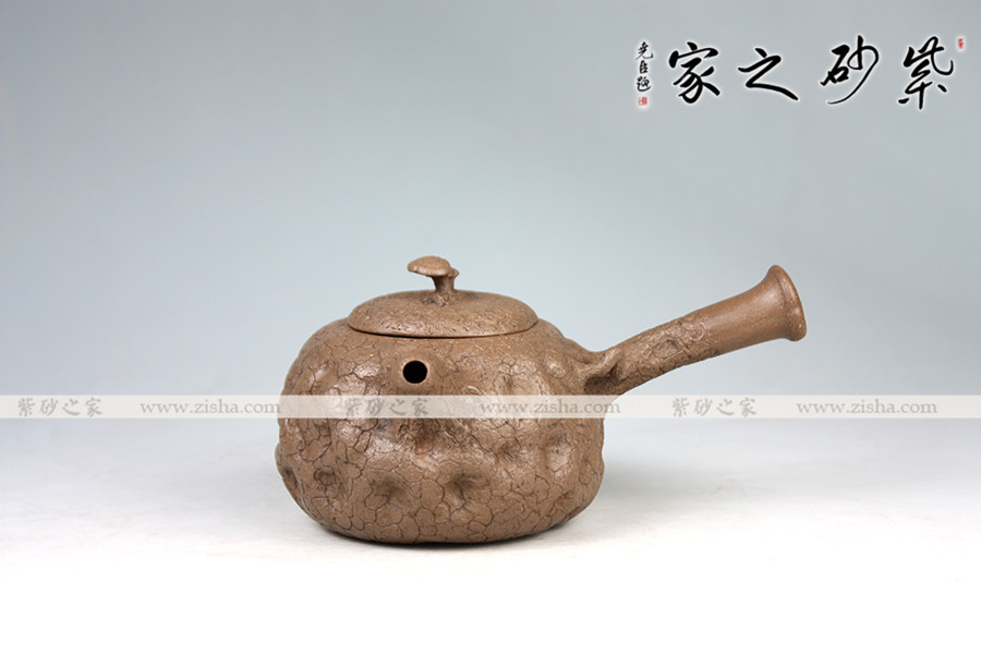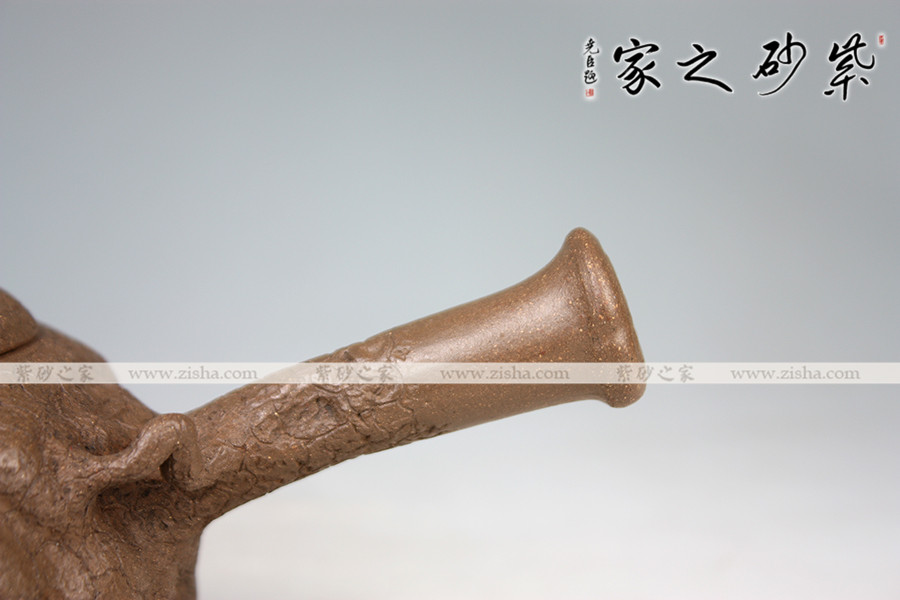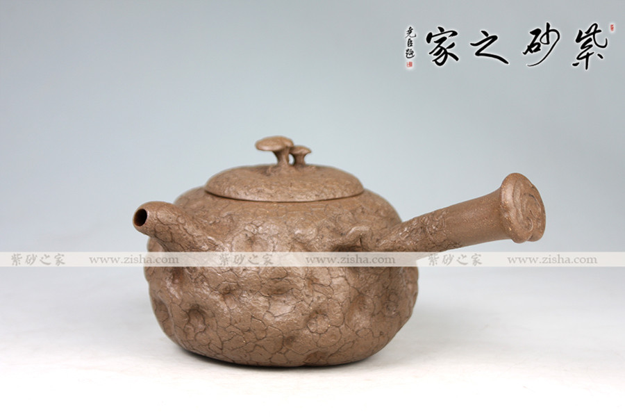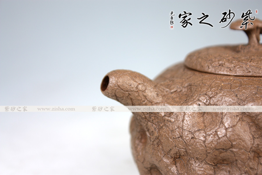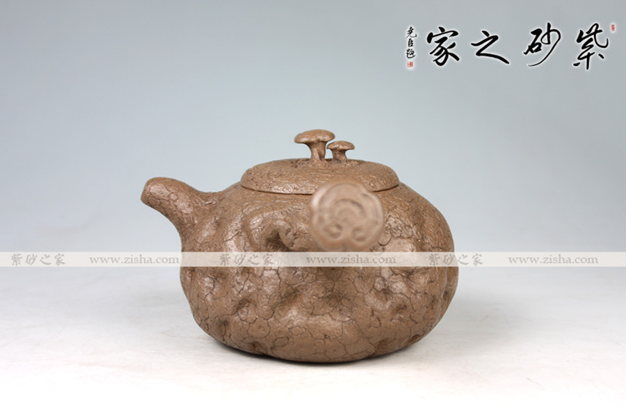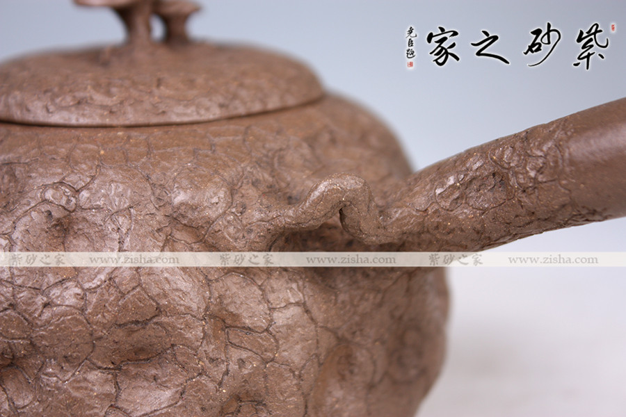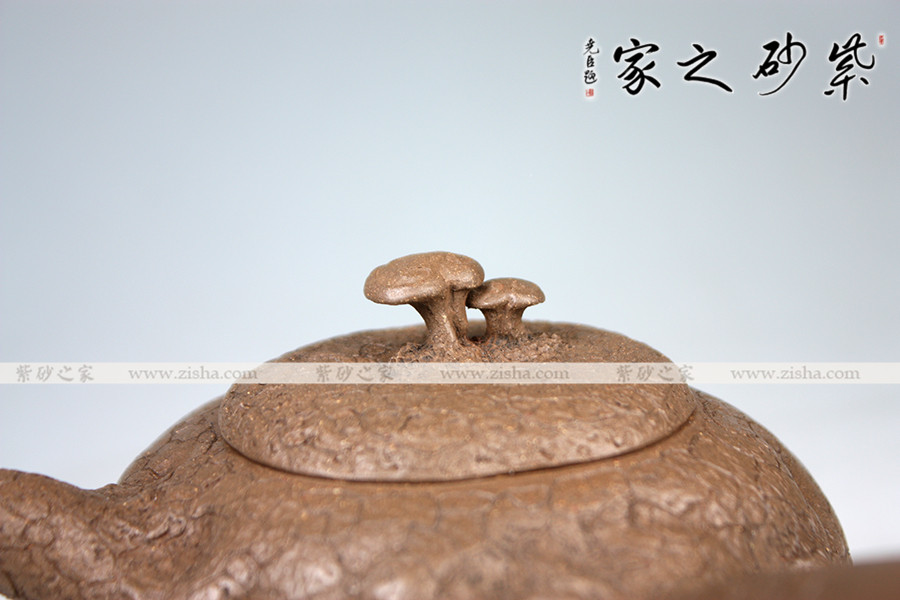 供春壺為紫砂鼻祖,后世之壺源出于此。老師做此供春,有壺意,也有深意。觀此壺,肌理的感覺(jué)非常真實(shí),樹(shù)皮的紋理、瘢痕都非常逼真,足見(jiàn)老師的用心程度。此壺看似簡(jiǎn)單,但做好非常難。徐達(dá)明老師此款橫把供春造型別致,以此為原型設(shè)計(jì),將靈芝的質(zhì)感與特點(diǎn)融入其中,甚是逼真形象,作橫把設(shè)計(jì)更是徐達(dá)明老師作品的特點(diǎn)之一,體現(xiàn)了其創(chuàng)新之意!