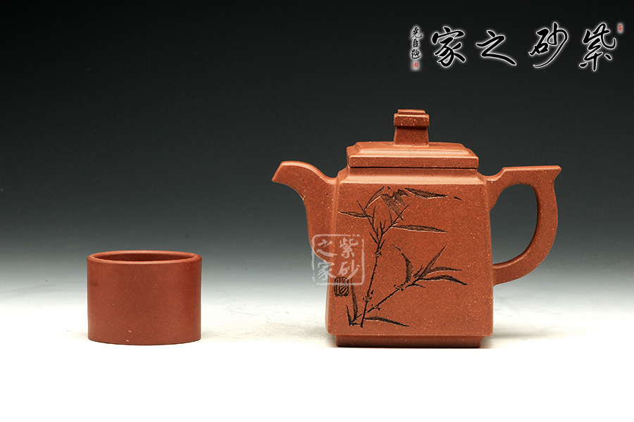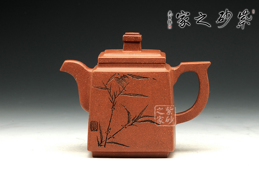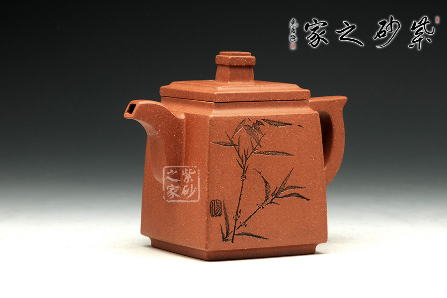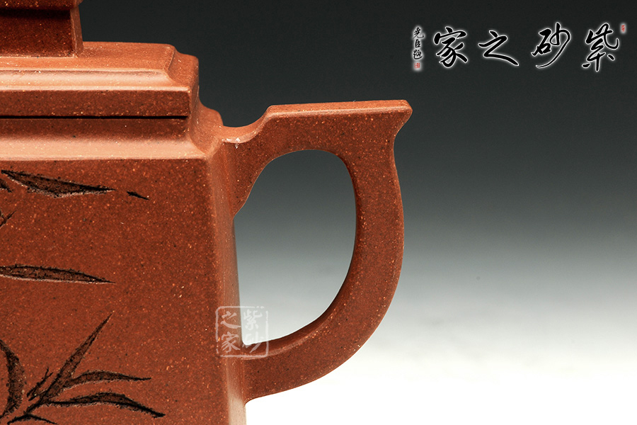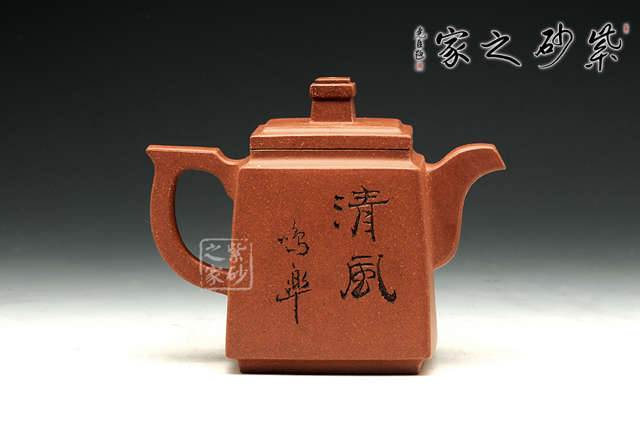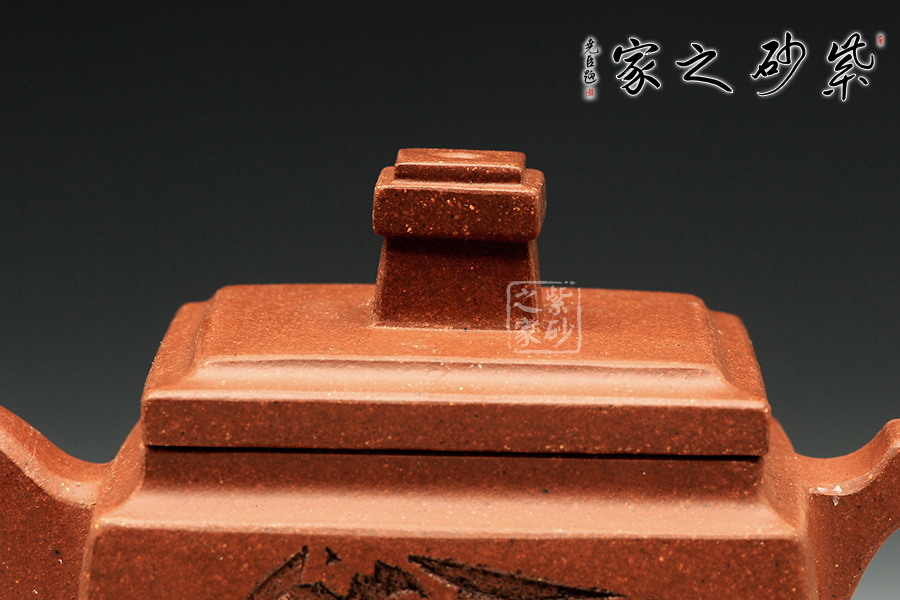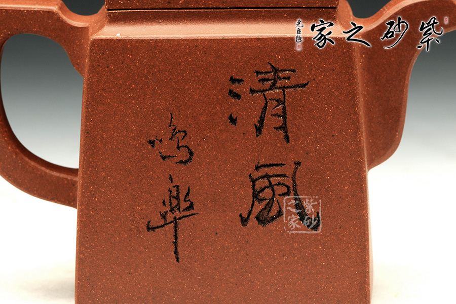 這把升方壺,壺身上小下大,由四個(gè)梯形平面鑲接而成,正方形嵌蓋,壺鈕造型與身同,延伸空間感,做梯形鈕樣式。壺流大腹彎曲,出水果斷;壺柄線條流暢,均由四棱線修飾,明接手法顯得流把堅(jiān)硬利索,剛正大氣。壺底則加足,整體端莊堅(jiān)毅,底槽青色澤彰顯渾厚肅穆,為方器之名!