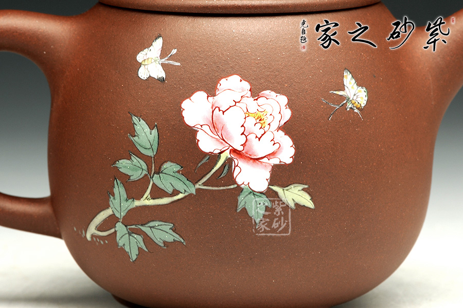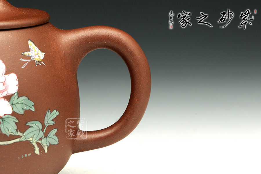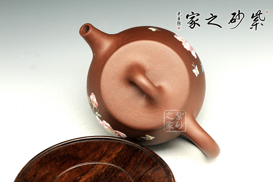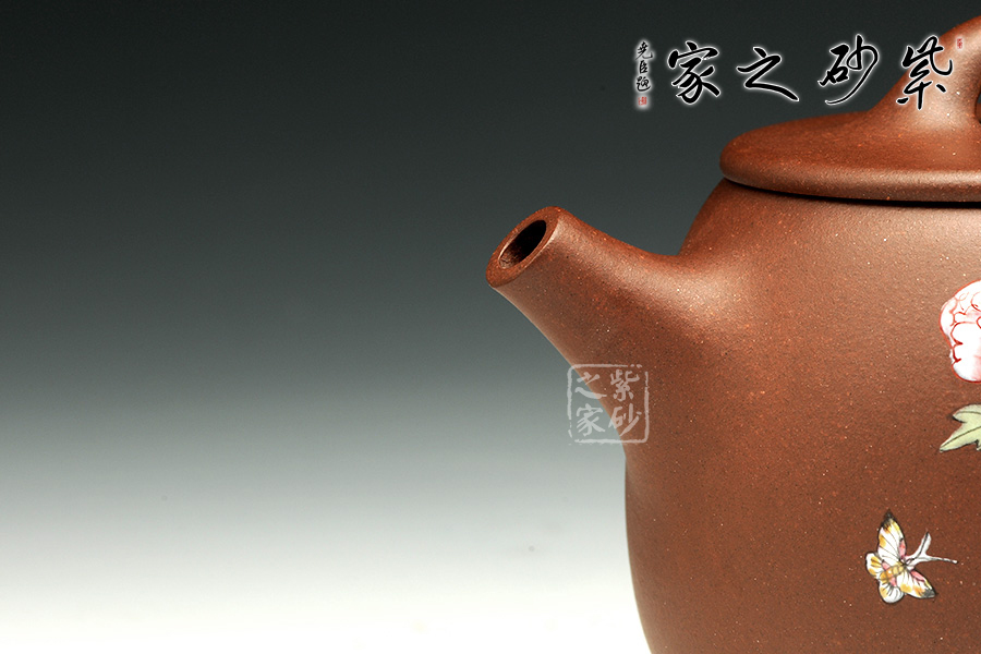 平蓋,中間和邊沿有一毫米的差距,蓋板線厚薄正好。高矮跨度都符合比例,變化較大。壺身以老師特有的琺瑯彩裝飾。壺嘴稱為直筒暗嘴,長短、粗細(xì)的比例恰當(dāng)、自然,不能相差絲毫。從嘴頭至壺身,逐漸加粗,就像是從壺體上生出來似的。壺底部三足稱圍棋足,形如圍棋子。三足位置呈等邊三角形,勻稱不偏,使整體統(tǒng)一,顯示出壺的神韻齊全,風(fēng)度大氣,實用大方。