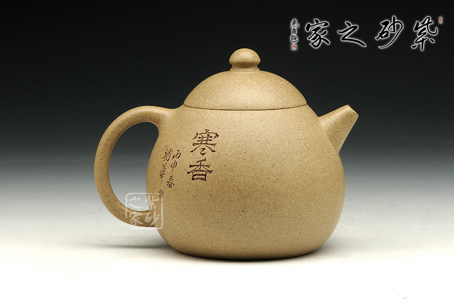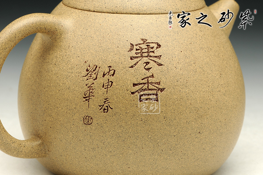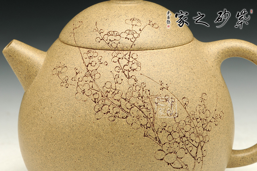 龍旦壺為經(jīng)典壺型,考驗個人功力。此龍旦壺造型渾然天成,而刻繪又別具匠心,著實難得。先說壺型,龍旦之難,在于壺型必須大小圓潤,變化自然。觀此壺,上小下大的線條流暢,壺把和壺嘴銜接都自然生動,可見技藝已然爐火純青。細(xì)致來說,壺嘴尖圓,卻似鳥喙般可愛。壺把似耳形,收放自如。精選原礦段泥全手制,古樸動人。
