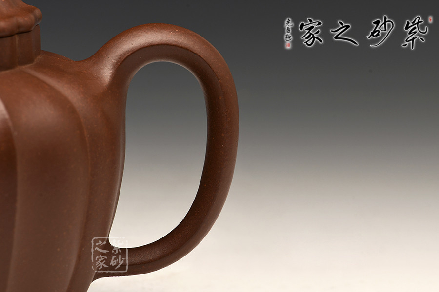 彎流嘴,柔潤優(yōu)美,環(huán)把隨勢,與壺嘴相呼應(yīng),氣韻舒暢。