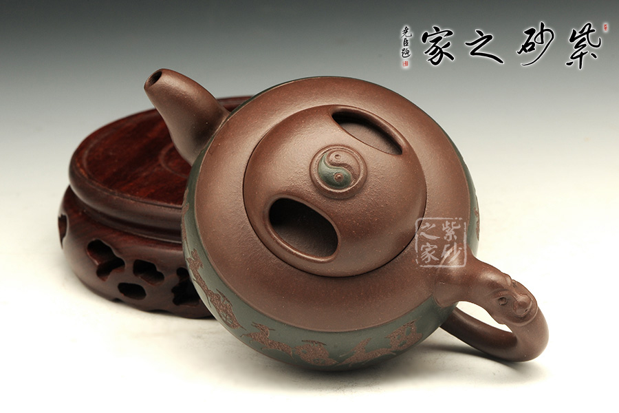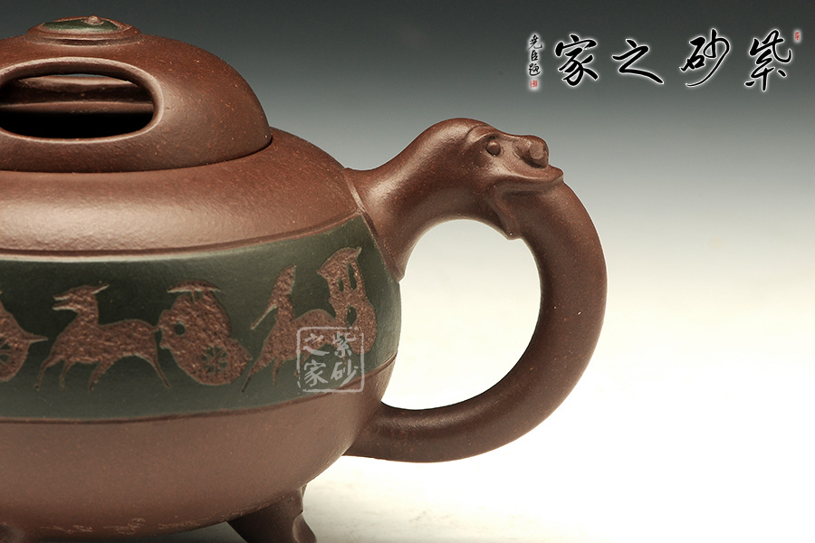 牛孔式鏤空為蓋,龍嘴彎流胥出,出水爽利,耳形把,飛馳一龍頭,壺身呈鐘鼎之形,大氣古雅,龍騰之勢在乾坤之間全然而生。此壺將中華民族傳統的龍、道教文化相互結合,具有意想不到的效果,寓意明朗、和諧,有龍騰盛世之意。此壺細節點到之處,令觀壺之人無不感慨作者手法之精妙,并以吉祥的寓意為多少愛壺之人久久無法平息其惜壺之心。