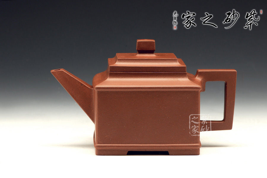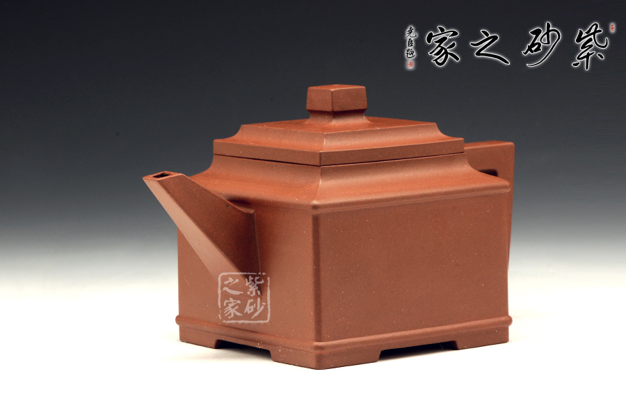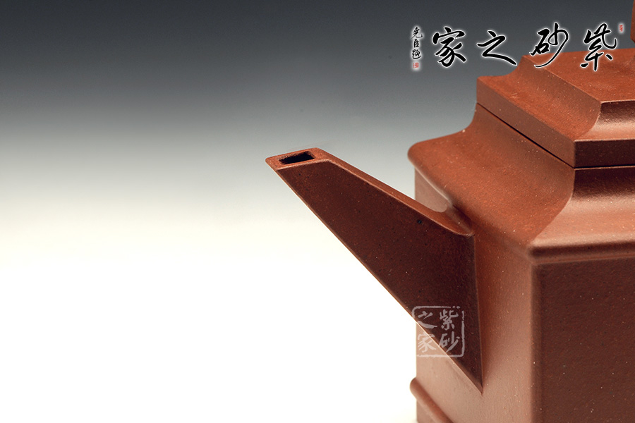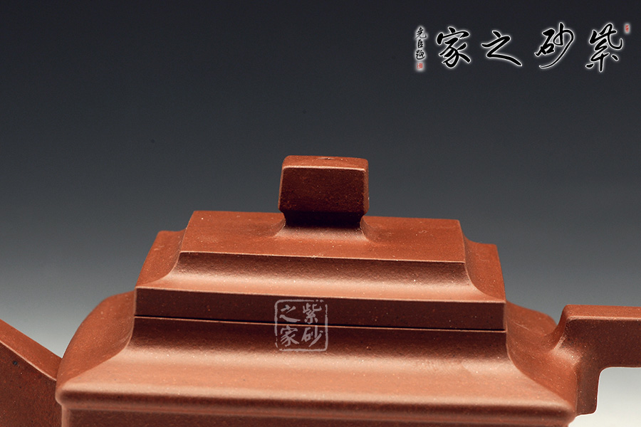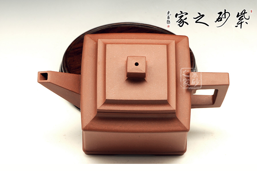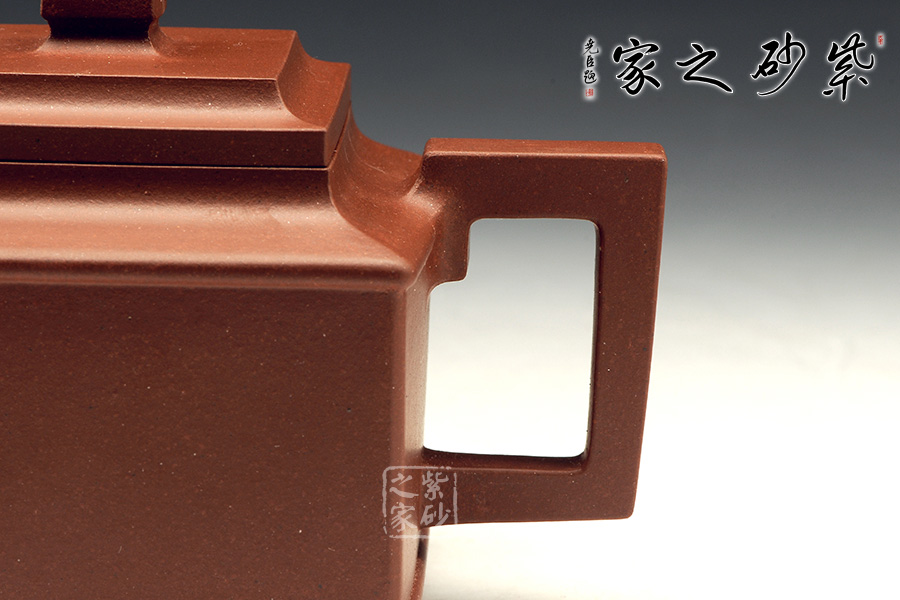 此款四方整體造型比例協(xié)調(diào),線面挺括有力,輪廓分明,全器氣勢挺拔,英姿颯爽,成就紫砂方器之美,同時演繹著光素器的獨特魅力。四方壓蓋,方磚壺鈕,磊落大氣。方鈕、方把、方嘴,嘴流輸出強悍,由粗變細,直挺有力。壺把規(guī)則四方挺括,氣勢宏大,立體感極強。整把壺線條挺括,折角交代清晰,面線結(jié)合爽利。是方器中難得極品。
