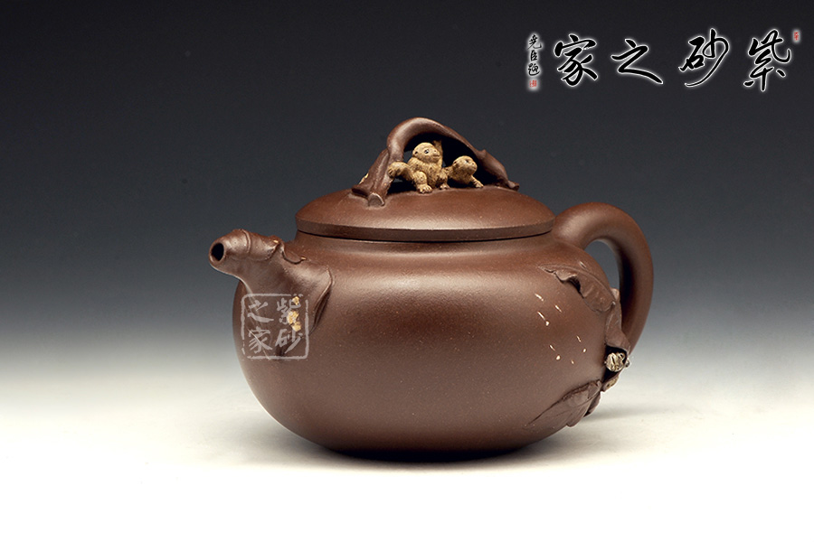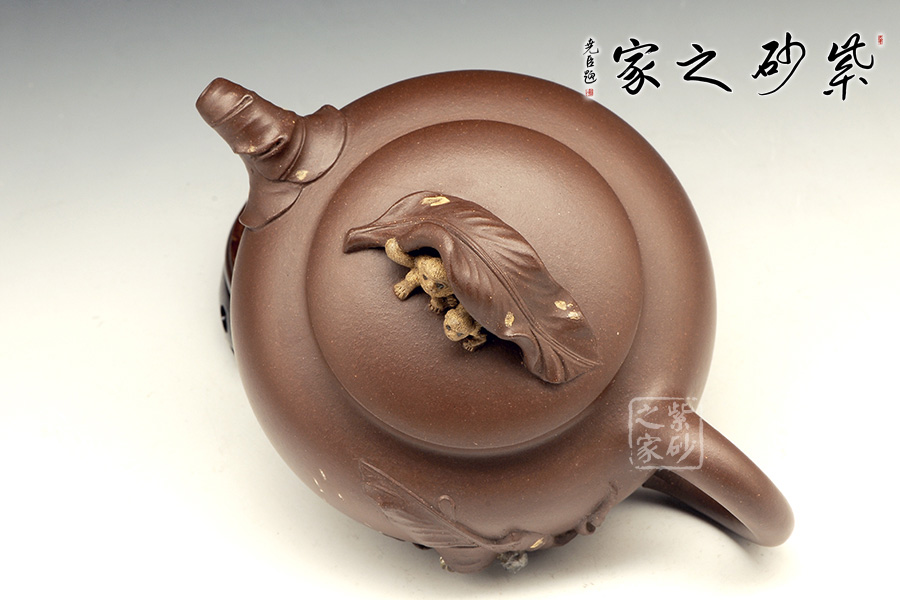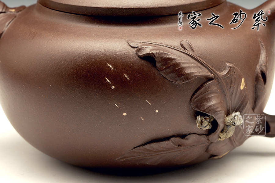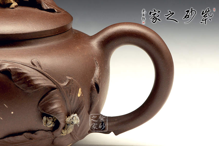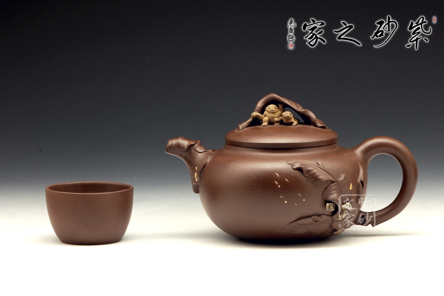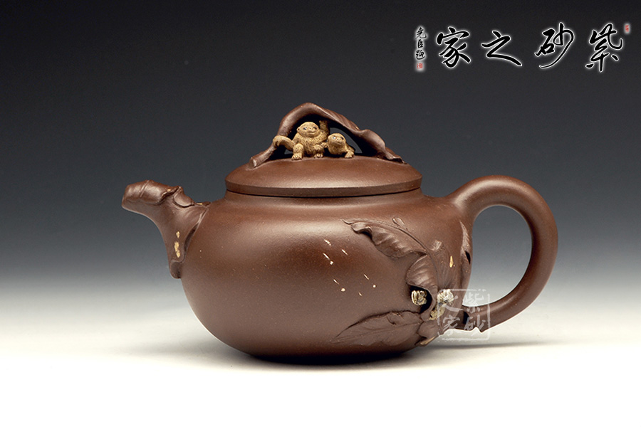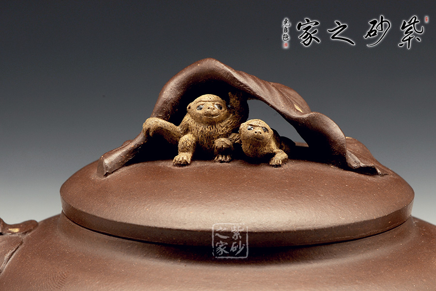 壺嘴則若南瓜葉包裹而成,精巧別致,創(chuàng)意極新。壺把處一南瓜葉子胥出,蒼老卻不失神氣。壺蓋上兩只猴子尤其動(dòng)人,一只趴在壺蓋上,悠閑自在,一只坐在上面,撐著葉子,神態(tài)憨厚。品玩此物,不知不覺(jué)人就心情爽朗,會(huì)心一笑。