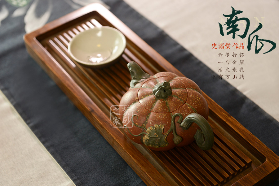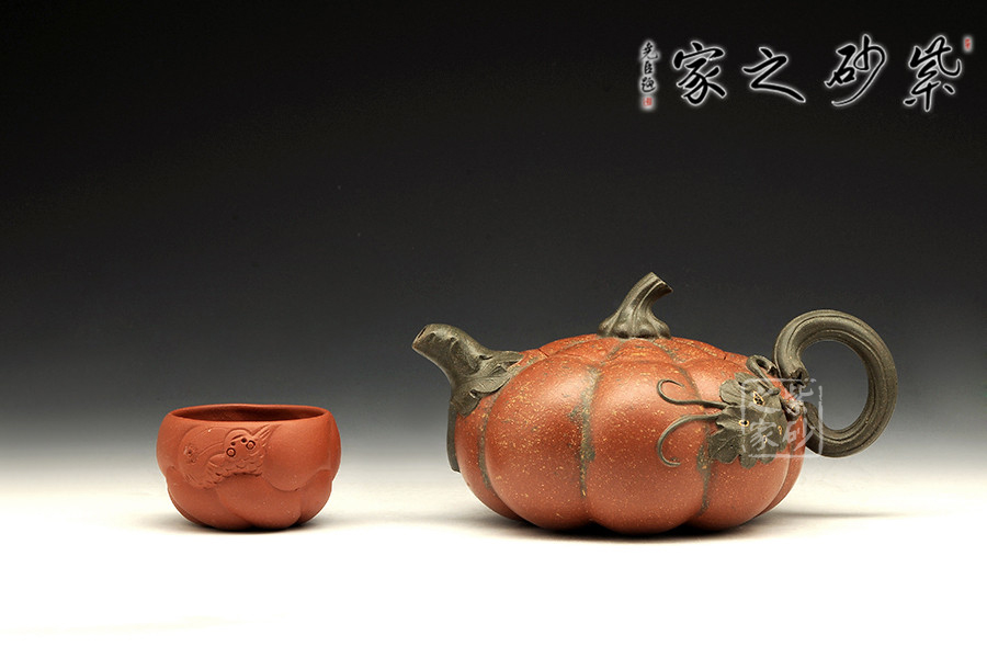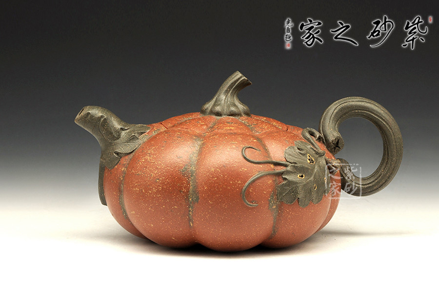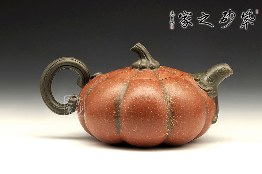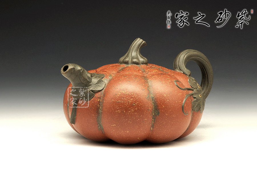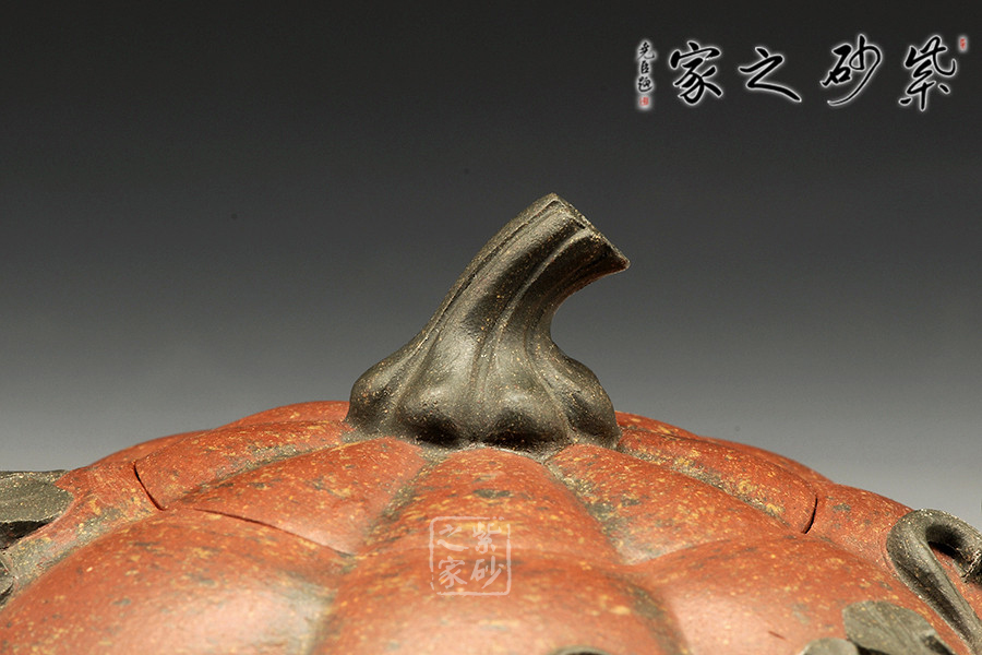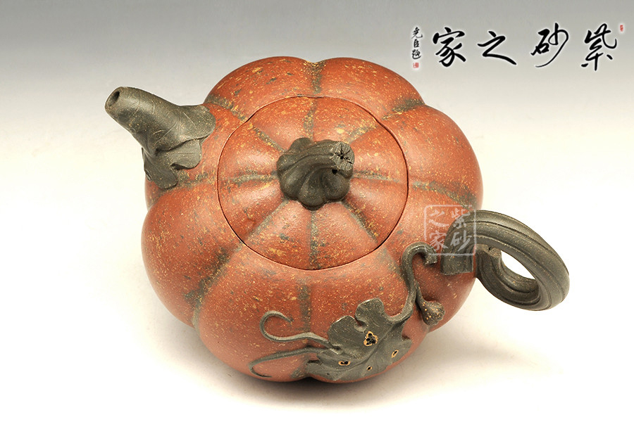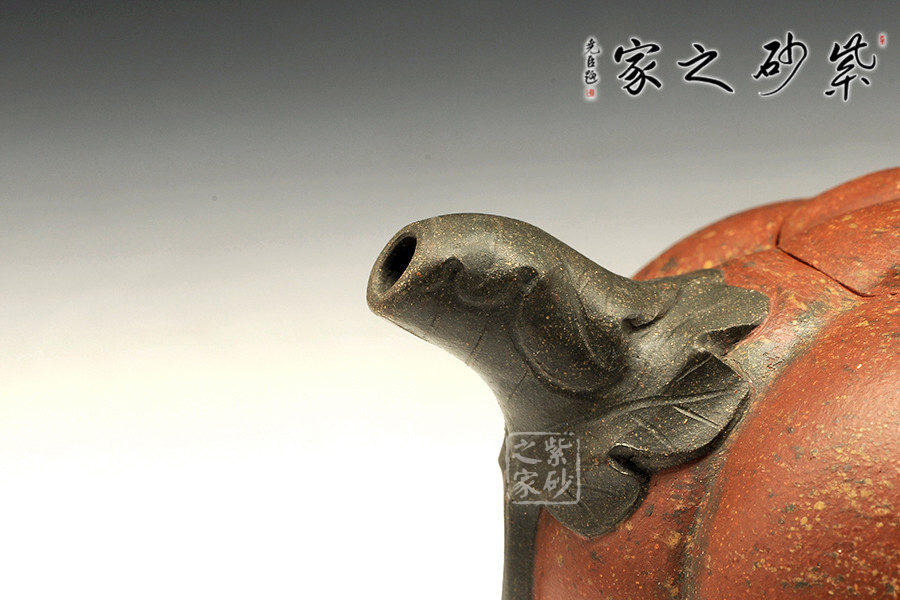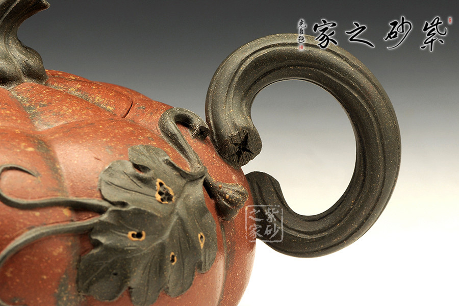 此南瓜壺做工精細,不同以往,更貼近自然,泥料色澤田園之趣盡顯,更顯得逸趣橫生,形象生動。是花塑器與筋紋器的結合,南瓜形壺體、反蒂狀壺鈕、由南瓜葉倦成的壺嘴以及瓜藤形壺把,壺身的制作自然生動,所有的筋紋刻劃逼真,造型自然可愛,老師以其嫻熟的技藝以及巧妙的設色成功塑造出如此精致規(guī)整而富有生命的南瓜壺!