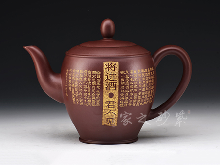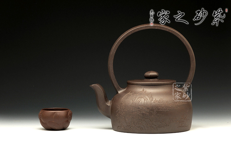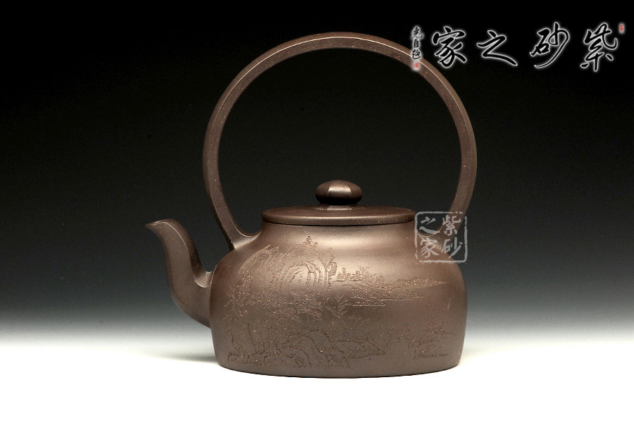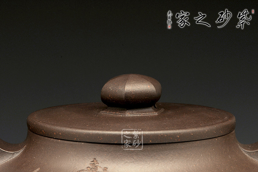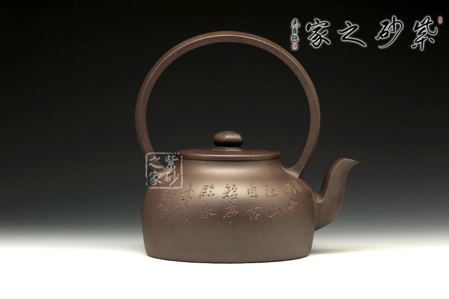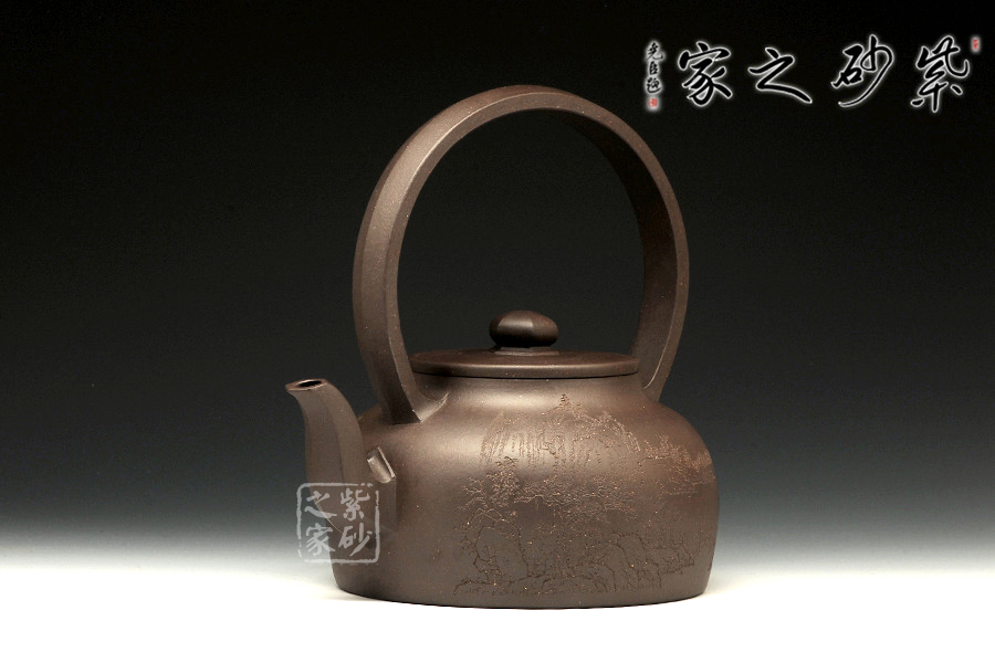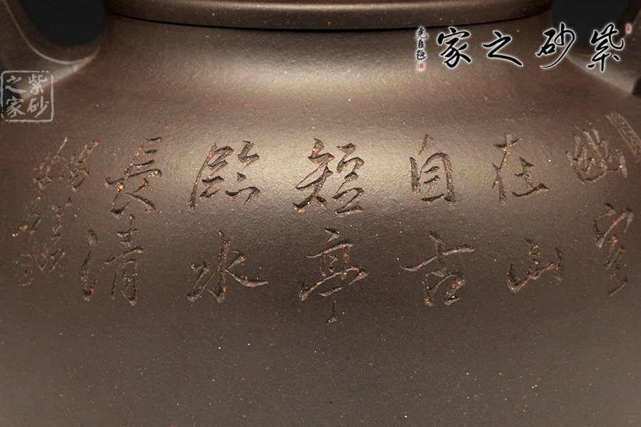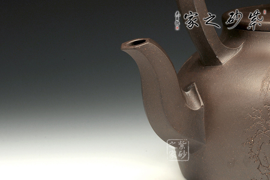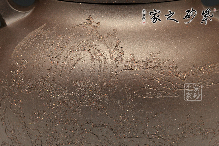 整器氣質偉建深沉樸茂,置放于各種環境中品茗觀賞,都能顯其神彩。壺腹圓潤而滿呈半圓狀,充分彰顯了傳統器型雍容、大度、沉穩,特大圓提梁跨壺體,恰似一道長虹,且骨肉均衡,氣度不同凡響。壺身兩旁以書畫裝飾之,使飲者在品茗之余,又能品味到紫砂獨特的金石文化。