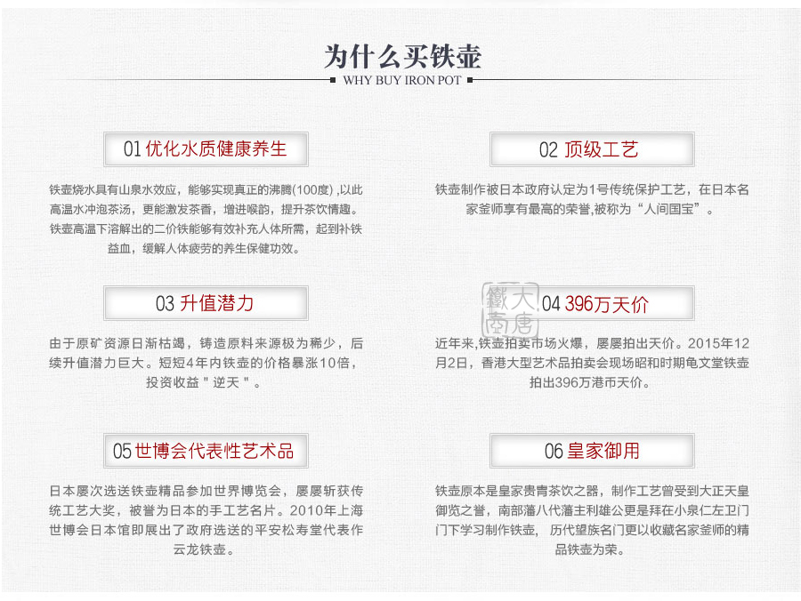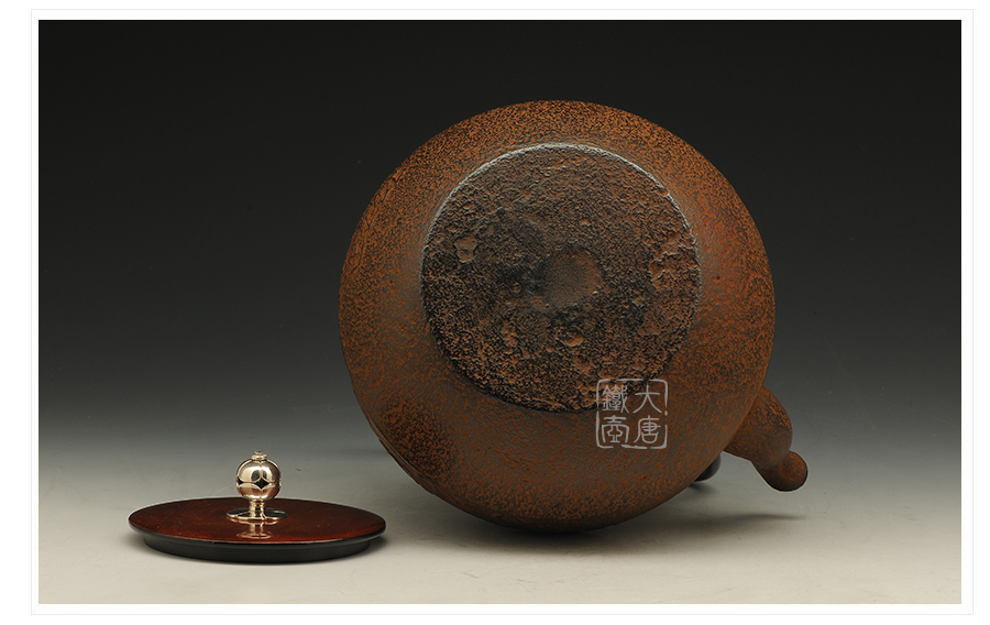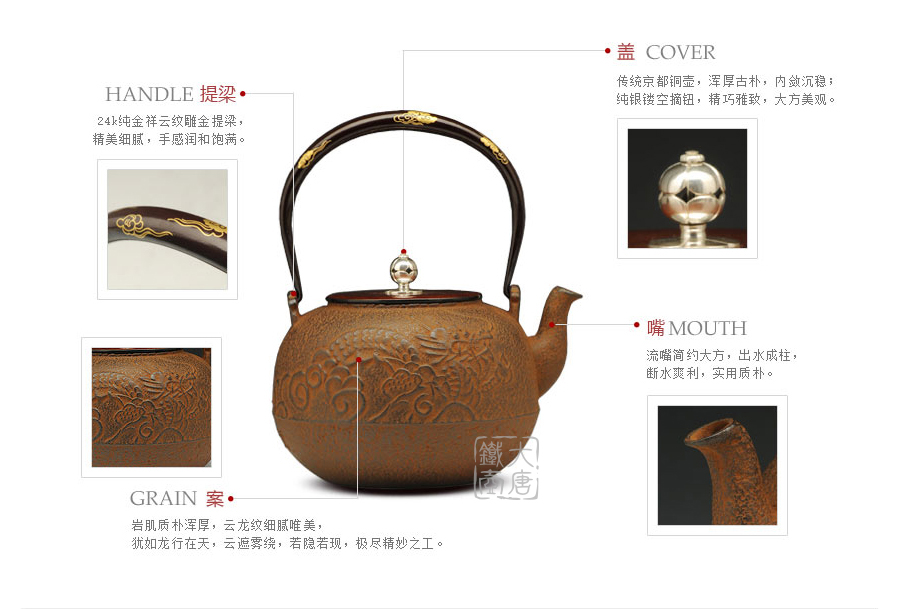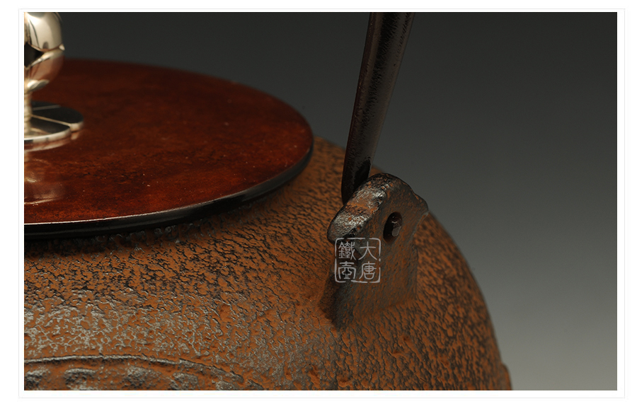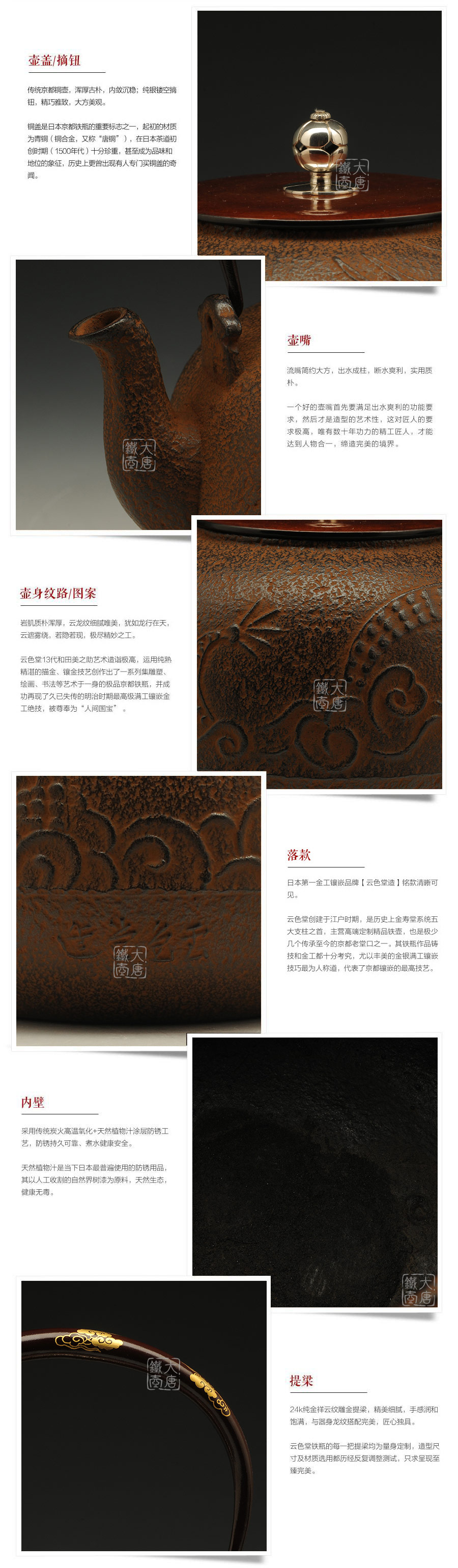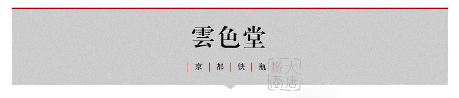 云色堂的鐵壺以豐美的裝飾技巧最為人稱道,描金及鑲金技術十分成熟。紋飾圖案的線條借鑒了日本古典瓷器的樣式。同時在一些細節的構建上,云色堂也不惜使用珍貴的材料來彰顯他華貴的氣質。在眾多堂口的鐵瓶中,這種特色使得其作品有很強的辨識性。