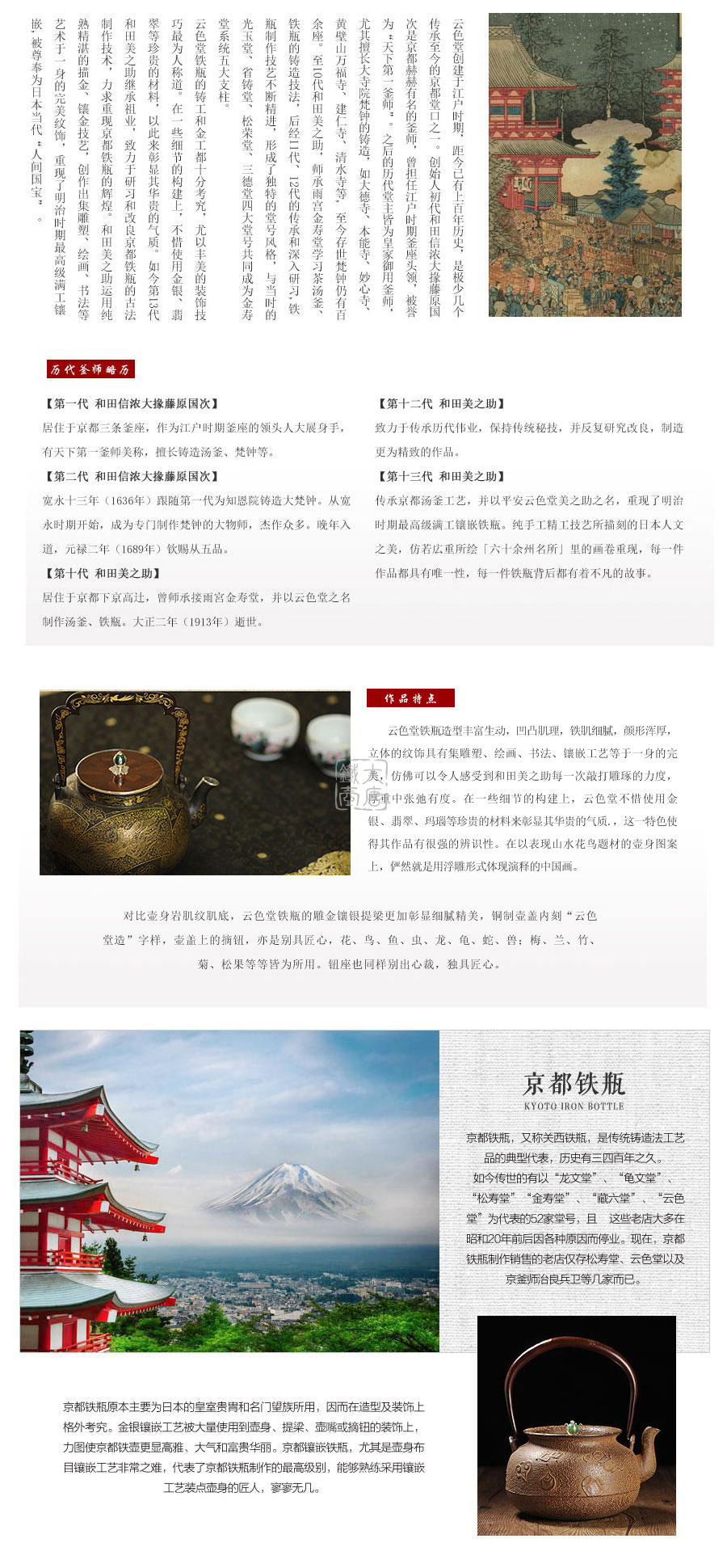 10代和田美之助親自前往雨宮金壽堂學習茶湯釜、鐵瓶的鑄造技法,深得京都鐵瓶的制作精髓。幾代人孜孜不倦努力,換來日益精進的技藝與作品。現在每天云色堂的作品都會在各地展出。如今第13代傳人和田美之助傳承京都湯釜制作工藝,鉆研并改良京都鐵瓶的古法制作技術,重現明治時期最高級京都鑲嵌鐵瓶。