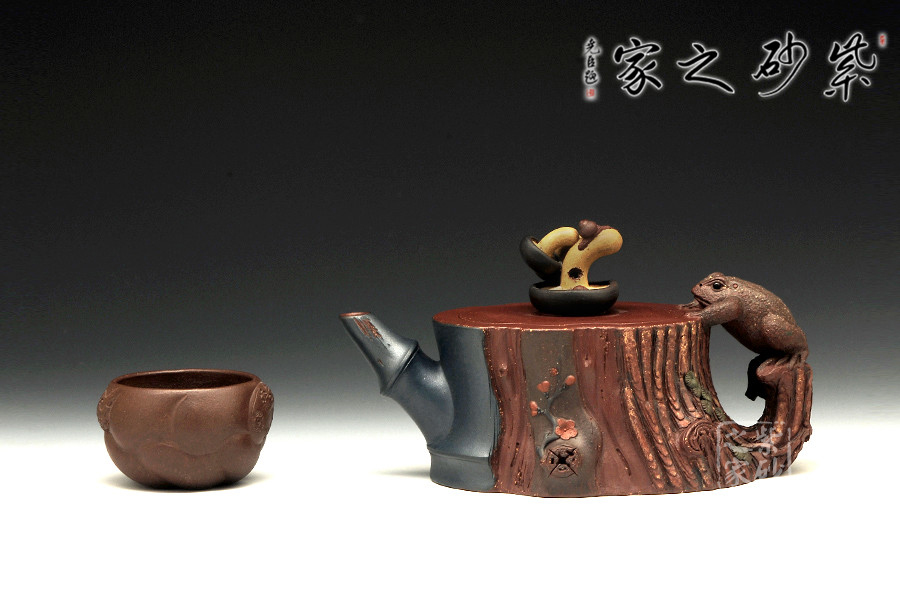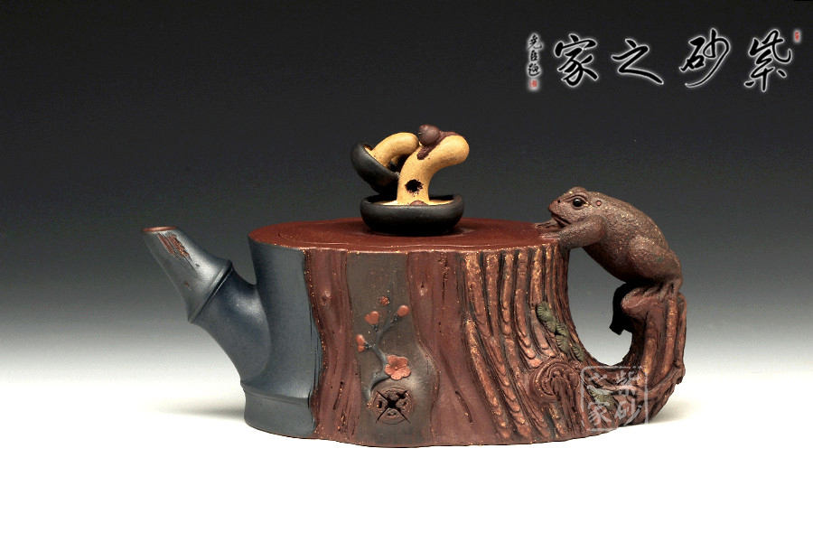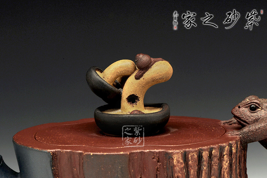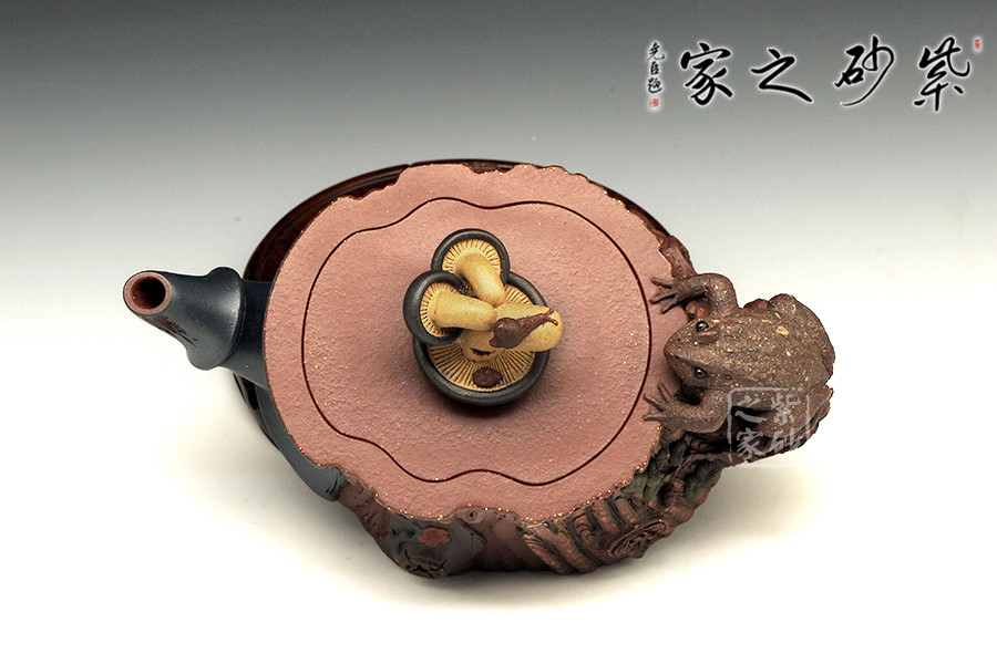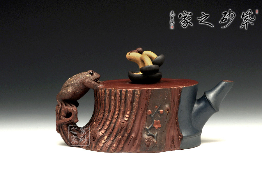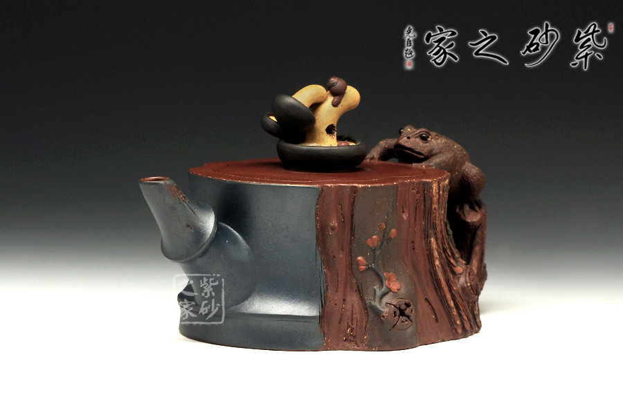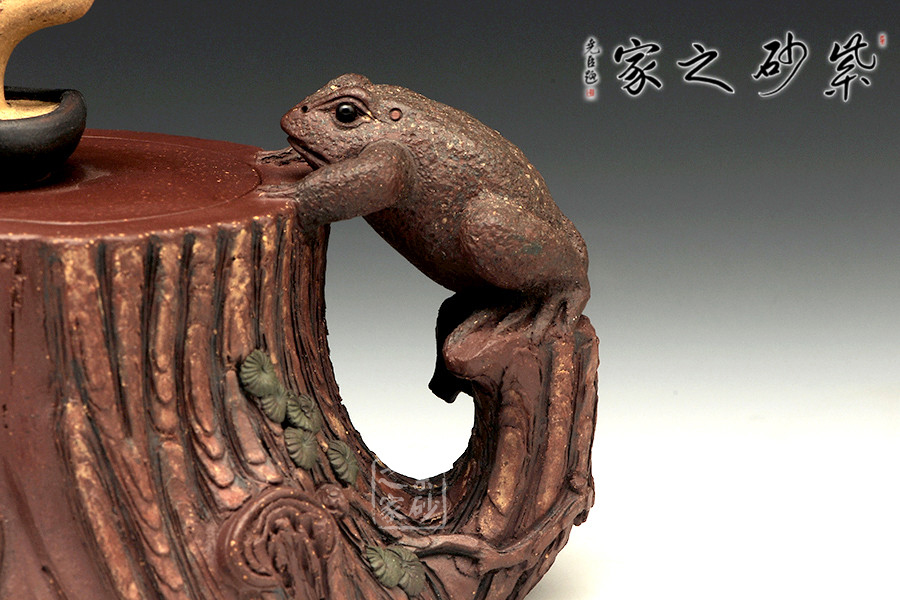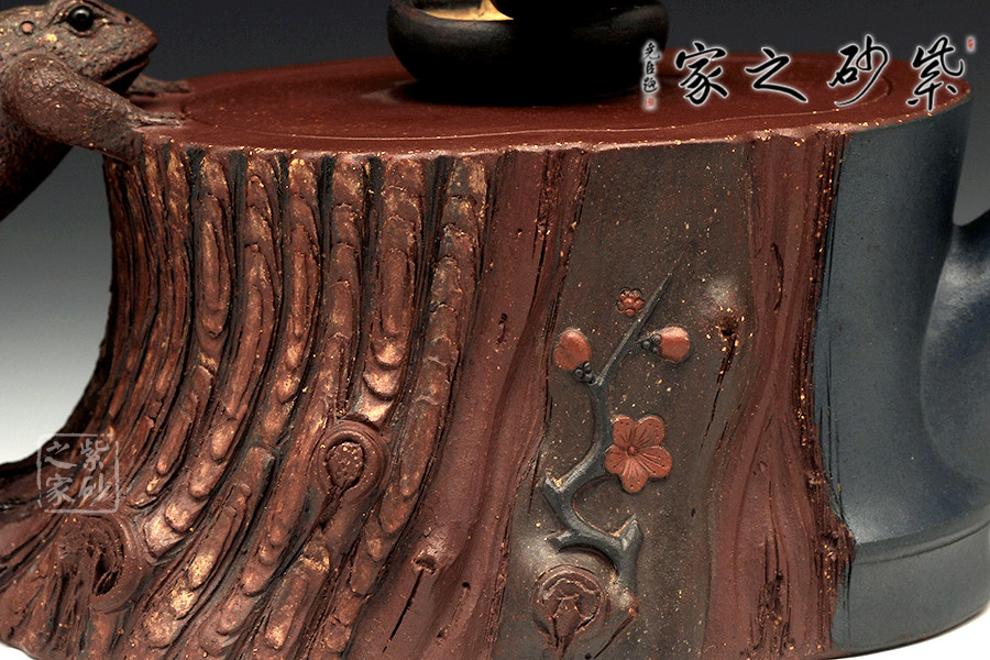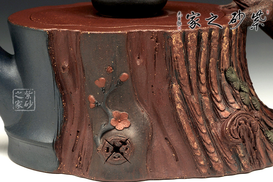 此壺為仿生形態(tài),做得逼真自然,能讓人喜歡。樹木的形態(tài)上下貫通,逼真自然。樹樁粗細不同,上下全不規(guī)則,再加上各種瘢痕、裂紋、樹皮的模樣,更顯得樹樁十分生動。壺嘴、壺鈕和壺把則是樹枝,有彎有直,有收有放,粗細不一,將樹樁壺點綴得尤其逼真。