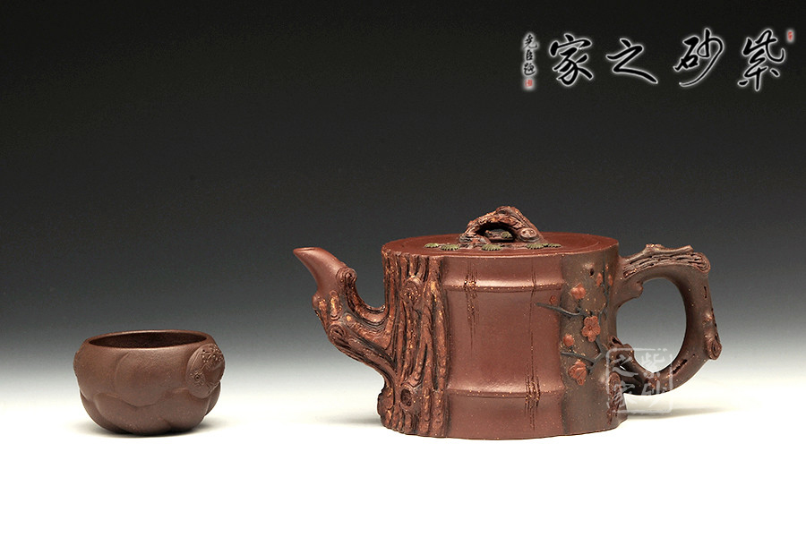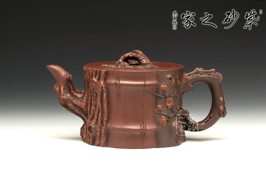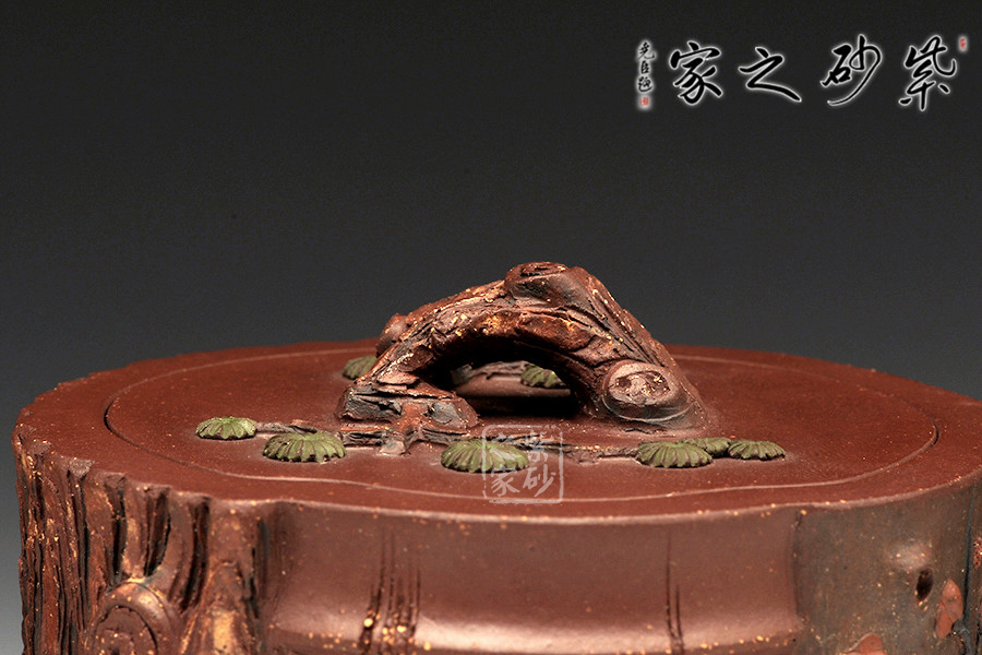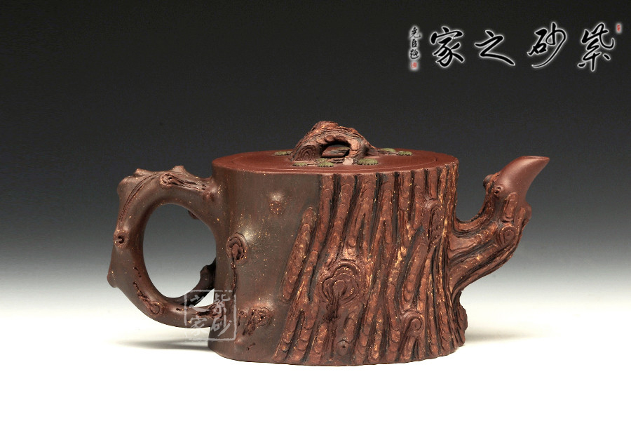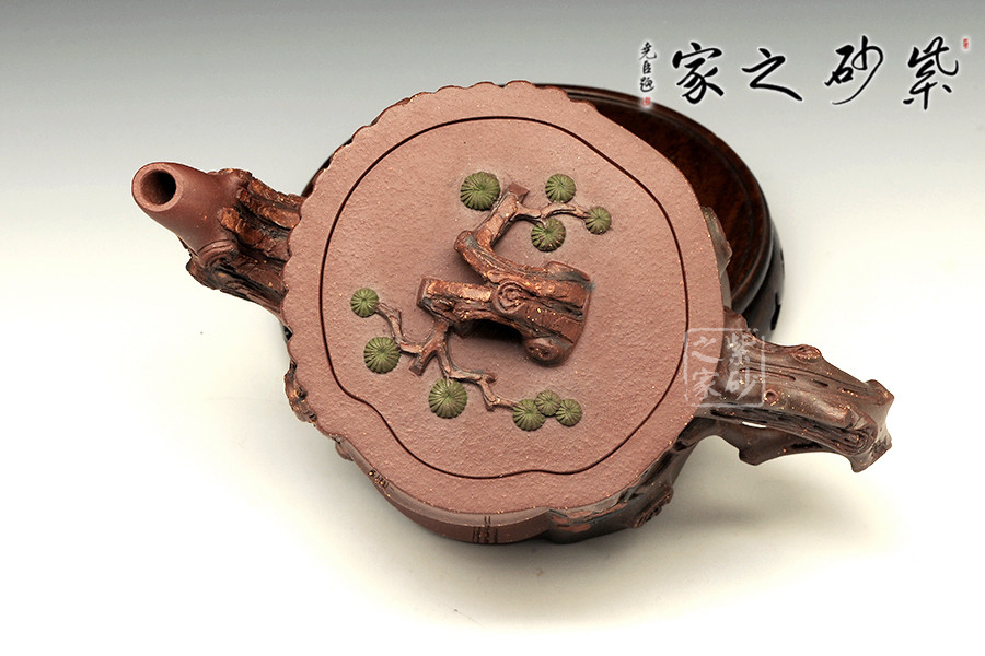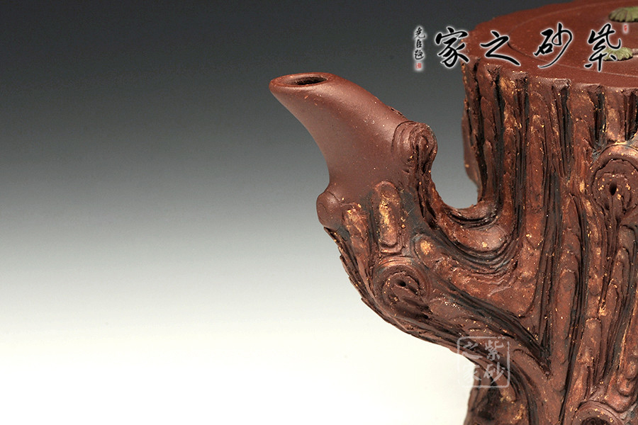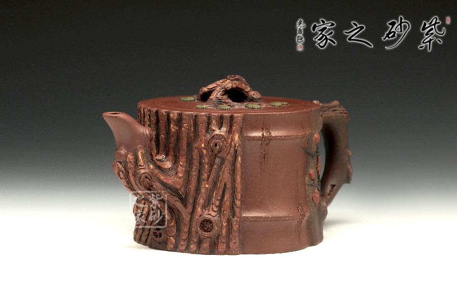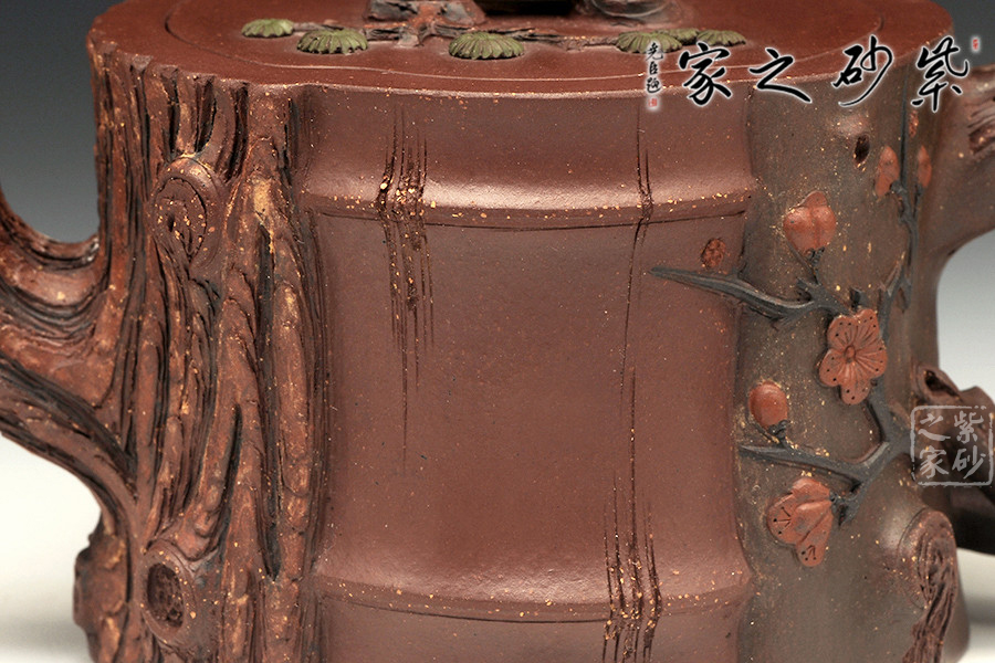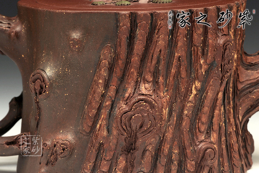 此壺為仿生形態(tài),做得逼真自然,能讓人喜歡。樹木的形態(tài)上下貫通,逼真自然。樹樁粗細(xì)不同,上下全不規(guī)則,再加上各種瘢痕、裂紋、樹皮的模樣,更顯得樹樁十分生動(dòng)。壺嘴是竹節(jié)、壺鈕是松樁、壺把則是梅枝,有彎有直,有收有放,粗細(xì)不一,將樹樁壺點(diǎn)綴得尤其逼真。