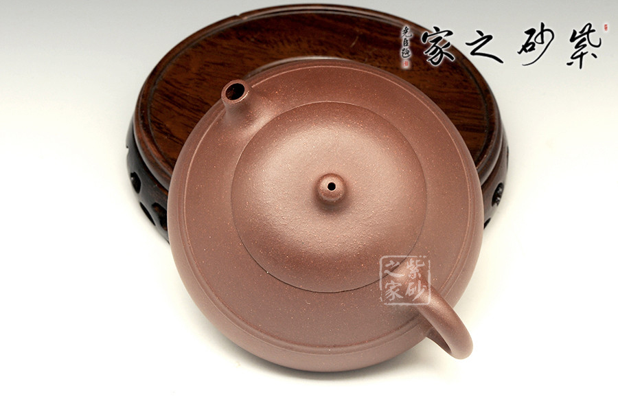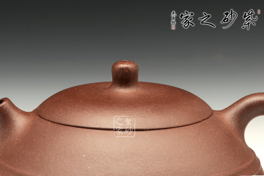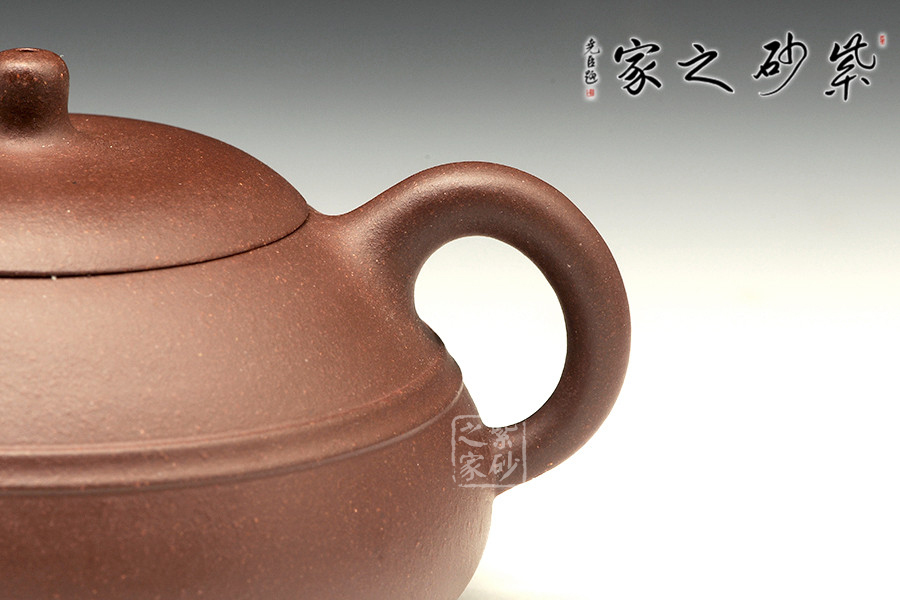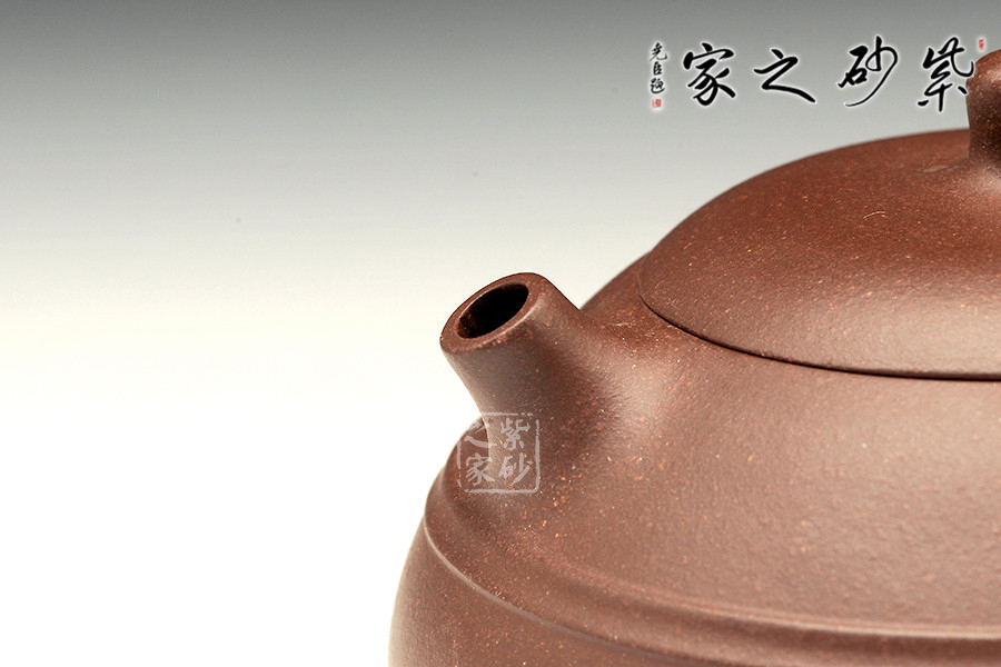 此壺整體極為敦厚穩(wěn)重,似乎全部的力量都在壺底。小小的乳丁鈕、短小有力的直流、細(xì)膩的圈把,在矮實(shí)的壺體襯托之下均顯得力度欠豐,因此整個(gè)壺體猶如一尊彌勒端坐在那里,堅(jiān)不可搖。細(xì)看此壺,因其壺體偏小,所以拿捏把玩都可握于掌中,很是順手,沒有絲毫沉重之感。