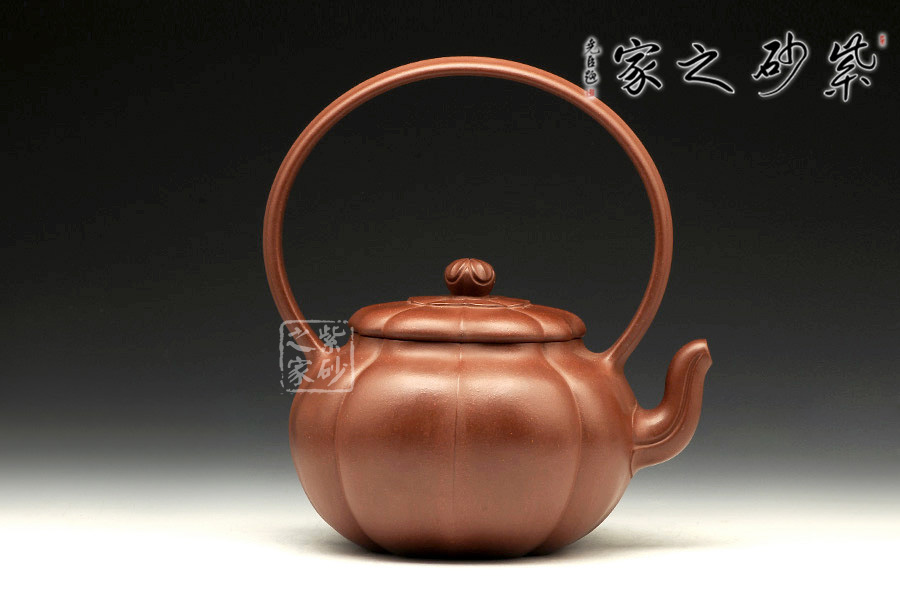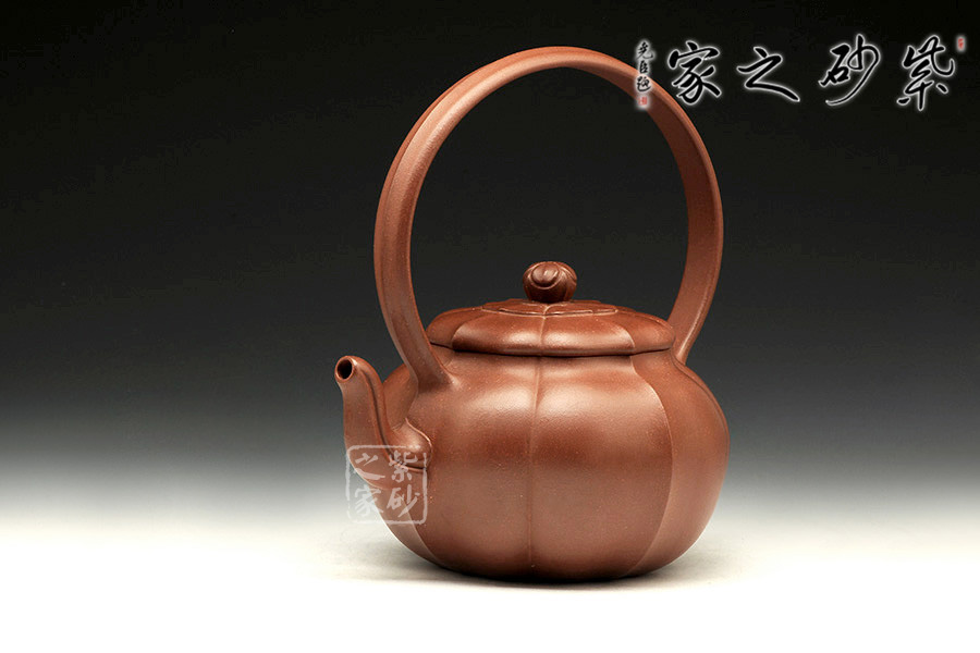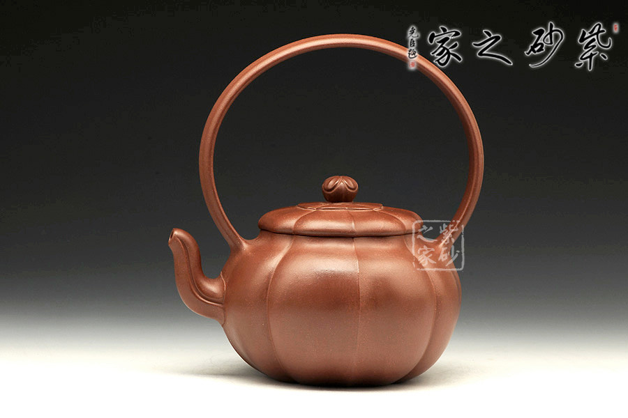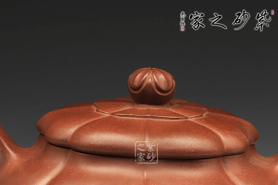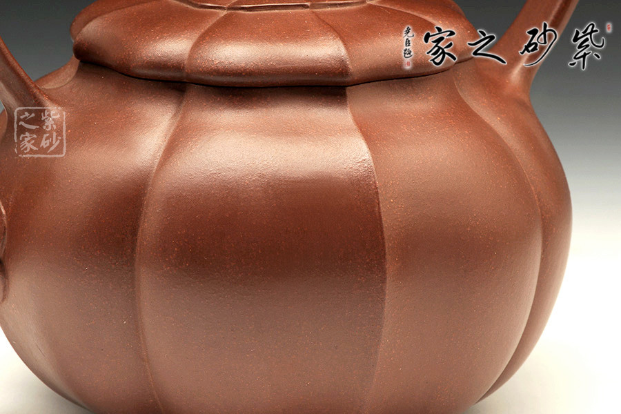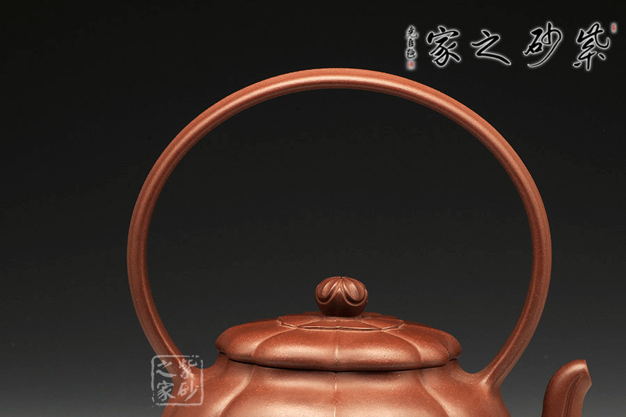 此作品融合了多種造型元素,花器+筋紋+提梁,將這三種元素結(jié)合在一起,設(shè)計巧妙,別出心裁。壺身為菱花造型,葉瓣片片分明,筋紋凹凸對應(yīng),線條十分飽滿有力,壺蓋處筋紋與壺身相銜接,使得它們成為了一個整體,制作難度更高。壺嘴亦有筋紋紋路延伸,提梁也加上了紋路裝飾,只是靜靜的放在那里,就是一種藝術(shù)的美感。