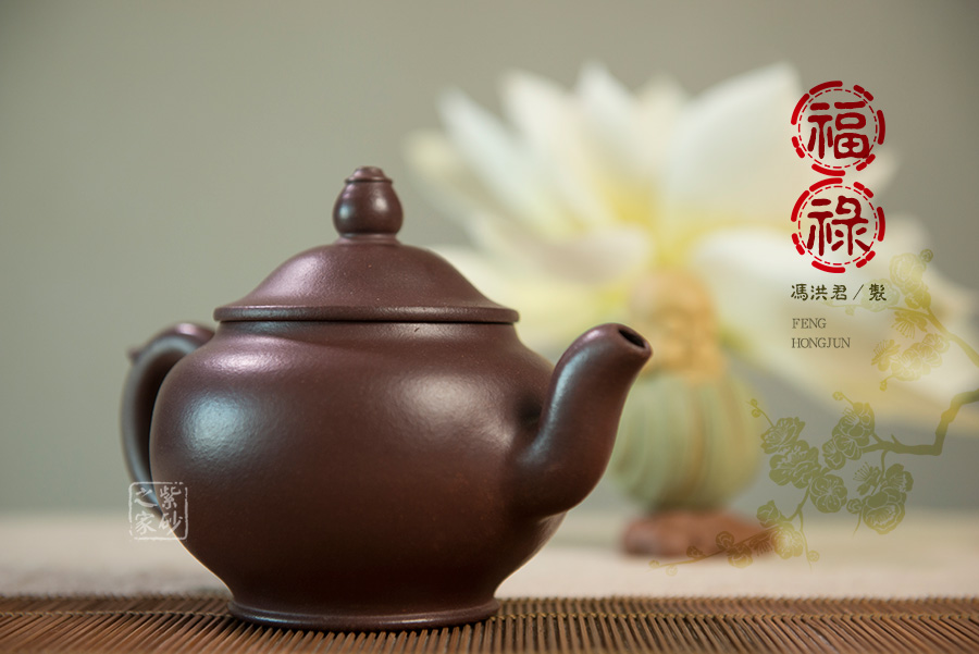 作品通身無任何裝飾,透出素雅的魅力。此壺器身古樸素雅,明潤光和,整器形制的線條十分流暢,壺體設(shè)計(jì)別出心裁。壺身飽滿光潔,流把胥出,與壺身渾然一體。壺底設(shè)圈足,做工精良。壺蓋平整,與壺的口沿貼合完美。壺鈕以葫蘆為原型捏制而成,與壺名“福祿”相協(xié)調(diào),富有韻味。整體形體完美,變化姿韻細(xì)膩,巧妙地借用紫砂造型傳達(dá)了吉祥美好的喻意。