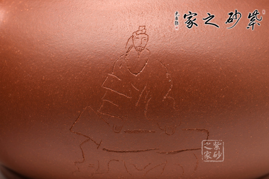 此壺圓球飽滿豐盈,壺蓋與壺口嚴(yán)絲密合,做工精細(xì)。壺嘴壺把挺翹,壺嘴出水有序,水勢(shì)洶涌;壺把捏握舒適。壺鈕為金豬造型,寓意金豬納福。壺身上兩面刻繪,一面‘琴音和會(huì)’,一面‘文人雅士彈奏’,相互迎合,仿佛在演奏一首動(dòng)人心弦的曲子。