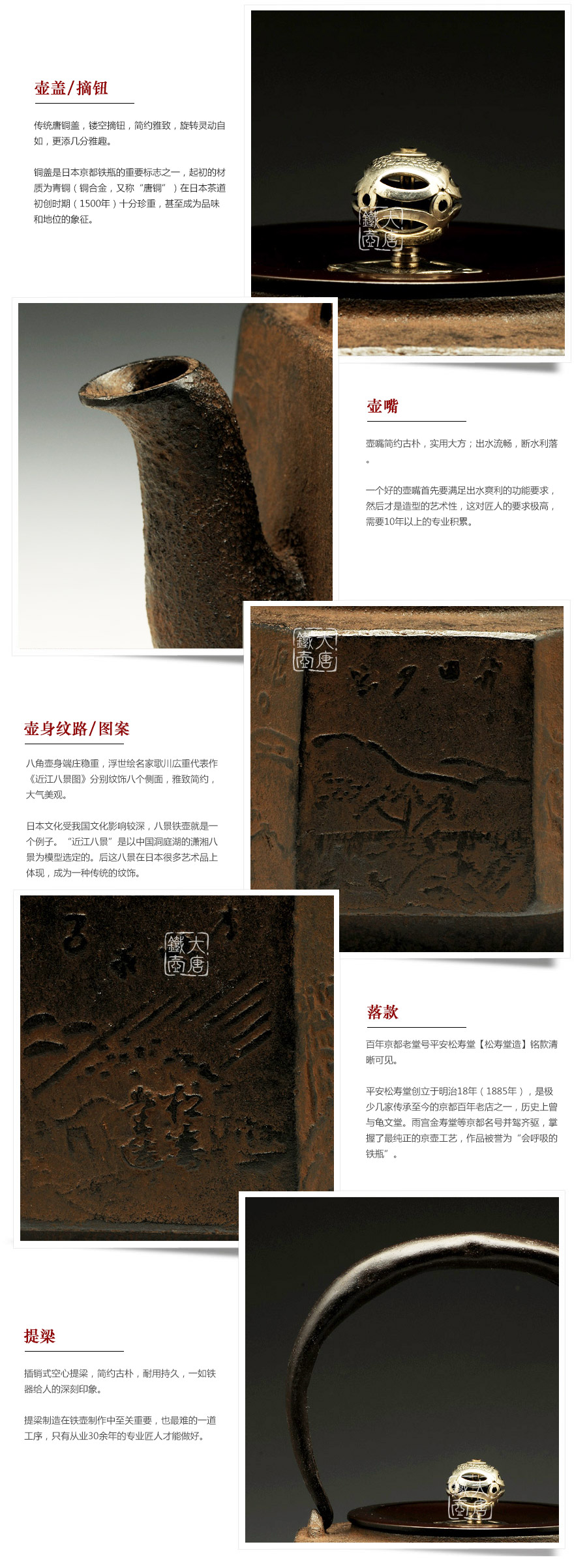 平安松壽堂(即松壽堂、西村松壽堂)是京都鐵瓶(也叫關西鐵壺)的典型代表,明治18年(1885年)由初代西村勝在京都寺町創(chuàng)建。平安松壽堂制作的鐵壺采用銅質(zhì)壺蓋,壺底內(nèi)側底部有板狀突起的“鳴金”,壺身或者提梁伴有金銀貴金屬鑲嵌的各式圖案或花紋,與京都寺町附近的龍文堂、雨宮金壽堂、云色堂等共同形成了獨特的京都鑲嵌特色。