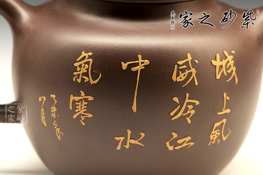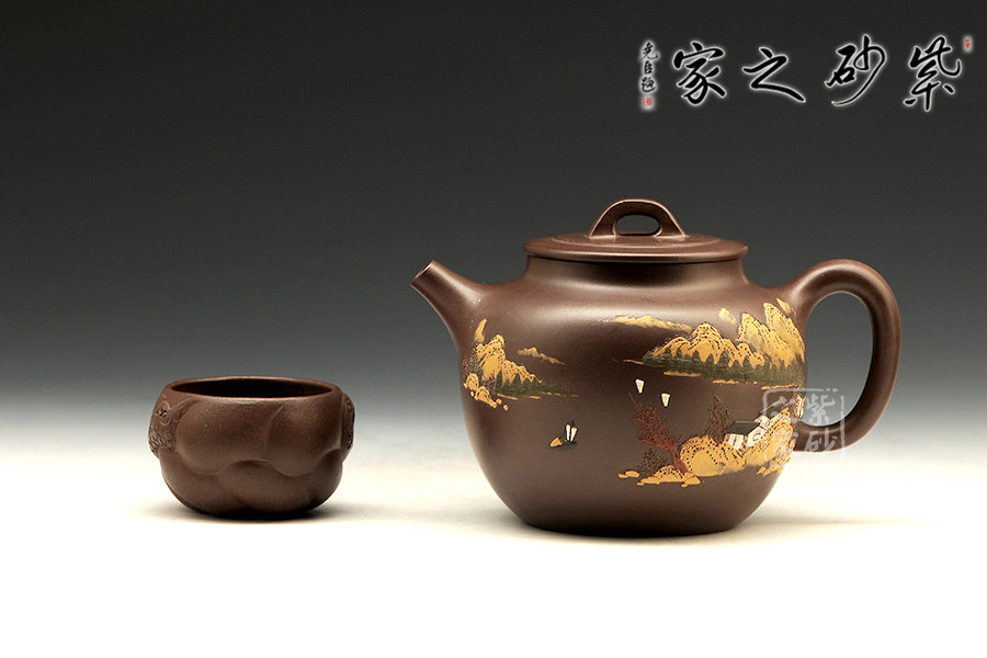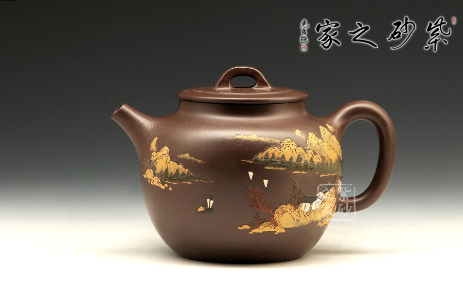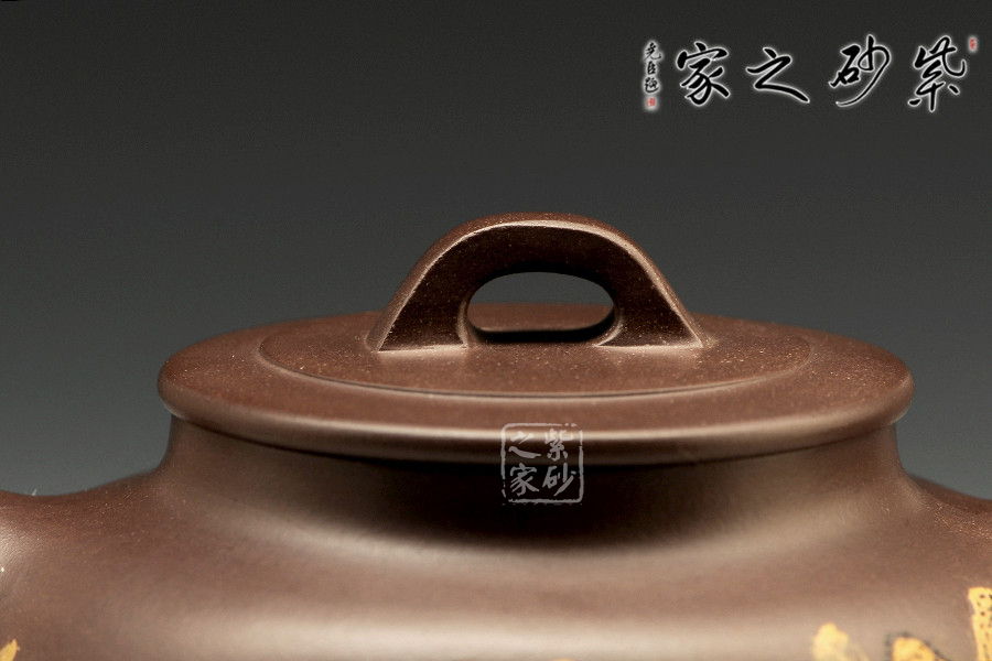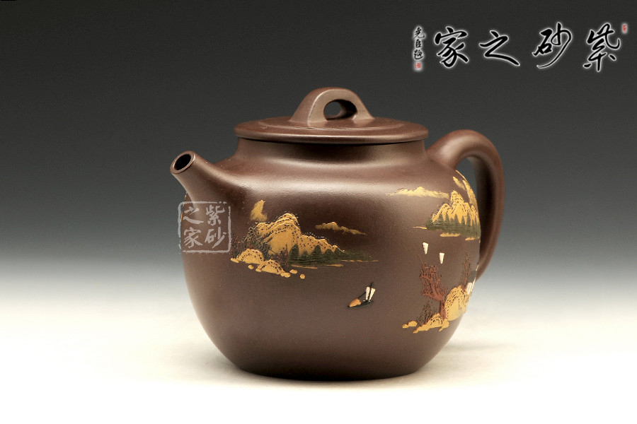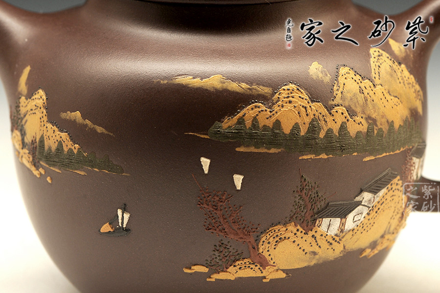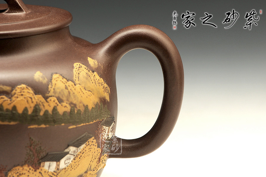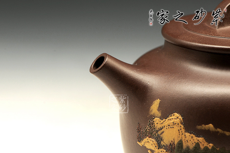 全手工制壺名家程彩華老師手制,精選原礦紫泥,靜穆高雅,古樸耐看。此壺鼓腹,有壺頸,直形壺流沖天而上,有股氣宇軒昂的霸氣;環(huán)耳把,與壺流相呼應(yīng);壓蓋之上橋形狀壺鈕呈四方設(shè)計(jì),圓中有方,線(xiàn)條融合甚佳。整器線(xiàn)條流暢和諧、厚實(shí)穩(wěn)重。以泥繪裝飾壺身,難度較大,成品率相對(duì)較低,泥繪畫(huà)營(yíng)造出空靈的山水意境圖。