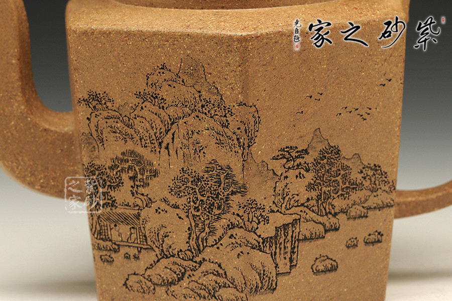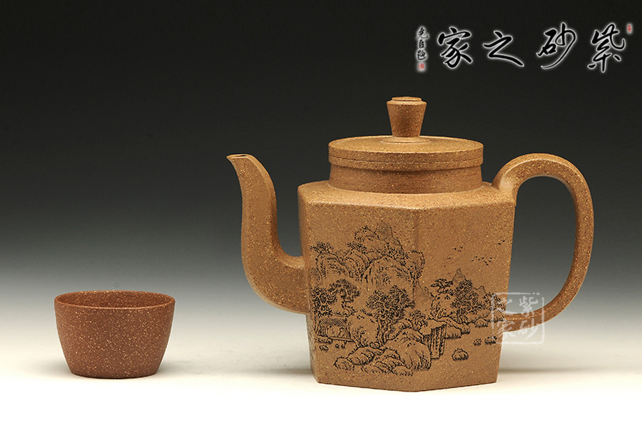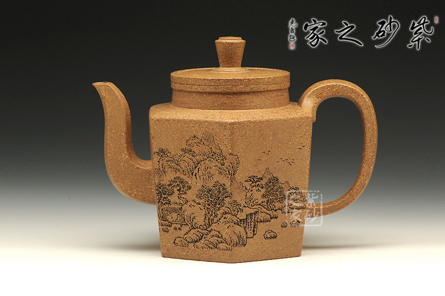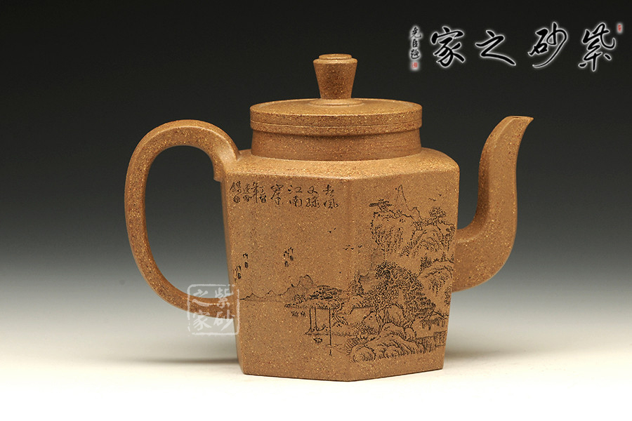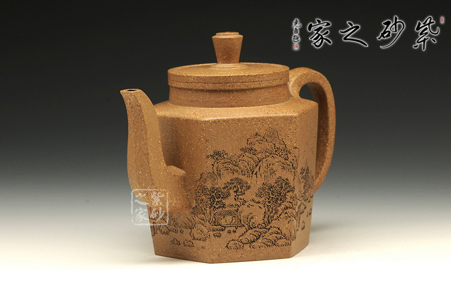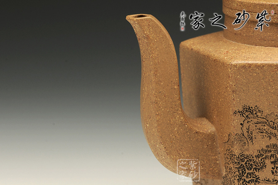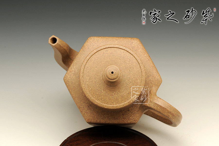 壺身由六片大小相同的長方形平面組成一個菱柱形體,形態(tài)自然,無銜接之感。壺嘴、壺把和壺口處于同一高度;壺蓋圓形,中有圓錐形紐,可能與時大彬的“天圓地方”的觀念有關。大彬六方兼具傳統(tǒng)與現(xiàn)代意味,淳樸率真、古雅大氣。