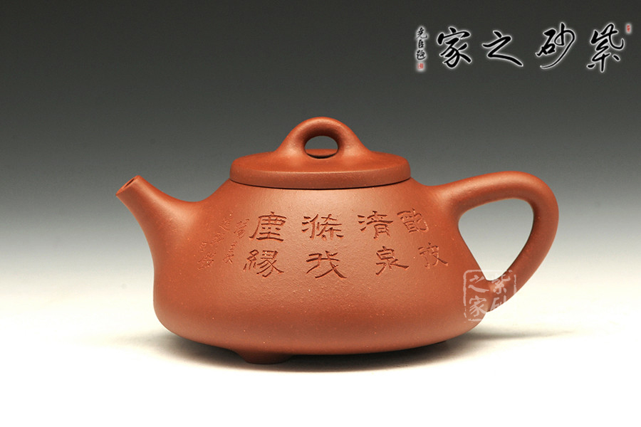 此石瓢壺造型簡(jiǎn)練,敦厚調(diào)和,壺身圓潤(rùn),線條柔和,壺嘴為修長(zhǎng)的直流嘴,暗接手法與壺身相連,環(huán)形壺把同樣采用暗接手法與壺身相連,而壺嘴與壺身兩者遙相對(duì)望,相對(duì)稱。愛壺者如果再仔細(xì)看,可看出整個(gè)壺型如同一個(gè)等腰三角形,壺身是個(gè)大三角,相當(dāng)穩(wěn)重的三角形再加上三乳足鼎立,整個(gè)器型便更加穩(wěn)實(shí)。