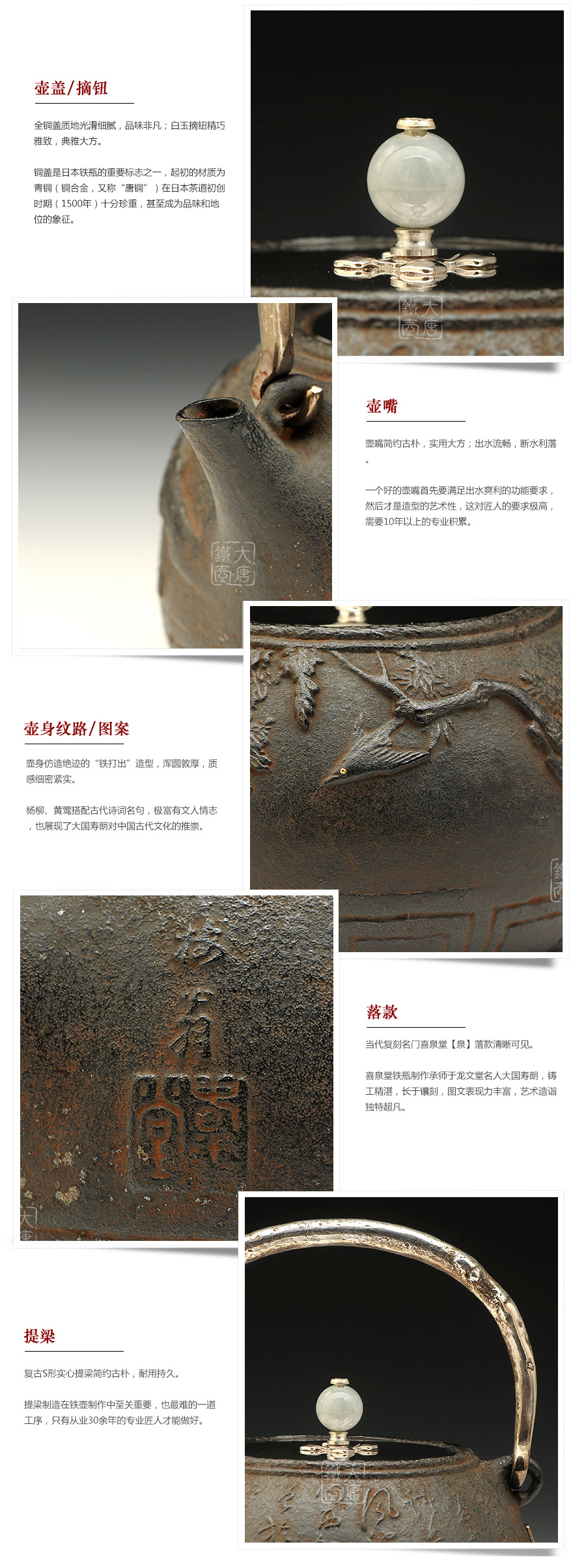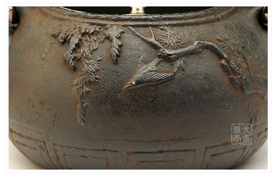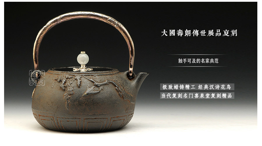 喜泉屋坐落于擁有400年鑄物歷史的富山縣高岡市, 是伴隨著一代代高岡鑄物師的自豪和榮耀流傳至今的百年堂號(hào)。幾百年來(lái),喜泉堂繼承了金屋町匠人世代沿襲的古法技藝和審美意識(shí),不斷追求極致完美,以匠人之心巧妙融入現(xiàn)代生活元素,不斷創(chuàng)作著具有天工之美的茶道藝術(shù)和工藝品。喜泉堂鐵瓶制作承師于龍文堂名人大國(guó)壽朗,鑄工精湛,長(zhǎng)于鑲刻,圖文表現(xiàn)力豐富,藝術(shù)造詣獨(dú)特超凡。