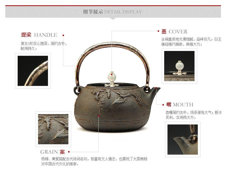 當(dāng)代復(fù)刻名門喜泉堂復(fù)刻精品,壺身仿造絕跡的“鐵打出”造型,渾圓敦厚,質(zhì)感細(xì)密緊實(shí)。楊柳、黃鶯搭配古代詩(shī)詞名句,極富有文人情志,也展現(xiàn)了大國(guó)壽朗對(duì)中國(guó)古代文化的推崇。