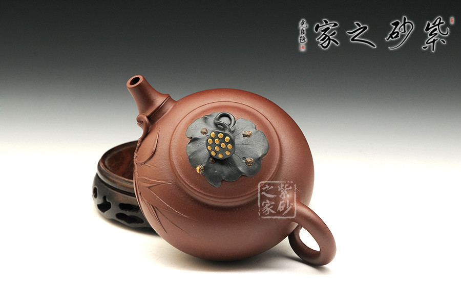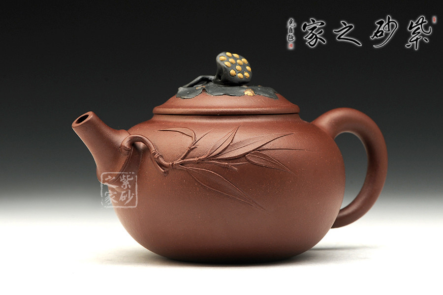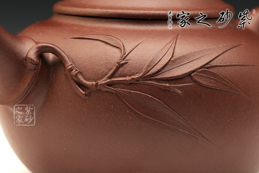 喜事連連是款寓意極佳的作品,選用原礦紫泥制作,色澤內(nèi)斂,入手生溫,全手工制作精致。欣賞此器,如沐竹林荷葉間,享受自然的樂趣。整器飽滿圓潤,線條柔和自然,配以微微隆起的壓蓋,別有一番意韻。壺蓋之上,一垂頭睡蓮當(dāng)頭而置,蓮心相連,祝福溢滿。壺嘴厚實又似竹節(jié),上清雅竹葉續(xù)出,貼于壺身,甚是好看。