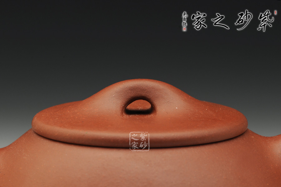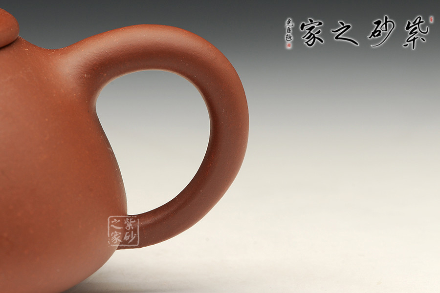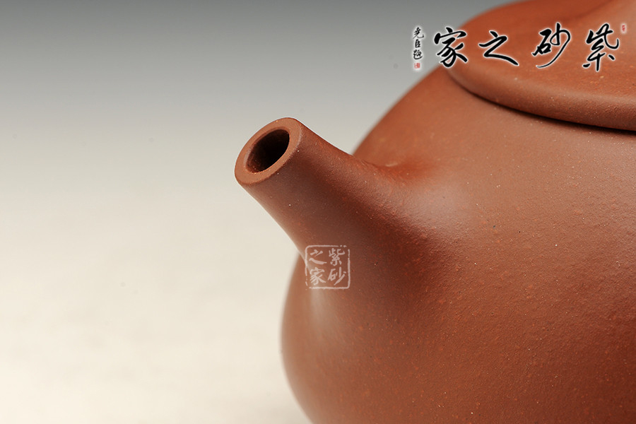 此款壺橋鈕看起來肥大然而提捏之處細膩,拿捏方便,鈕孔形成一個飽滿規(guī)整的扁圓,足見做工精細。平蓋壓口,從蓋沿線可以看出壺蓋質(zhì)薄而形堅,且略大于壺口,形成完整的鎖口之勢,氣密性極佳。整款壺壺身較矮,口蓋略大但不覺過分寬闊,壺腹飽滿敦厚,顯示出渾厚的內(nèi)蘊。直流嘴略微呈錐形,嘴口看似喇叭狀,出水爽利,流勢酣暢淋漓,趣味性十足。整體來說,此壺收斂了鋒芒和棱角,表現(xiàn)出了細膩如一的感覺,是上上之作。