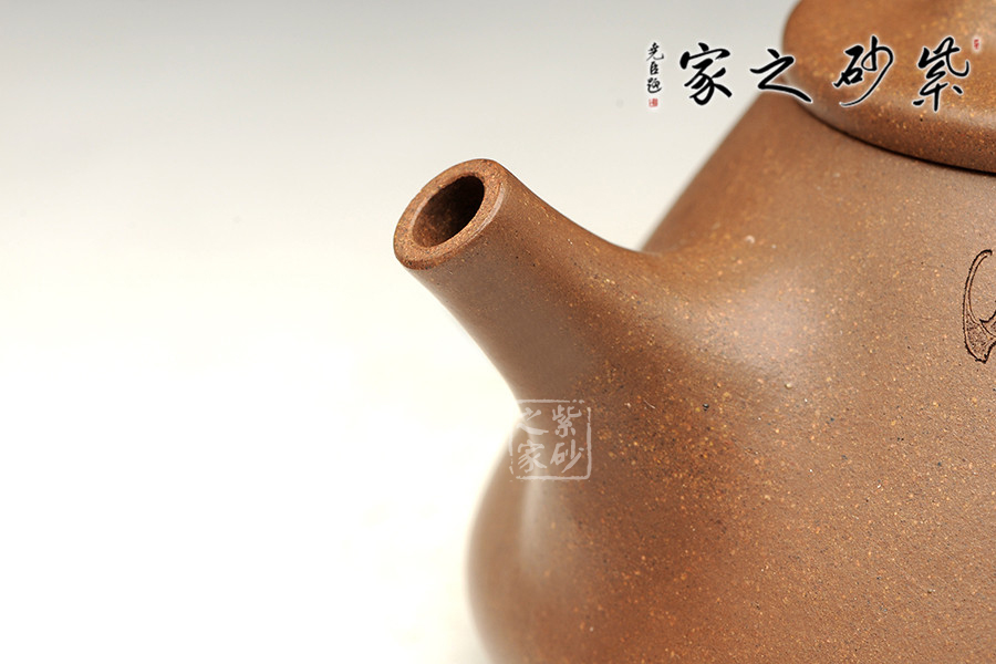 整款器型非常到位,石瓢挺俊之美表達(dá)得盡善盡美、淋漓盡致。橋鈕看起來肥大然而提捏之處細(xì)膩,拿捏方便,鈕孔形成一個(gè)飽滿規(guī)整的扁圓,足見做工精細(xì)。平蓋壓口,從蓋沿線可以看出壺蓋質(zhì)薄而形堅(jiān),且略大于壺口,形成完整的鎖口之勢,氣密性極佳。口蓋略大但不覺過分寬闊,壺腹飽滿敦厚,顯示出渾厚的內(nèi)蘊(yùn)。直流嘴略微呈錐形,嘴口看似喇叭狀,出水爽利,流勢酣暢淋漓,趣味性十足。