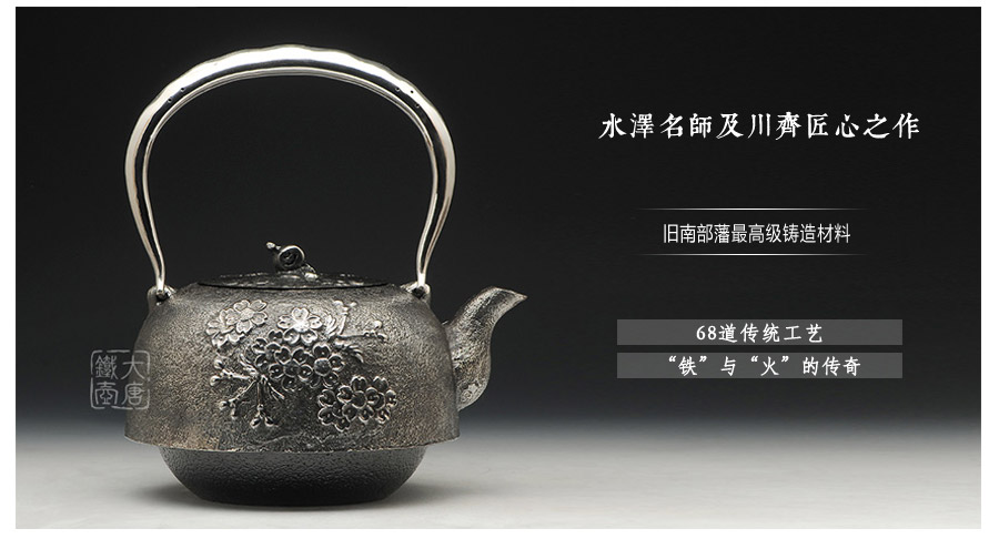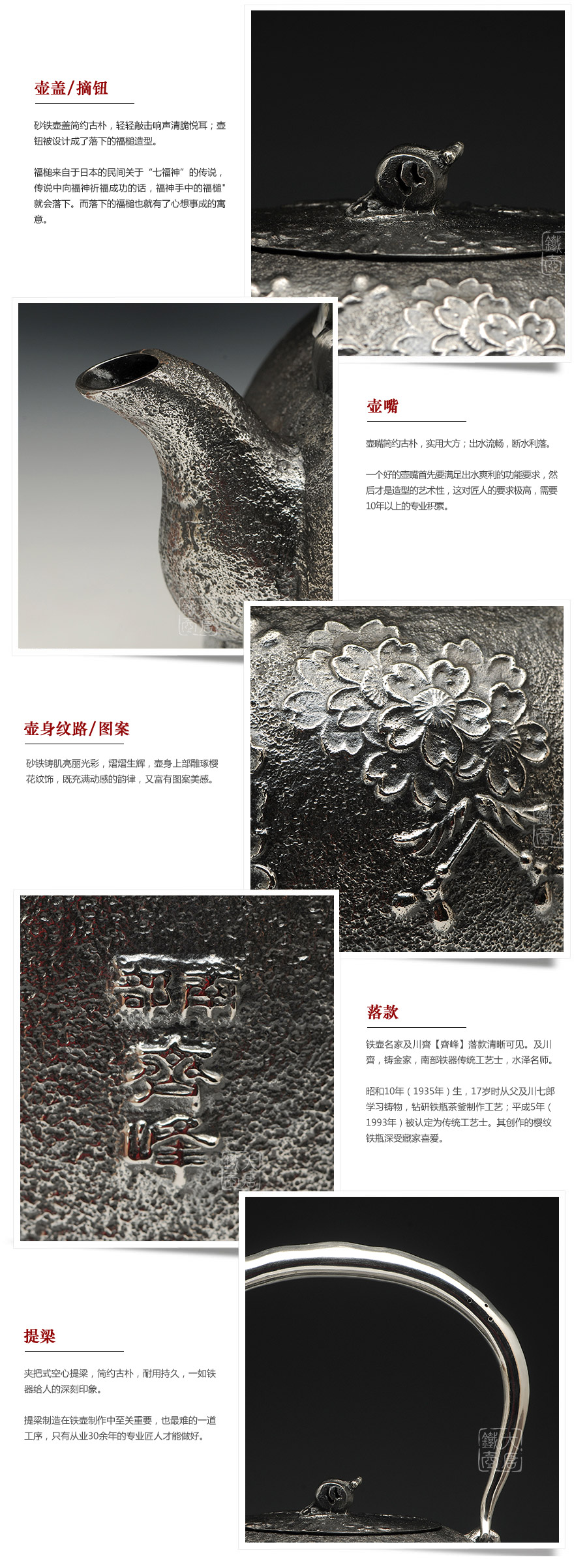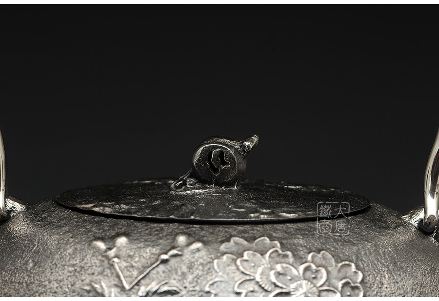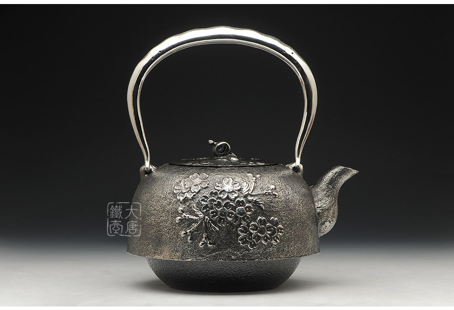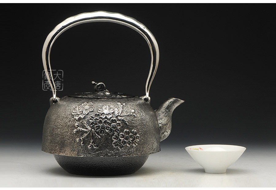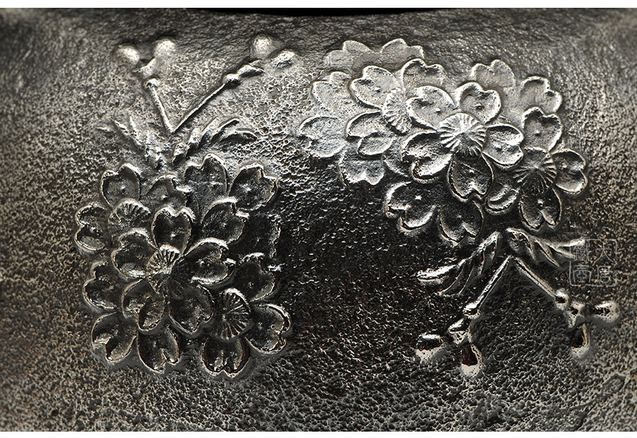 南部水澤名師及川齊作品,日本最高級砂鐵原料,砂鐵鑄肌亮麗光彩,熠熠生輝,壺身上部雕琢櫻花紋飾,既充滿動感的韻律,又富有圖案美感。