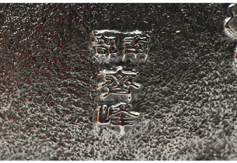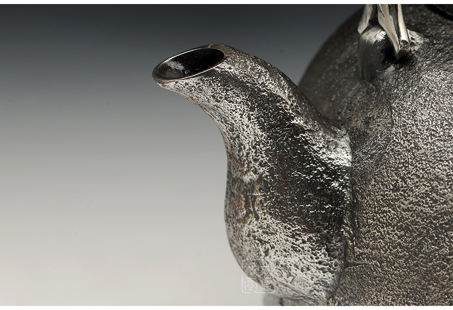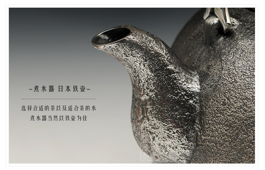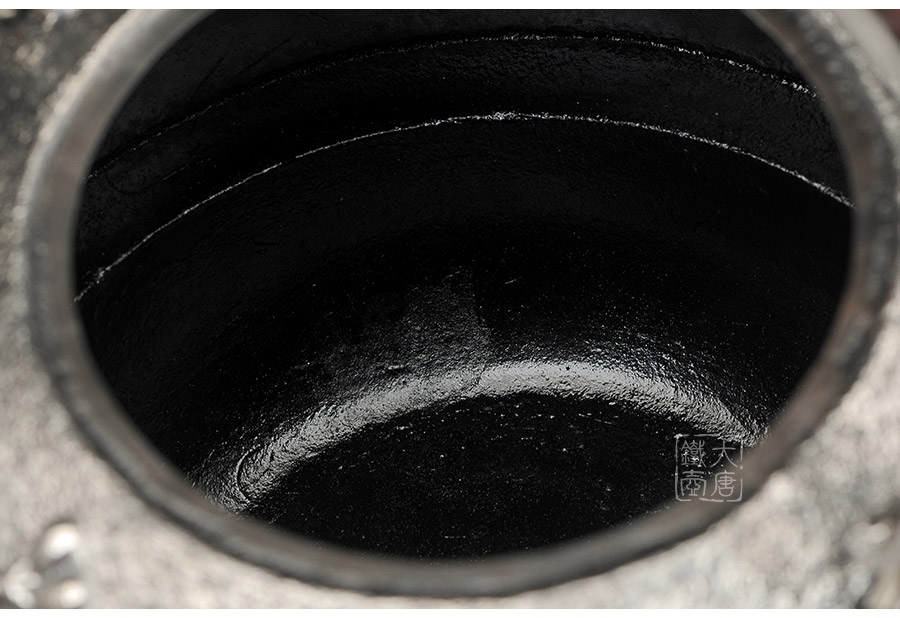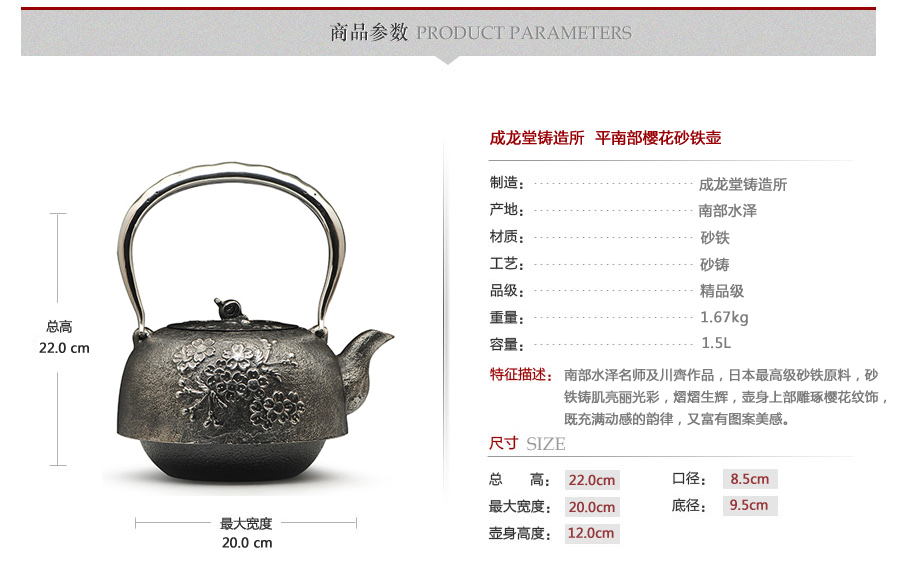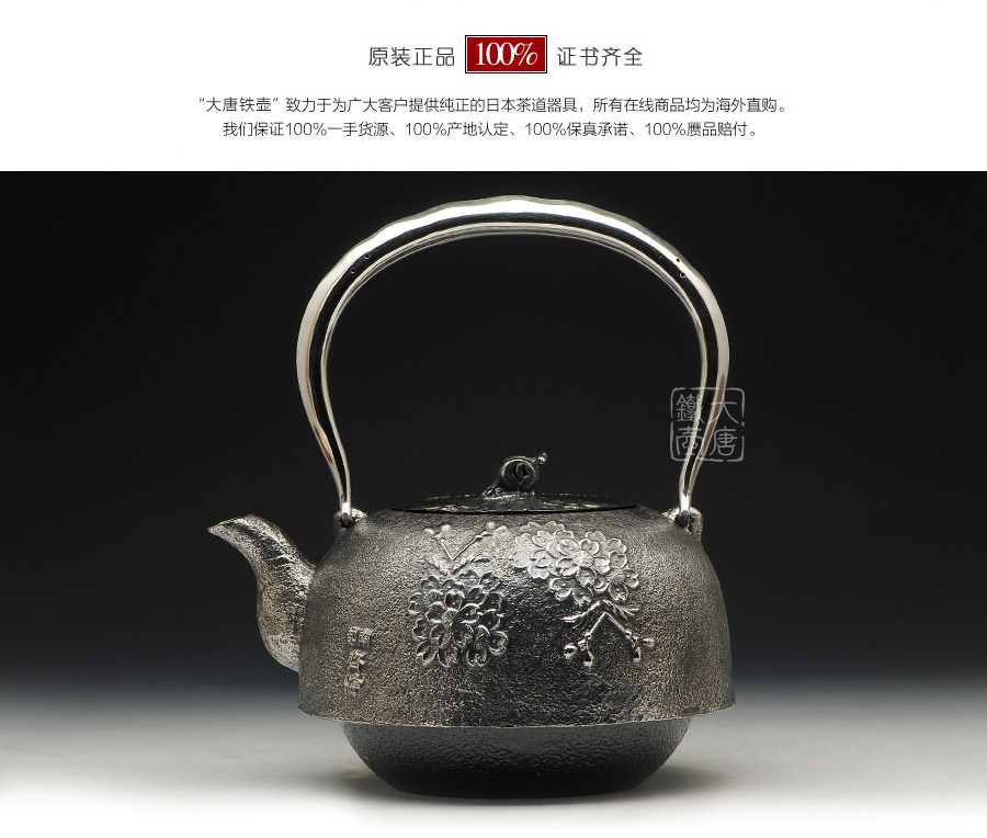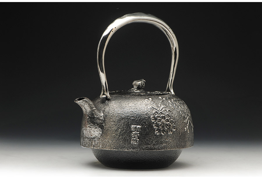 南部水澤名師及川齊作品,日本最高級砂鐵原料,砂鐵鑄肌亮麗光彩,熠熠生輝,壺身上部雕琢櫻花紋飾,既充滿動感的韻律,又富有圖案美感。