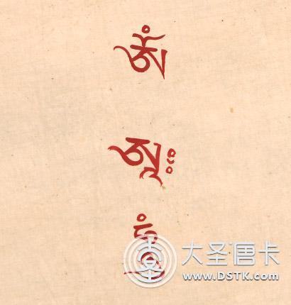 唐卡畫完后開光時,高僧大德一般在唐卡背面佛像,口意種子字"唵阿哞",以顯現其加持之力。"唵阿哞"三種子字是三世諸佛的心髓,也是一切佛菩薩身語意的根本種子字。