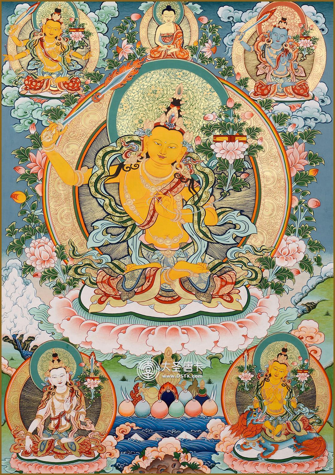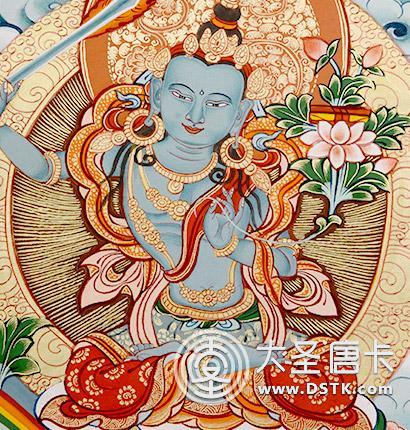 文殊菩薩又稱法王子,為智慧之象征,身金色,形如童子,五髻冠其項,右手持金剛寶劍(表示智能之利),能斬群魔,斷一切煩惱,左手持青蓮花,花上有金剛般若經卷寶,象征所具無上智慧,坐于蓮花臺上。