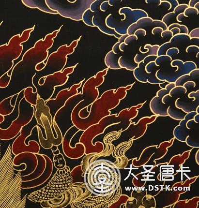 采用涂金、磨金、勾金線、刻金、染金的絕技,將金色分成多種冷暖變化,在黑地上用金線勾畫十幾種不同的層次效果,對比強烈,畫面富麗堂皇。