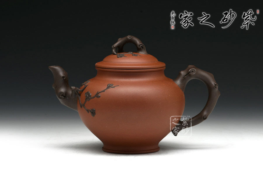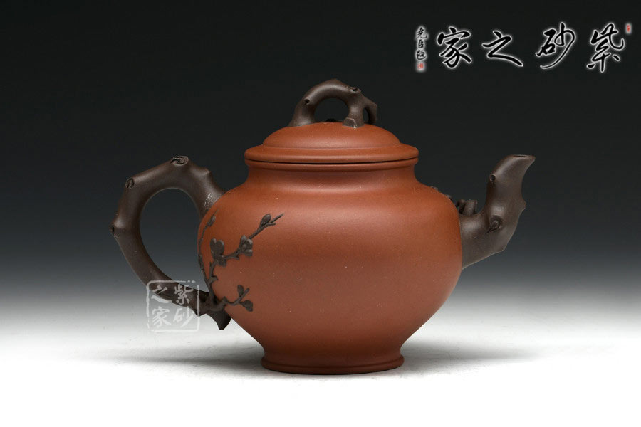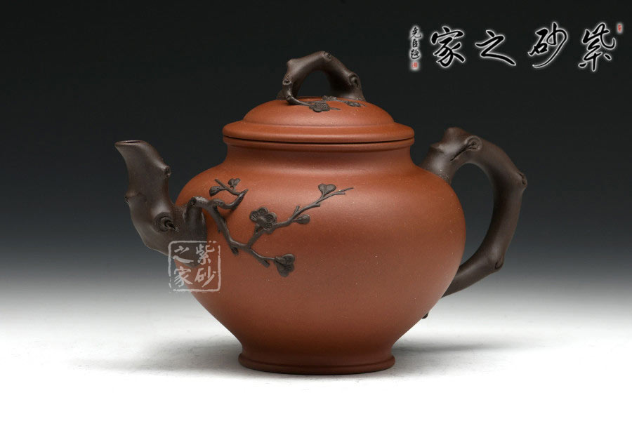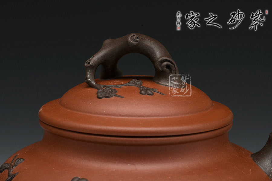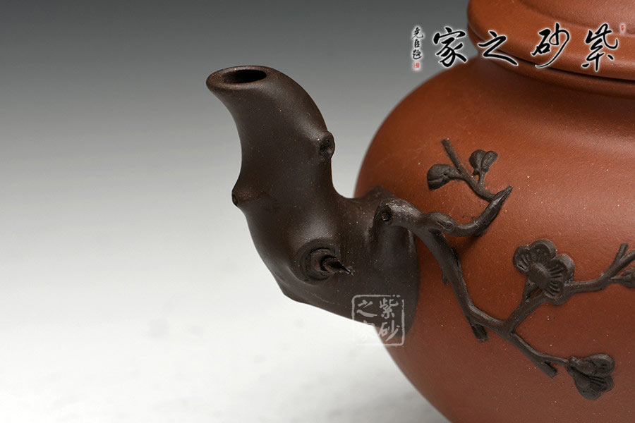 老師以其物色的雙色泥制作而此,在色彩上形成鮮明對比,增強(qiáng)視覺效果。壺以心形為壺體,有一種脫俗的端秀之美,以雕鏤捏塑等各種手法表現(xiàn)梅枝的挺秀與拔萃、梅蕊的嬌柔與靈韻。報(bào)春之意體現(xiàn)在壺嘴的梅枝、壺身一枝梅、壺蓋的枝干紋飾上,報(bào)得春意不須萬花遍叢,只需一枝梅暗自開放,而渾厚的紫砂色把梅花的素雅與幽獨(dú)超逸表現(xiàn)的淋漓盡致。