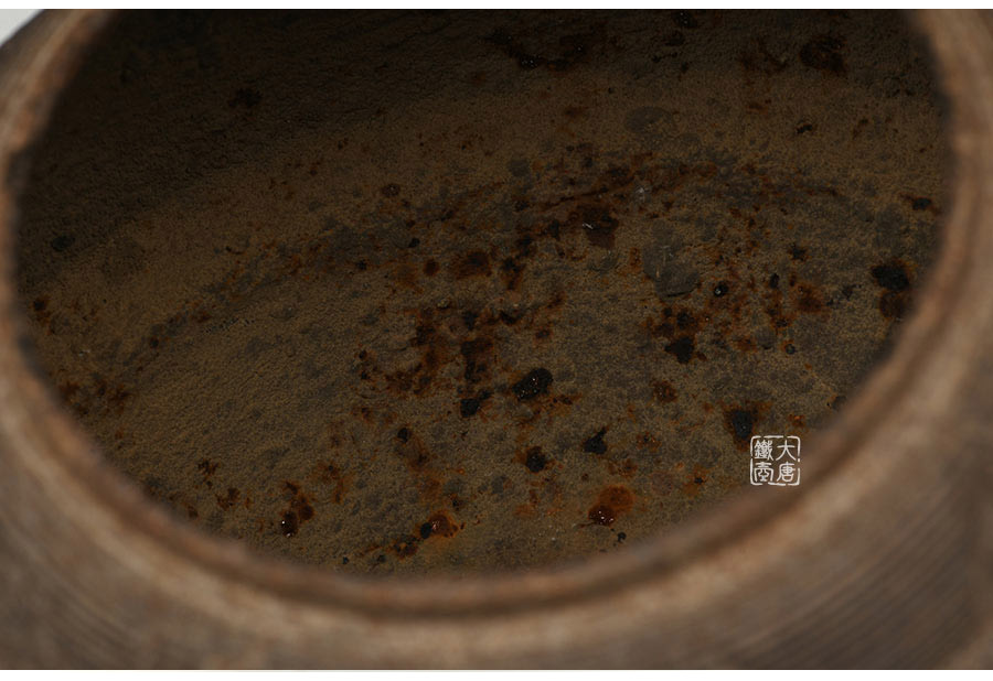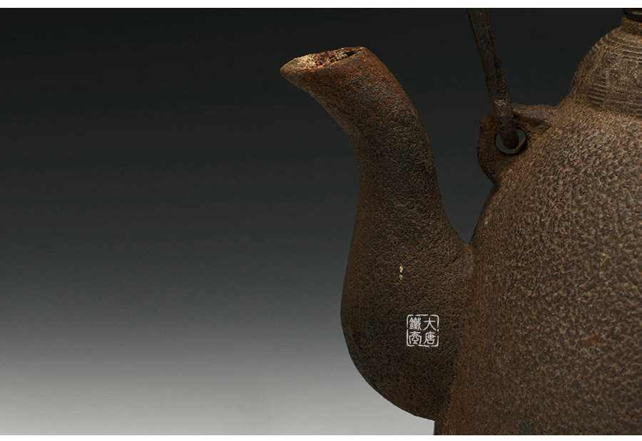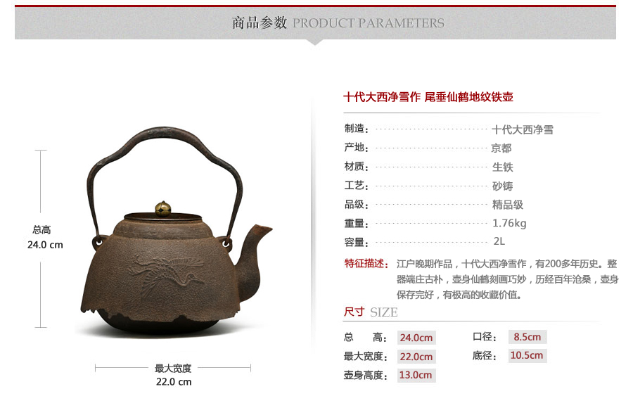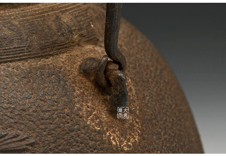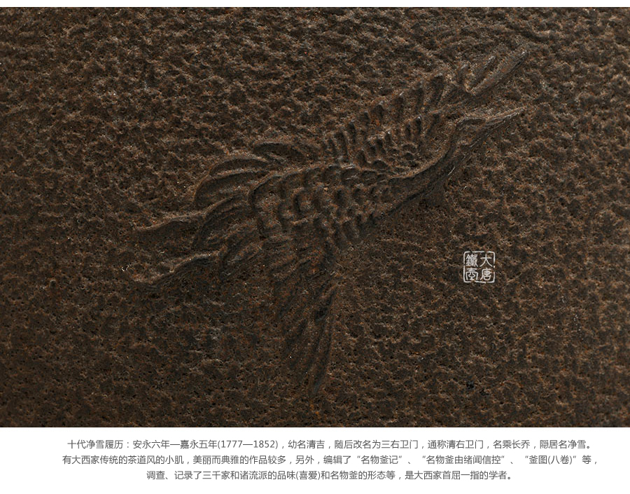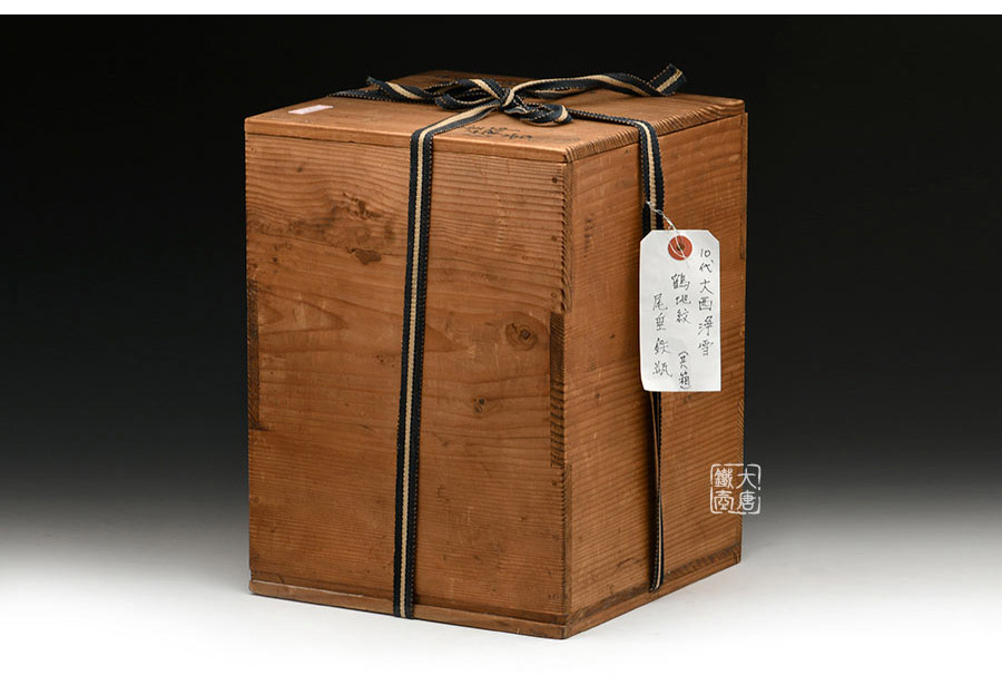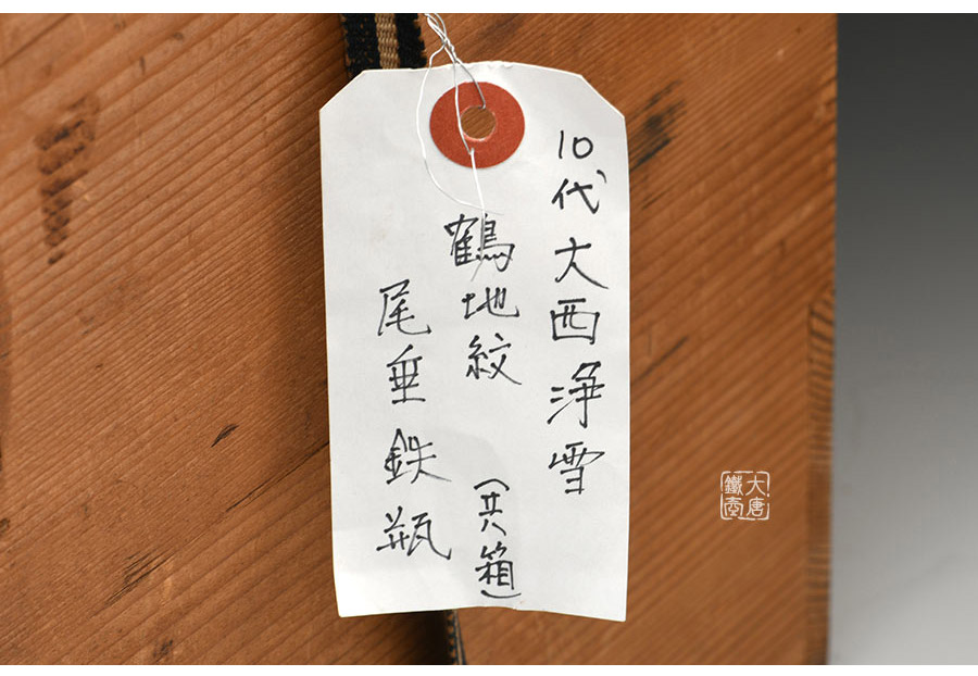 有原裝共箱,此壺作者為著名釜師十代大西清右衛(wèi)門(mén)(凈雪)(1777 - 1852),千家十職之御用釜師。尾垂形制,壺身仙鶴地紋,韻味十足卻不失大氣,此器為天保年制(1830~1844),堪為收藏佳品。
