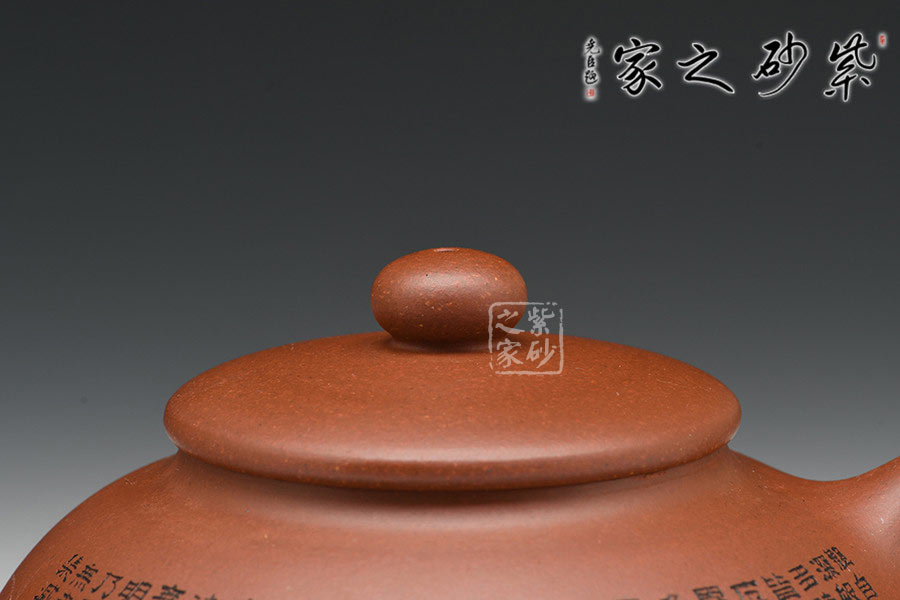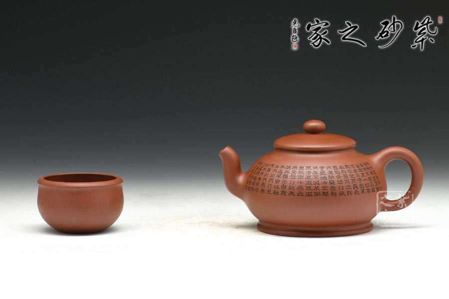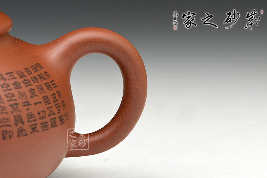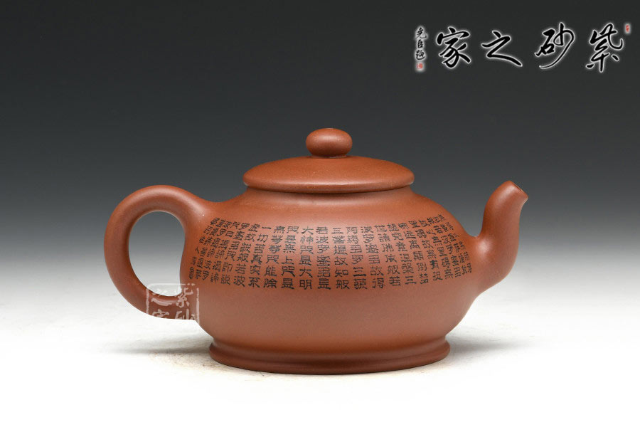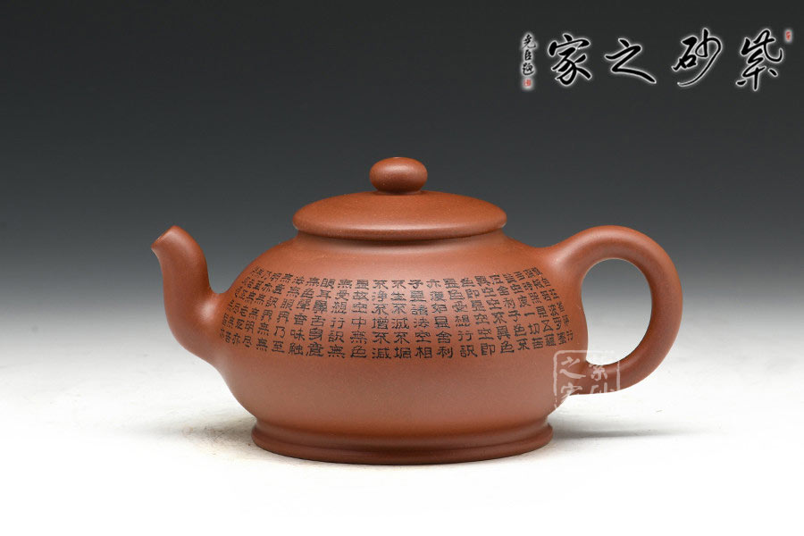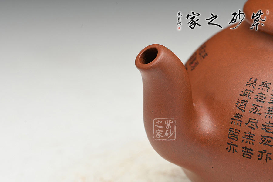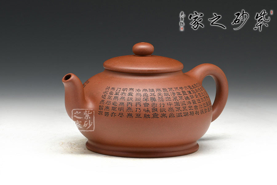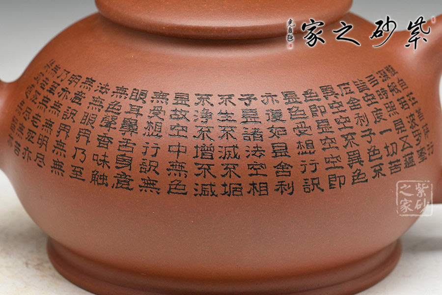 有著渾圓的壺身,上斂下豐,如花苞之形,壺鈕圓潤挺拔,壓蓋內斂,更顯壺身的飽滿,壺底線條流暢至極,比例得當,點線之間見出魅力,骨肉亭勻,簡練大方,制作頗見功 力;壺嘴采用彎流嘴,玲瓏可愛,小巧佳人,壺柄略微上抬之后優雅滑落而下,形成一條圓潤飽滿的耳形弧線,樸雅大方;壺身陶刻《般若波羅蜜多心經》,頗有禪意,品茗養心,清凈幽深。