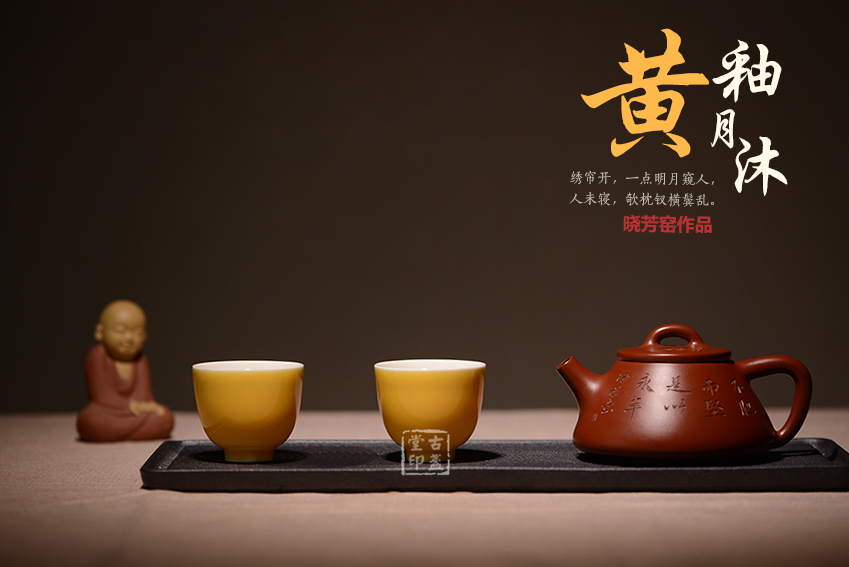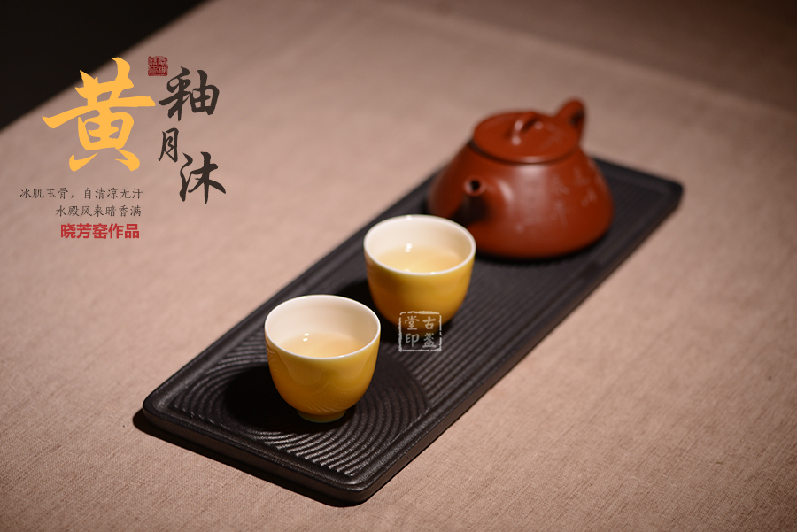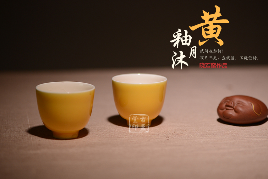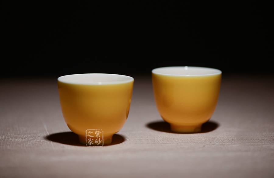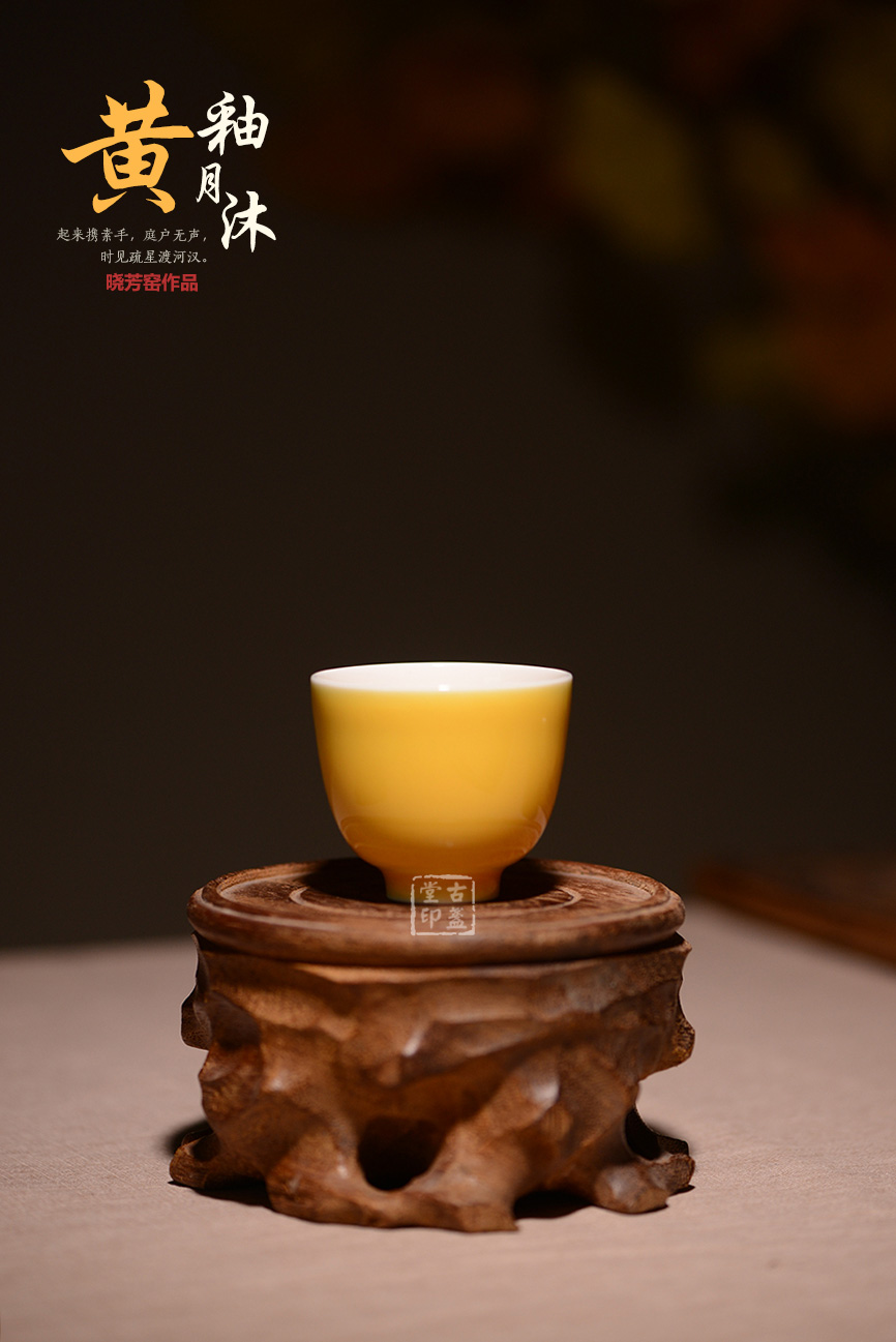 黃釉,是以氧化鐵、氧化鎂、氧化錫為著色劑,在氧化氣氛中燒成的釉色。黃色一向是帝王專用色,黃釉瓷器更是明清宮廷用瓷,絕不許民間使用。此款黃釉沐月釉色鮮艷奪目,氣質高貴非凡。規整的器形,簡單大方的設計,讓此款品茗杯備受茶人的關注。一價雙盞,經濟實惠,送人自用皆宜。