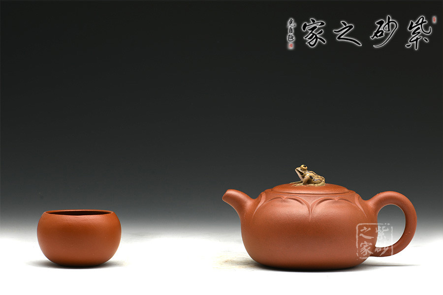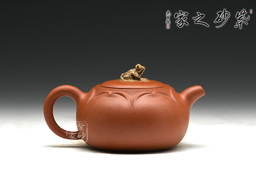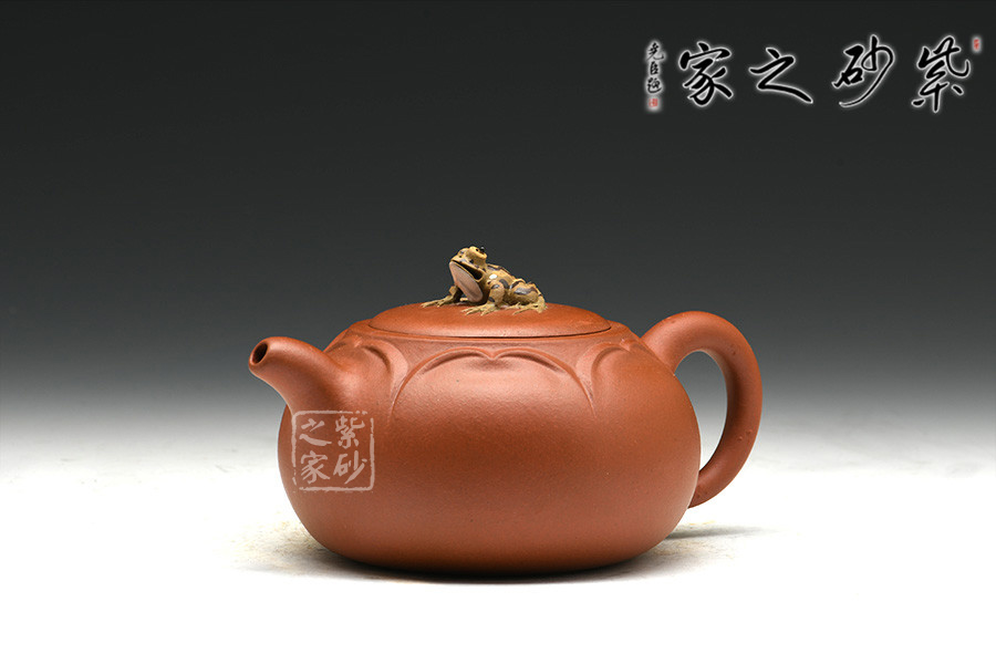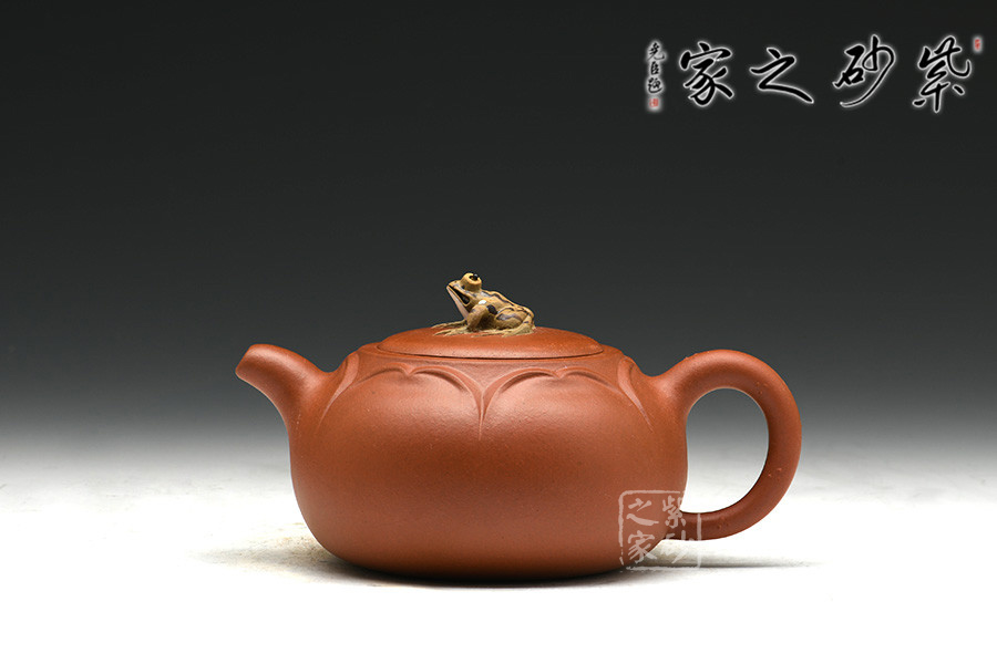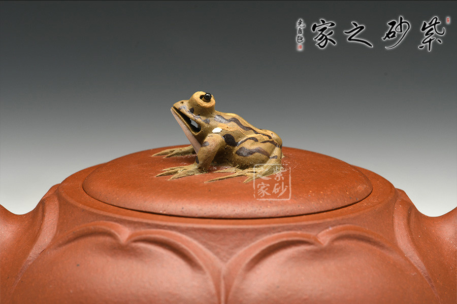 花瓣似開未開,嬌羞可愛,壺鈕恰如其分以青蛙襯景,畫面和諧唯美,靜雅有聲。壺嘴、壺把設計獨到,天然雕成,整體敦厚雅致,動靜交融。