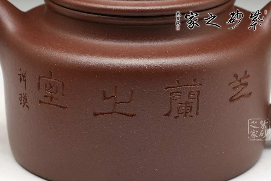 許瑛,師從中國工藝美術大師毛國強,其作品風格秀氣雅致,構思精巧,作品曾在曼生杯陶刻大賽中被評為最高獎。德鐘壺,無法超越的經(jīng)典壺形,此壺造型莊重,儒雅大度,沉穩(wěn)周正,圓潤涵光。該壺端莊穩(wěn)重、比例協(xié)調(diào)、結(jié)構嚴謹。壺身造型取自“盅”型,圓型平紐與器身形似,直流、耳把,有清正直諫君子之風度。壺口上下起圓線,壺肩線條圓轉(zhuǎn),過度極其自然,耳把根部與肩線自然結(jié)合,各自延伸化轉(zhuǎn),呈疏朗大氣之韻。