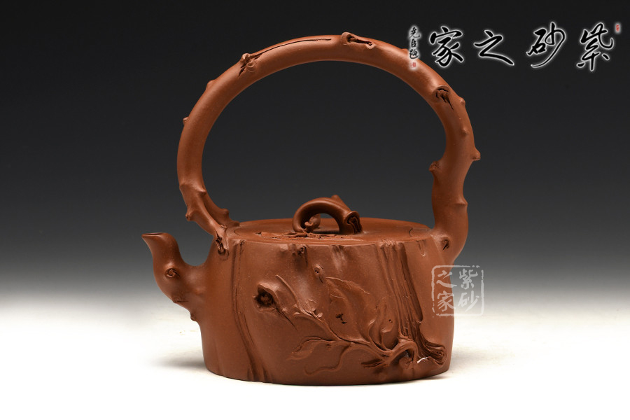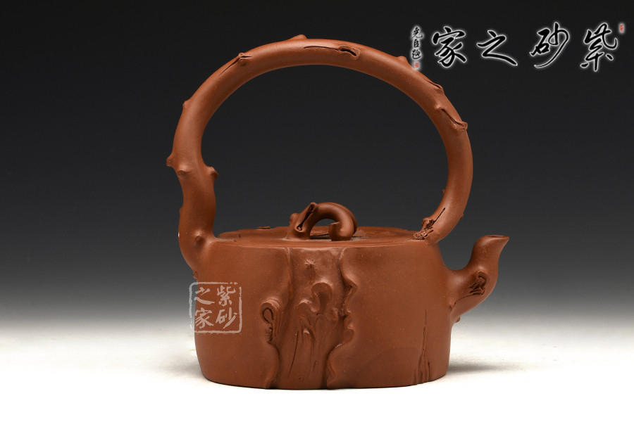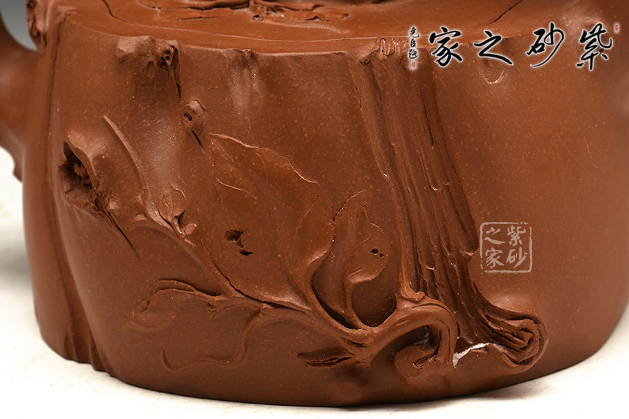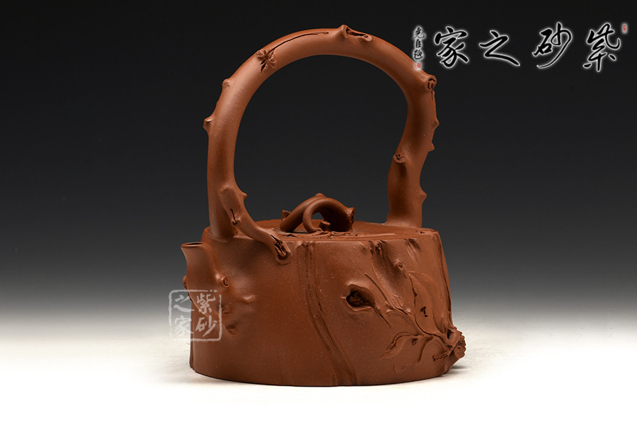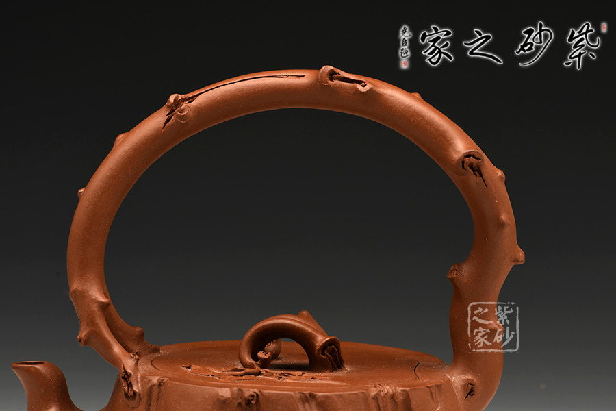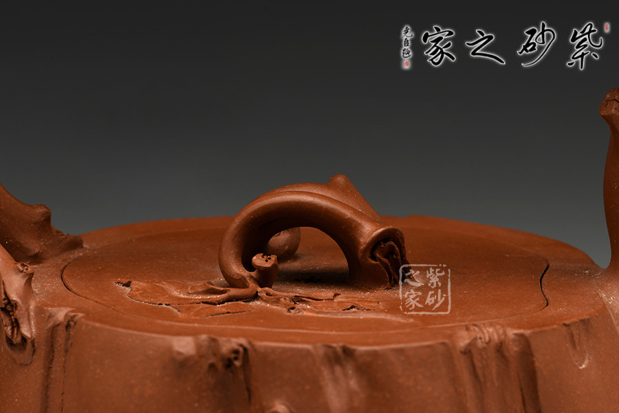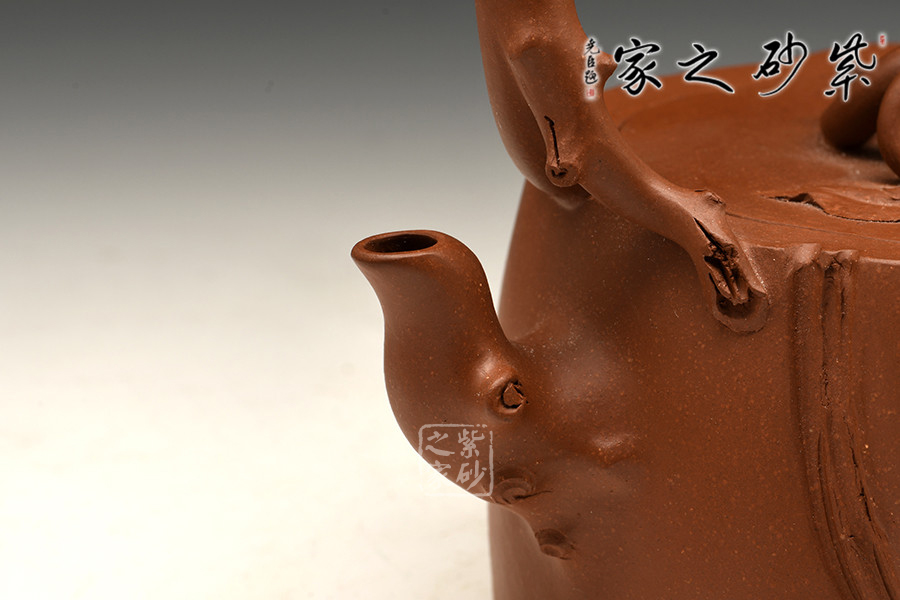 這款壺屬于花器壺型,是作者沈蘭萍非常擅長的一款壺型。作品整器看上去是一方開枝散葉的樹樁,穩(wěn)重敦實,壺口壺蓋嚴絲合縫,渾然一體。樹枝化作三彎嘴、橋型鈕、提梁把,一彎一扭、自然流暢,一派勃勃生機的景象。