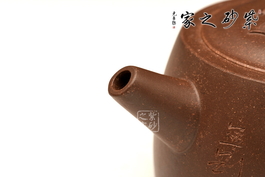 通觀此壺,整器以敦實(shí)古樸見長,線條簡(jiǎn)潔,點(diǎn)線面銜接恰到好處,不乏韻味。壺身短柱形,略呈上斂下豐之勢(shì)。直嘴出水好,斷水便,壺把把持得手,如意弧形鈕,甚是精美。整款壺全圈底接地,穩(wěn)重敦實(shí),既有渾厚之姿,又不乏流曲之美。