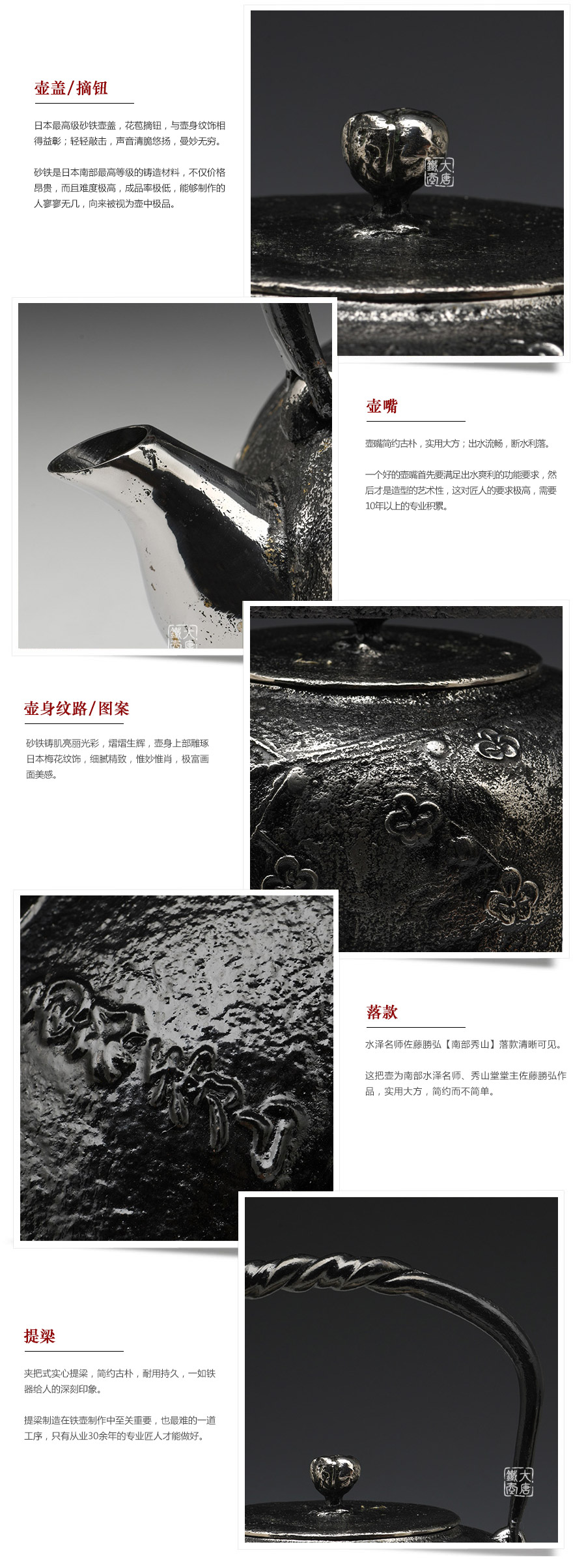 秀山堂當(dāng)代鑄物師佐藤勝弘先生是日本工藝會正式會員,專事南部鐵器制作30余年,擅長砂鐵壺制作,在業(yè)界備受關(guān)注。1993年在鑄物創(chuàng)作展上榮獲巖手縣知事金獎。平成19年12月認(rèn)定傳統(tǒng)工藝士,制作的南部鐵瓶被經(jīng)濟(jì)大臣指定為傳統(tǒng)工藝品,多次入選日本傳統(tǒng)工藝展并受賞。
