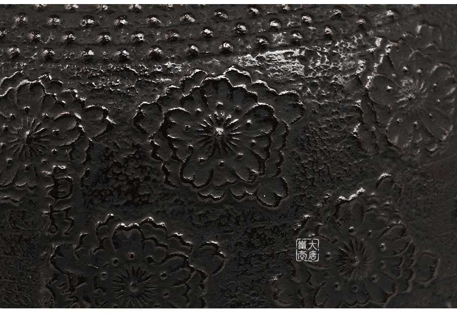 水澤名師佐藤勝芳作品,壺身經(jīng)典南部霰紋,并搭配日本國(guó)花櫻花,霰點(diǎn)銳利精巧,富有秩序化的韻律。