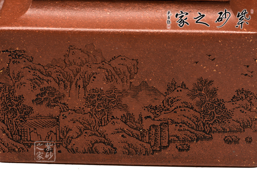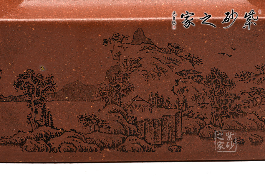 通體裝飾: 裝飾: 山水畫刻 裝飾者:徐建剛 裝飾內(nèi)容: 有山,有水,有樹,有亭,再加上置身其中的三兩人,構(gòu)成了一幅意境幽遠(yuǎn)的山間美景圖