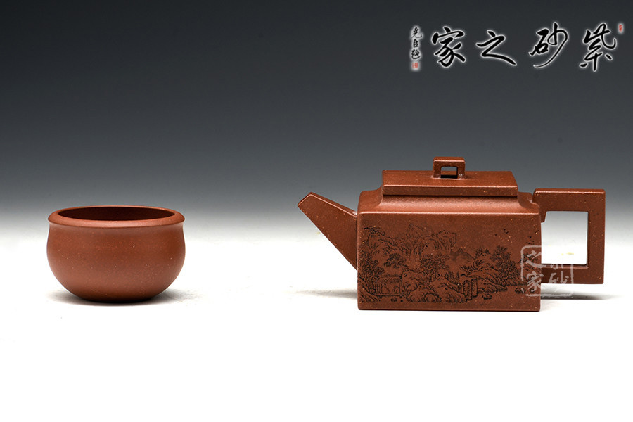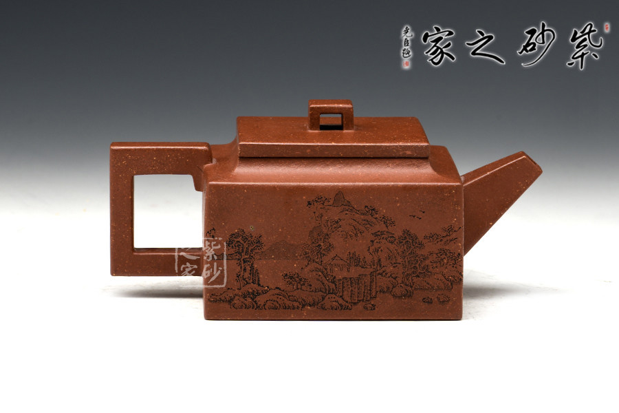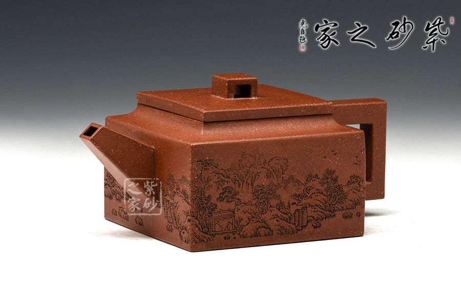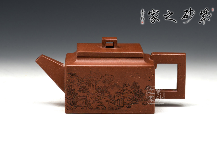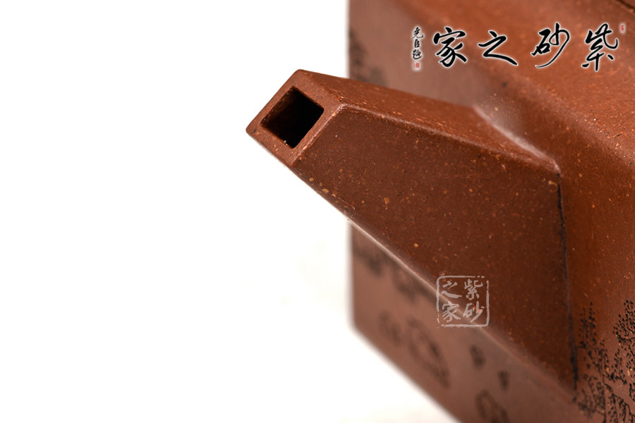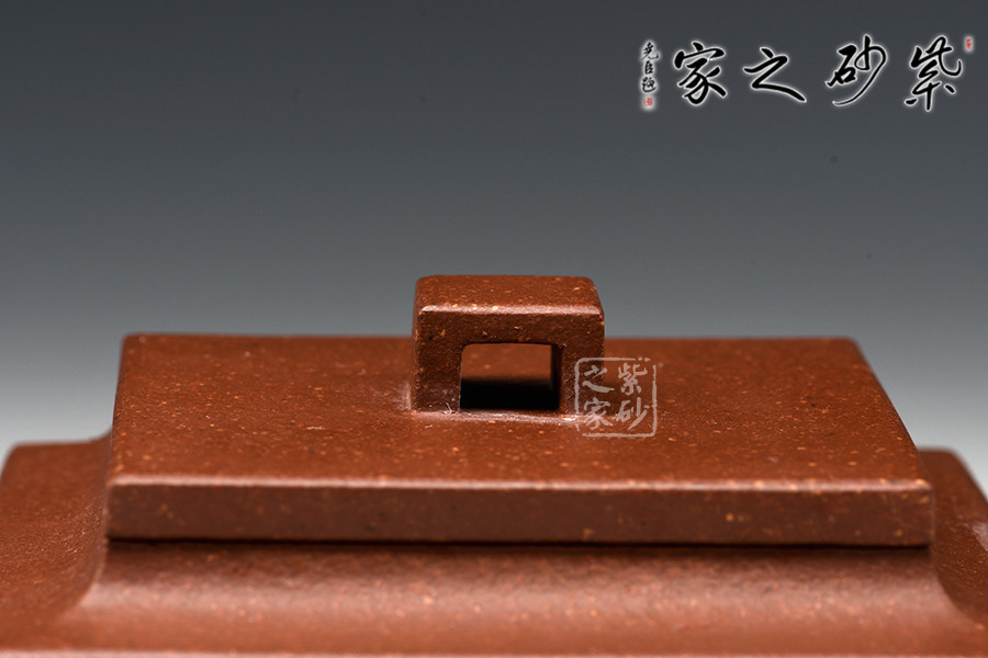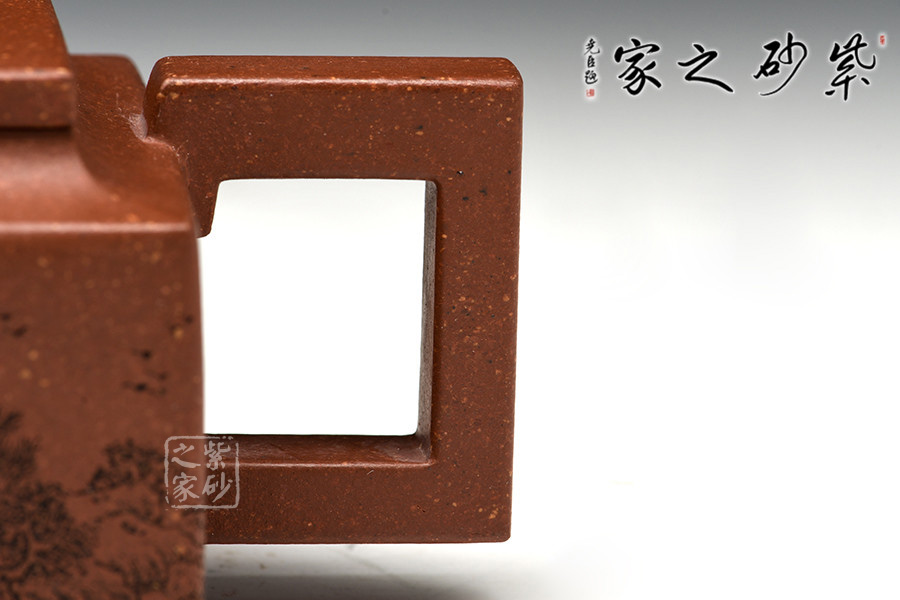 壺身為長方形,壺蓋與此相同,肩部過渡有線條清晰展示,愈發(fā)明了大氣。壺鈕為四方型,工整自然。壺嘴雖然有粗細(xì)漸變,但同樣是四方外觀。與此對應(yīng),壺把的形態(tài)也是筆挺大氣,整壺透露剛毅之氣。