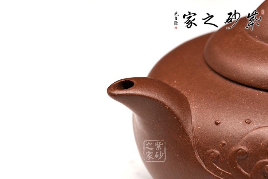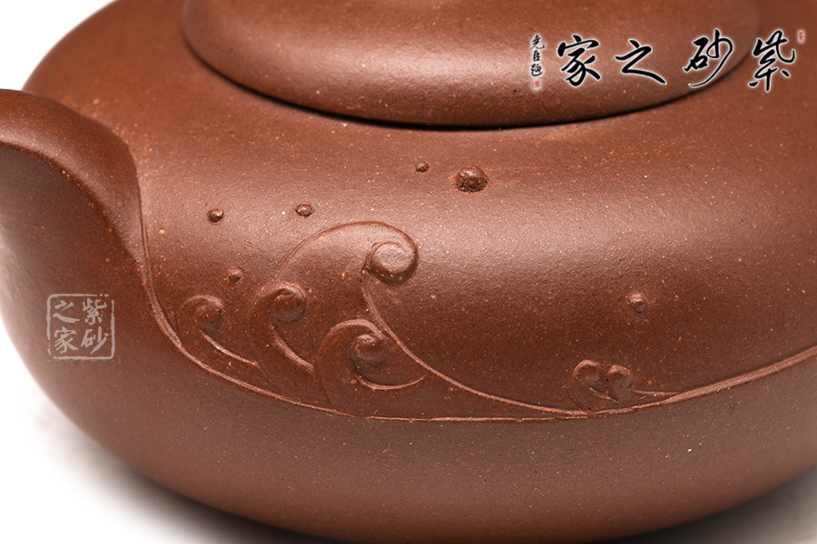 此作最吸引人之處在于壺身上的紋路裝飾,觀之富貴大氣,呈祥如意,對應“紫氣東來”,顯此壺之別樣風韻。